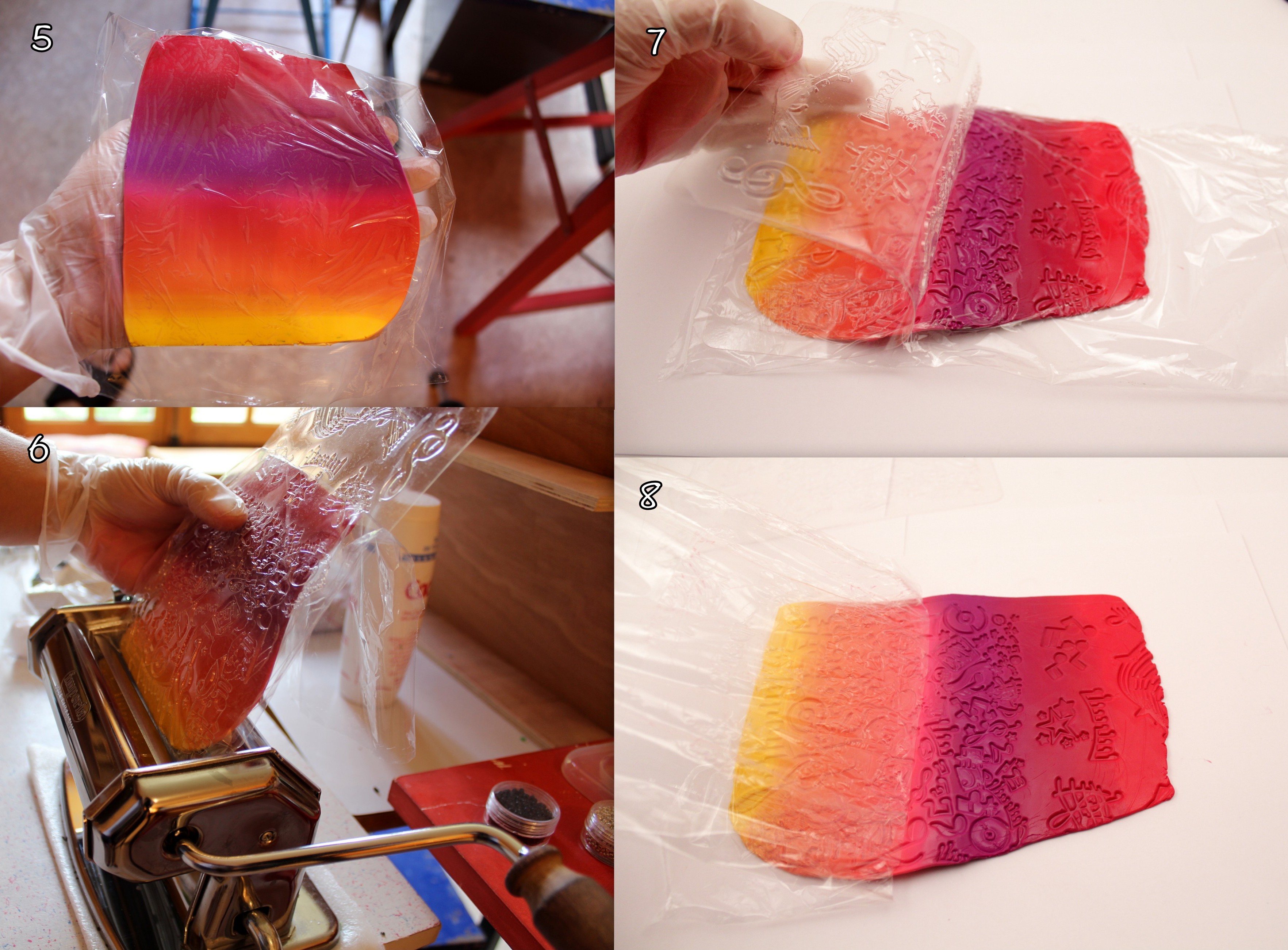 Vous pouvez appliquer le motif de votre plaque en pressant légèrement et en unifiant avec un rouleau, cela dit, je préfère utiliser la machine à pâte qui permet des sillons plus profonds et plus réguliers. Pour cette seconde méthode, il est préférable d’insérer une feuille de film étirable entre votre plaque dégradée et le plastique texturé afin d’éviter de se battre avec la matière au moment du démoulage (photos 5 à 8). Ici, j’ai choisi d’appliquer la plaque de texture pour que le motif soit imprimé en creux.