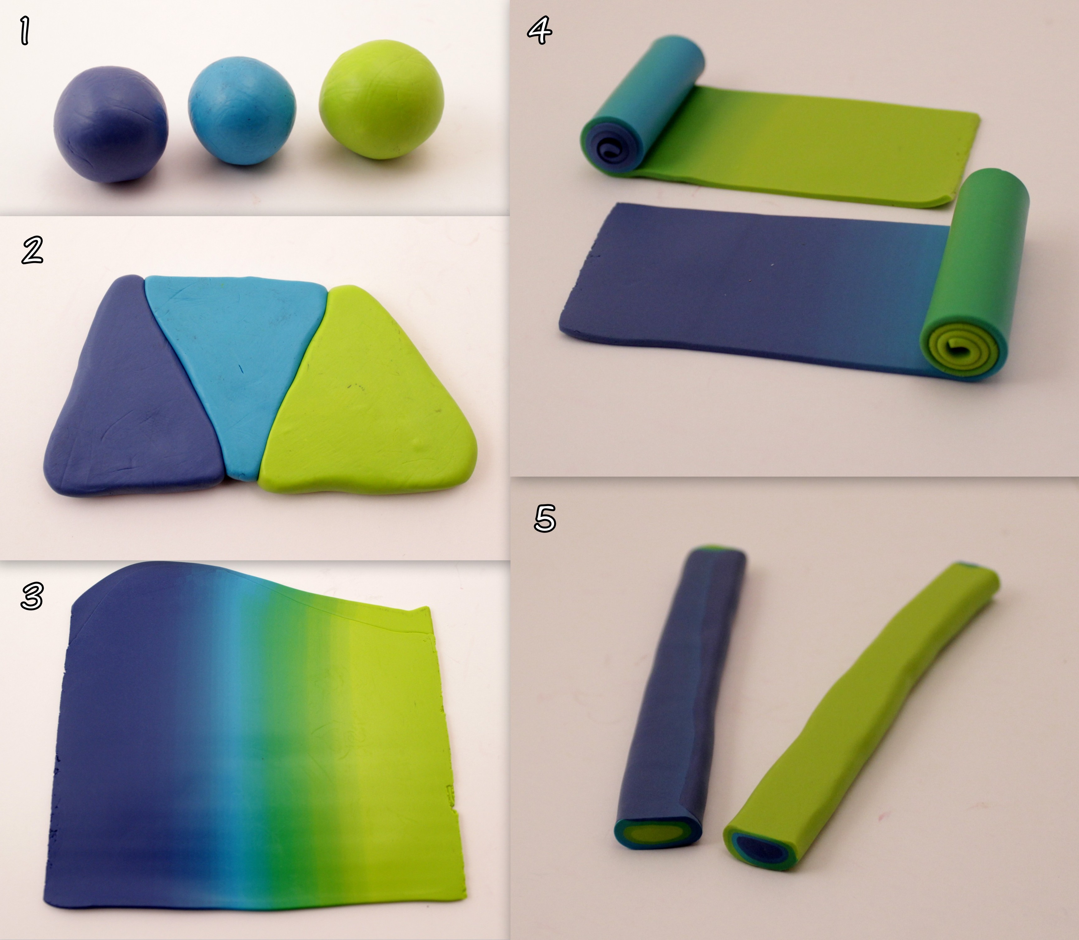Première étape, comme toujours, réaliser une plaque dégradée afin d’avoir une cane dégradée depuis le cœur. Ici, j’ai volontairement coupé ma plaque en deux morceaux afin d’avoir deux canes inversées (photos 1 à 4).