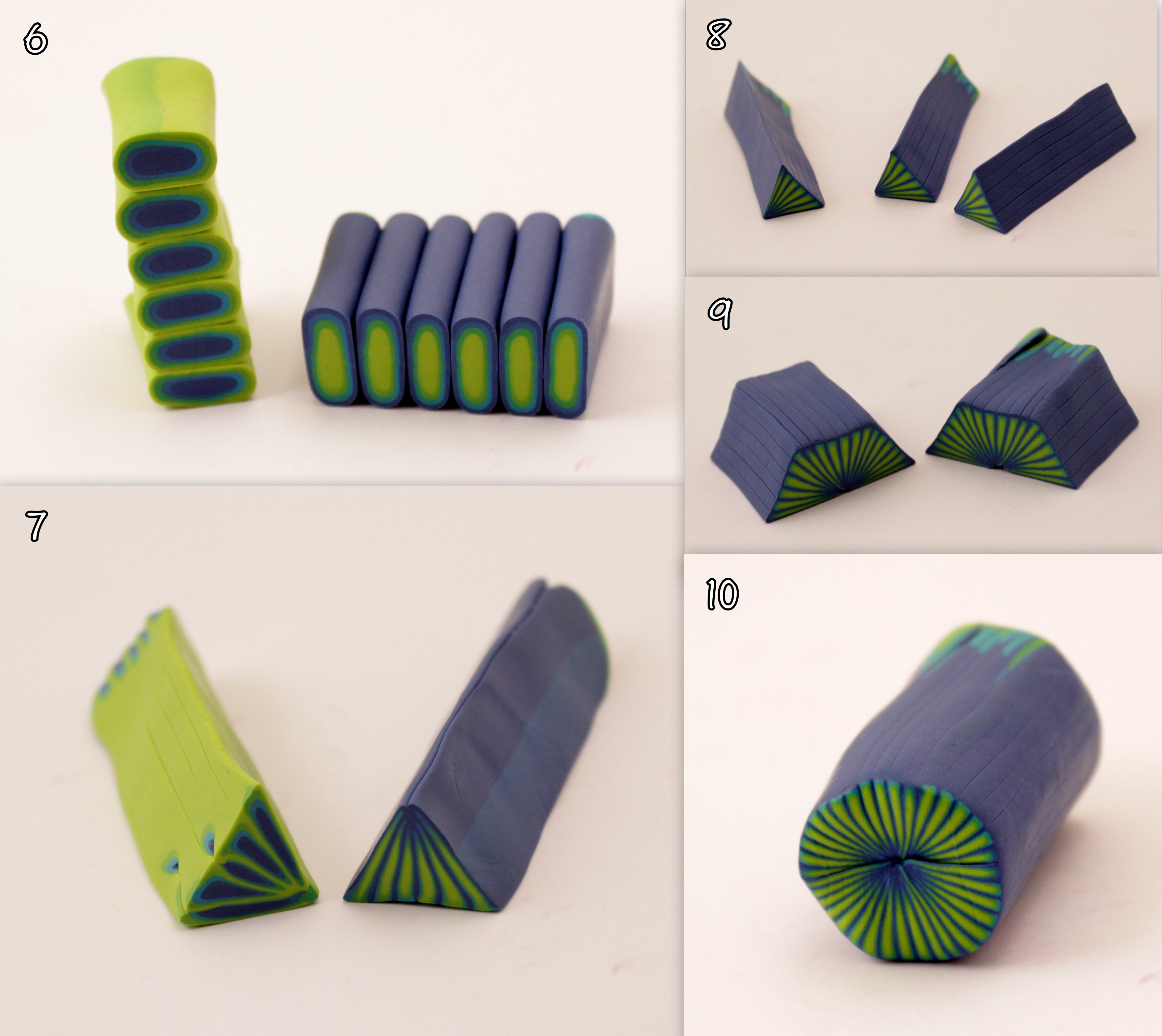 Écrasez légèrement chacune des canes de façon régulière (photo 5) et coupez-les en tronçons égaux (photo 6). Superposez ces derniers et écrasez le tout en appuyant plus fortement d’un côté afin d’obtenir une cane triangulaire comme représentée sur la photo 7.