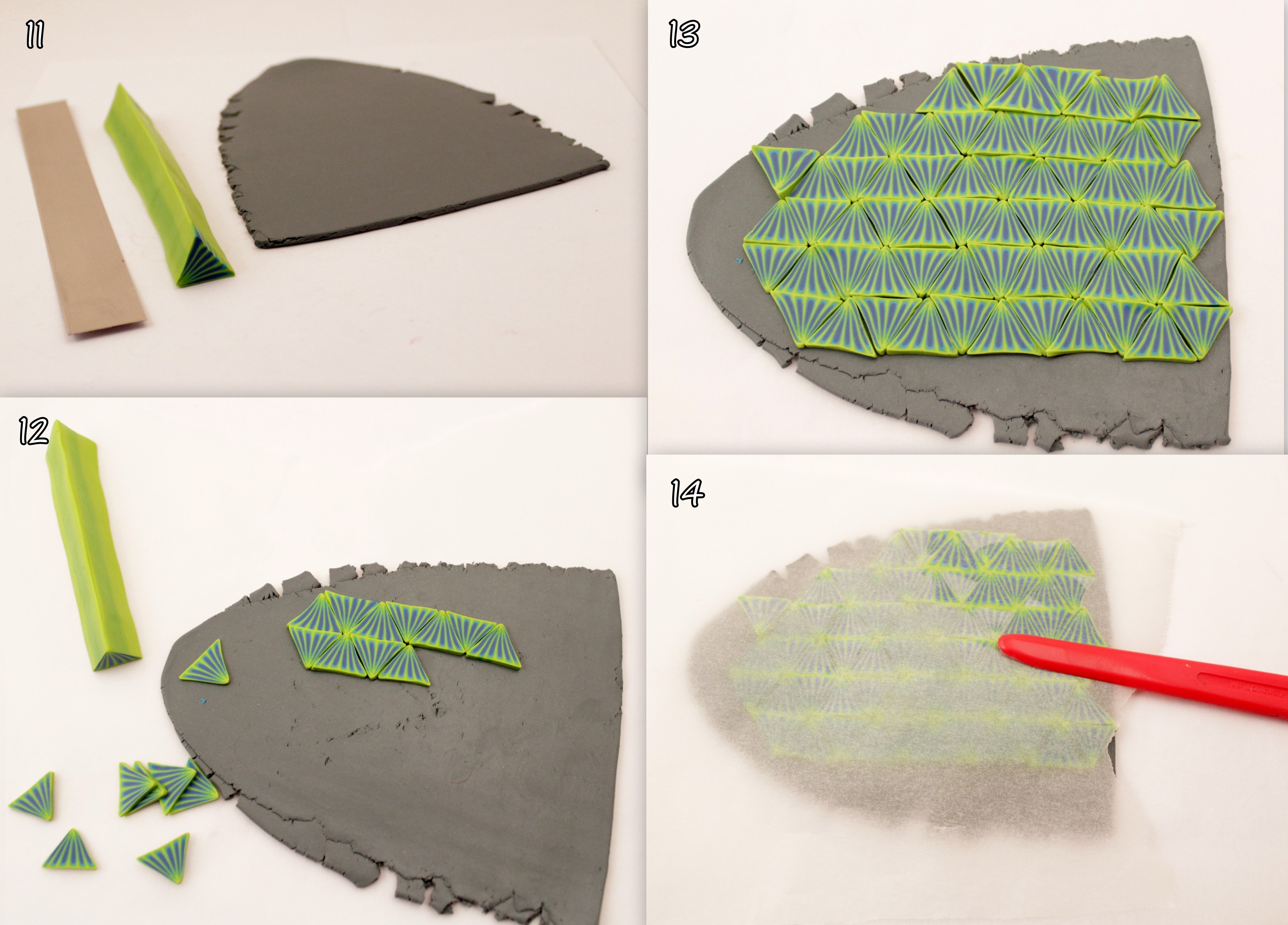 La seconde cane triangulaire laissée de côté va servir complètement autrement. Pour cela, munissez-vous de votre lame et préparer une plaque unie qui sera le dos de vos perles (photo 11). Découpez des tranches fines et régulières et posez-les sur la plaque unie comme sur les photos 12 et 13. Une fois une assez grande surface recouverte, saisissez une feuille de papier sulfurisé et lisser toutes les aspérités (photo 14).