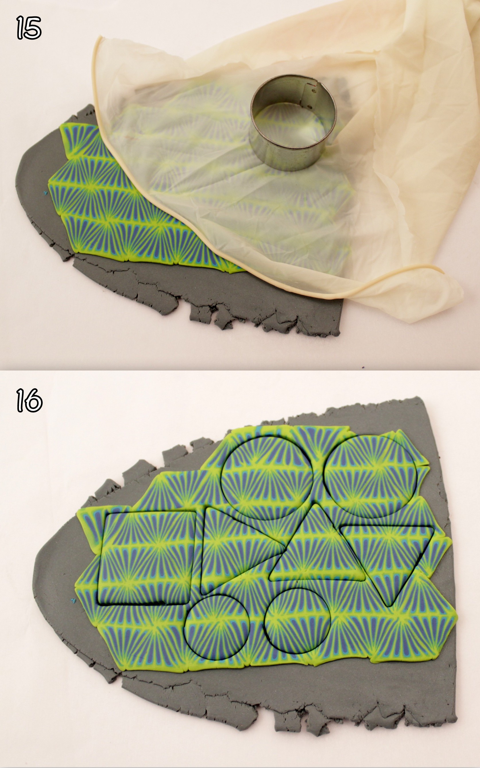 Maintenant que votre plaque est prête, prenez un gant en latex et découpez-le, il vous permettra de retirer les emporte-pièces sans déformer votre perle (photo 16). Découpez les perles de votre choix que vous percerez, comme toujours, de préférence après cuisson.
