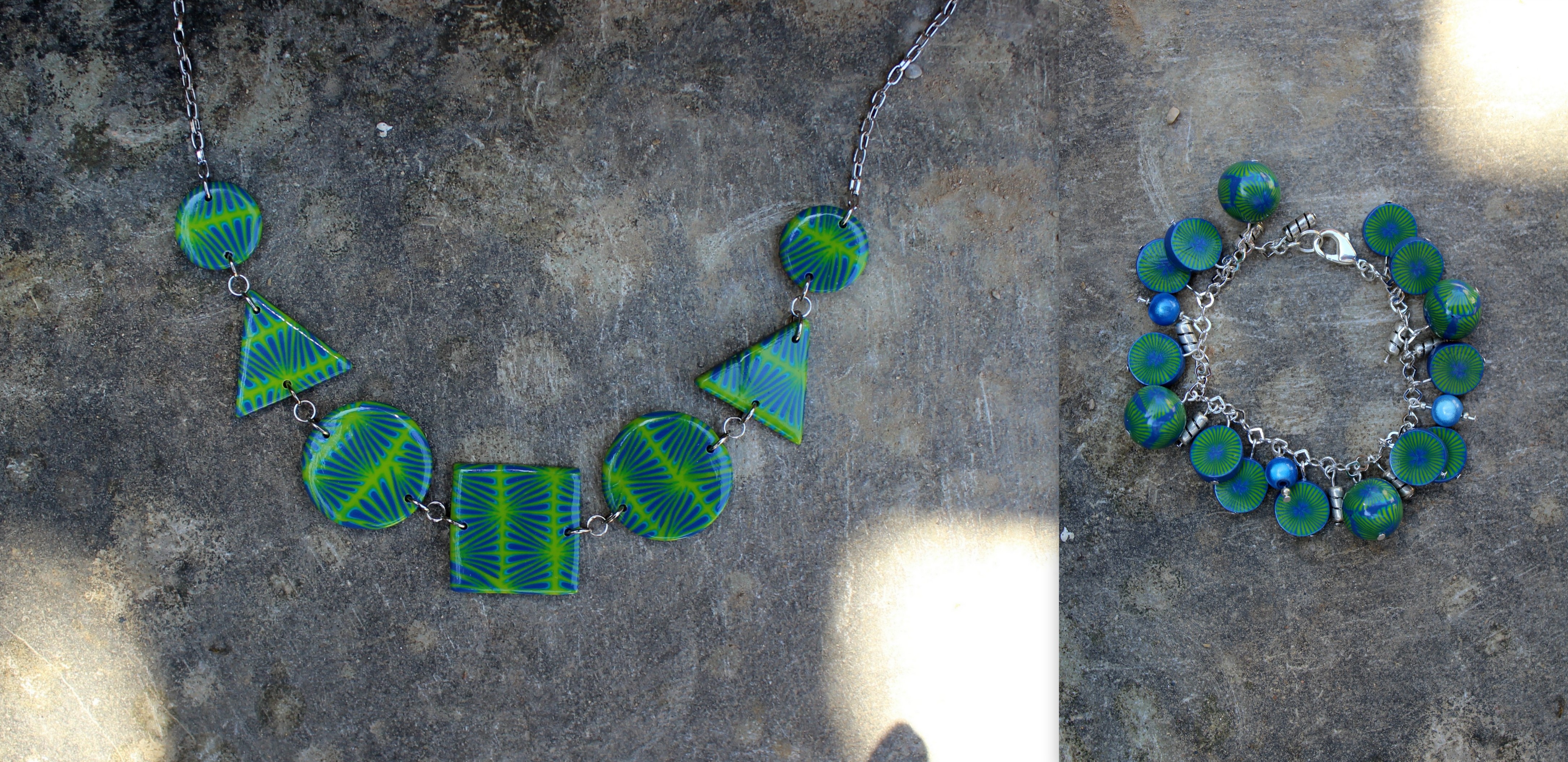 Aujourd’hui, tuto fimo ! Pour rester dans les leçons de base, je vous détaille aujourd’hui une cane très utile et que j’appelle « la cane Iris ». Je vais décliner cette cane en deux usages afin de réaliser ce collier et ce bracelet. Alors hop hop, on prend son matériel et on y va.