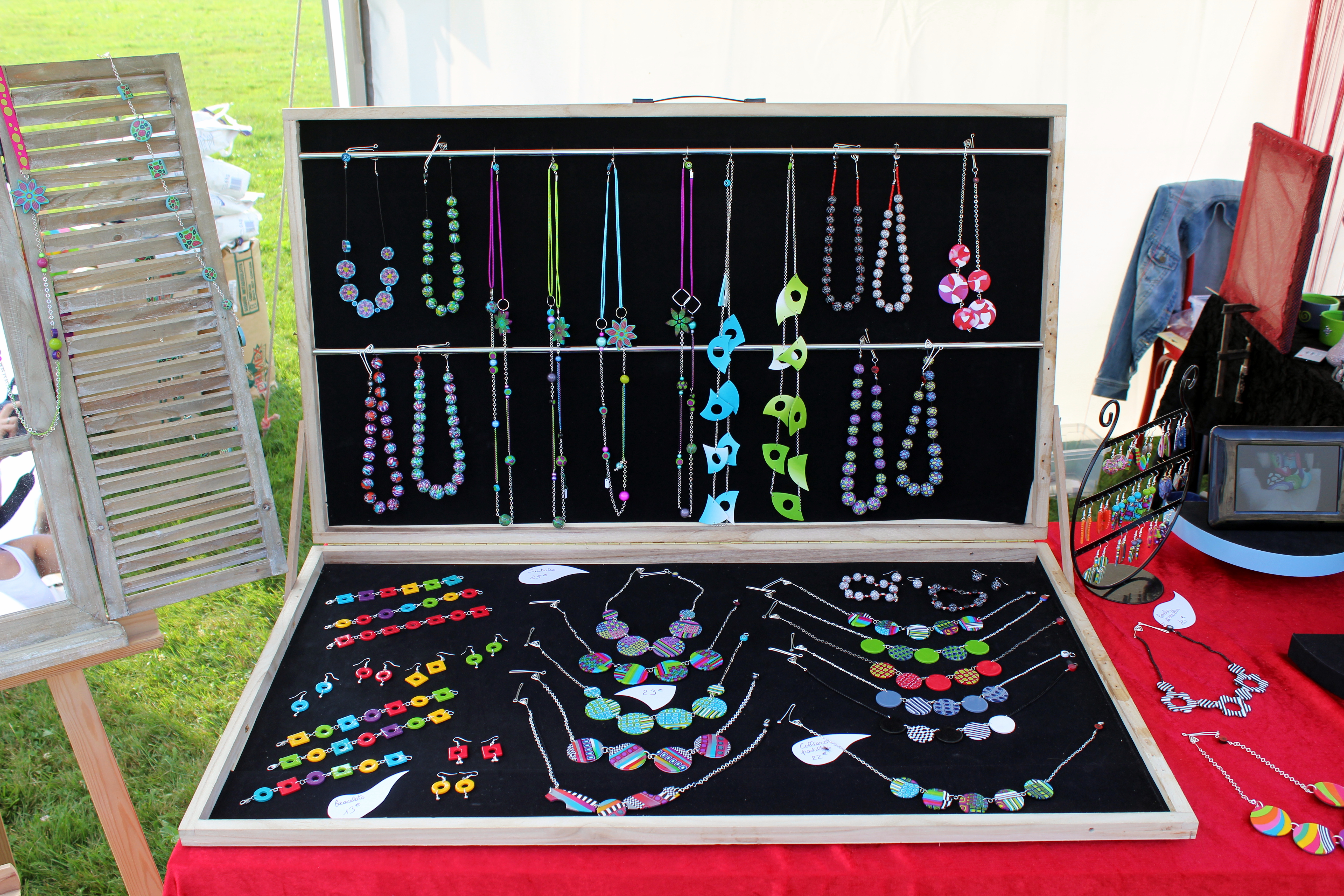 Pour mon dernier marché d’art et d’artisanat (à Ornans, dans le Doubs), je me suis enfin fabriqué une mallette d’exposition de bijoux à partir d’une table de tapissier. J’ai dévissé les charnières du petit côté et j’en ai remonté une grande sur le long côté. Après ça, j’ai percé des trous destinés à recevoir les deux baguettes métalliques qui supporteront les colliers et j’ai recouvert le fond de ma nouvelle valise de velours noir auto-collant. Et voilà le résultat ! Simple et incroyablement pratique !
