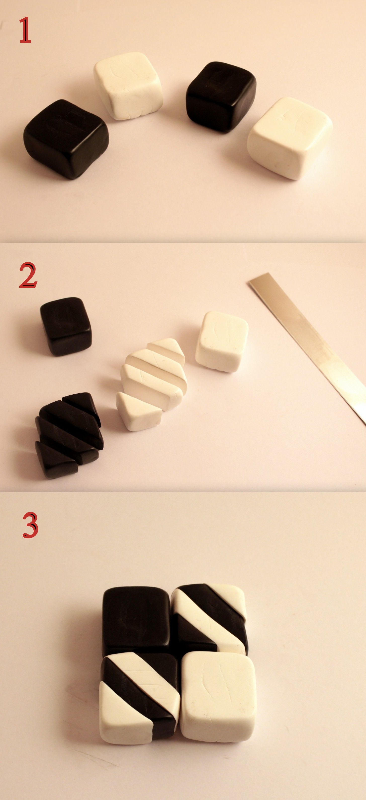 Commencez par former quatre cubes de la même taille, deux noirs et deux blancs. (photo 1)