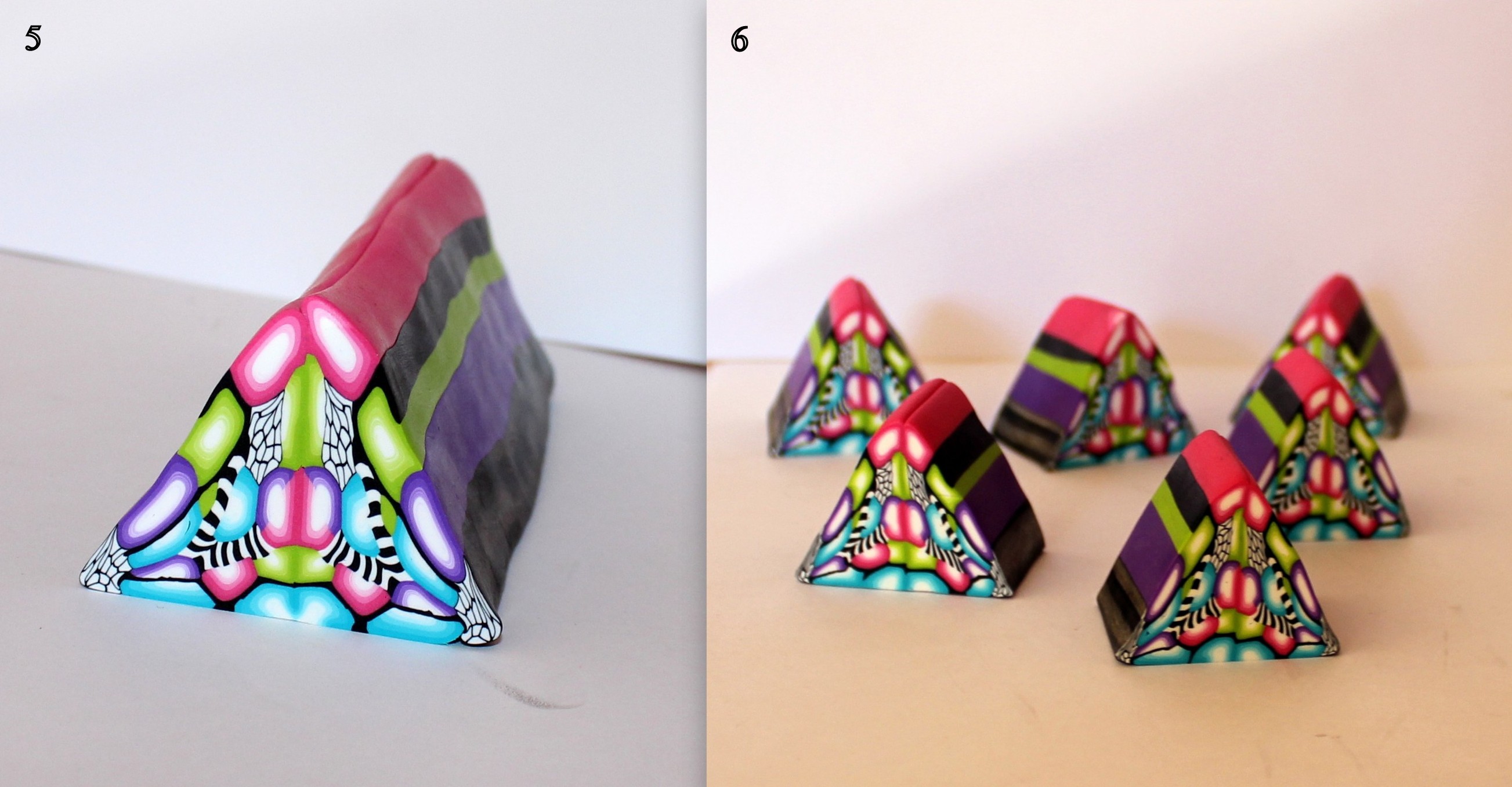 Une fois votre cane aussi régulière qu’un toblerone, (photo 3) étirez-la afin de pouvoir la couper en deux. Assemblez les deux morceaux de façon à reformer une nouvelle cane à section triangulaire comme sur la photo 5 et étirez-là de nouveau jusqu’à pouvoir en couper 6 tronçons réguliers.