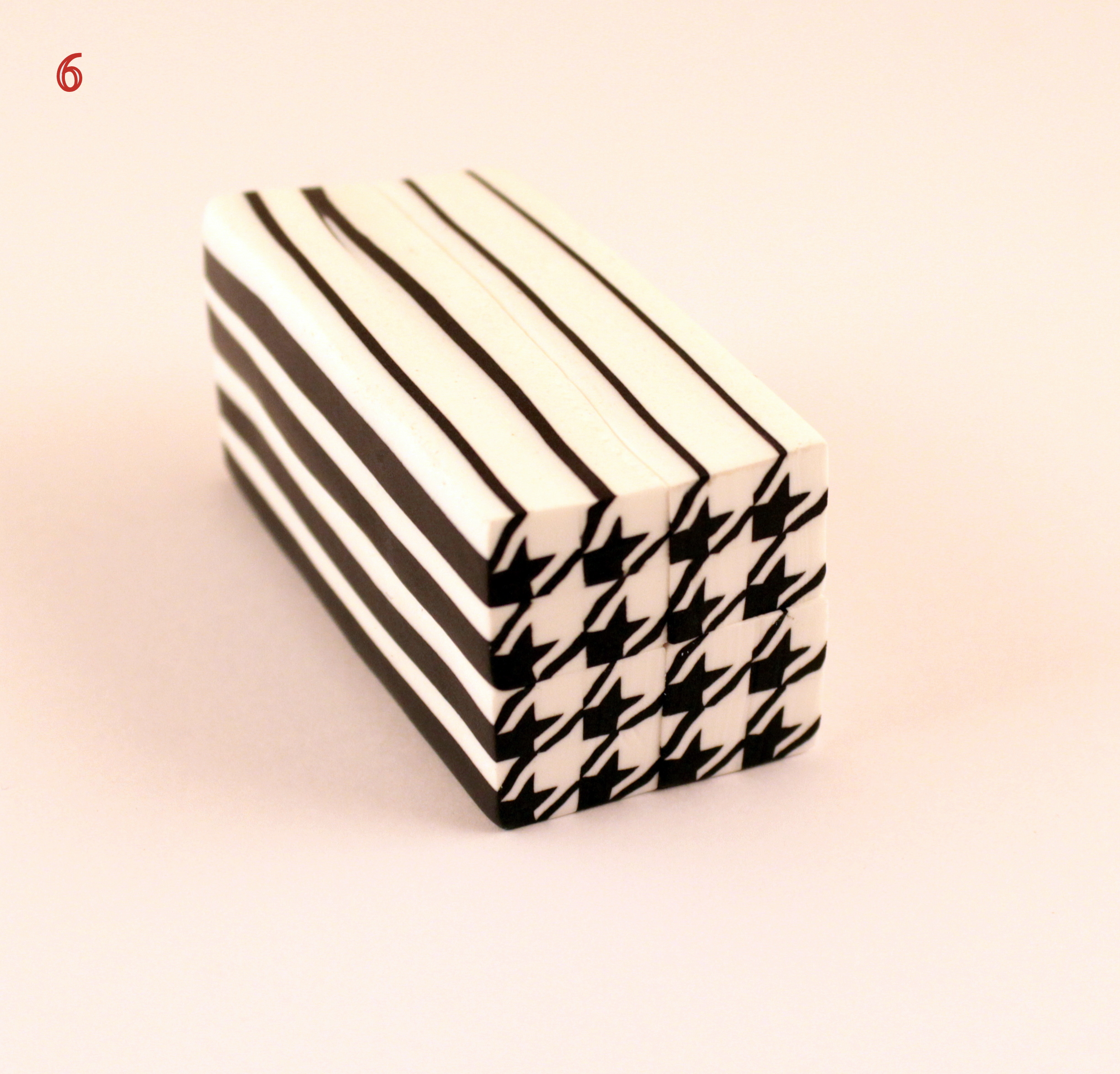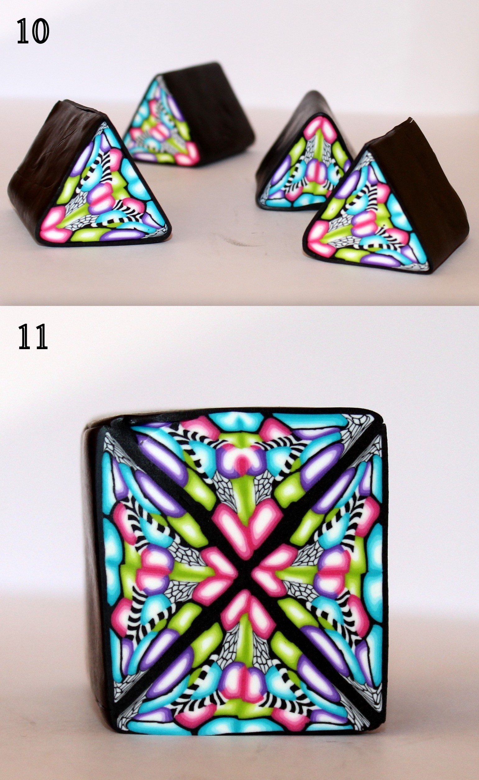 Étirez et modelez ce cube nouvellement formé jusqu’à obtenir une cane de section carrée que vous couperez en quatre segments. (photo 4)