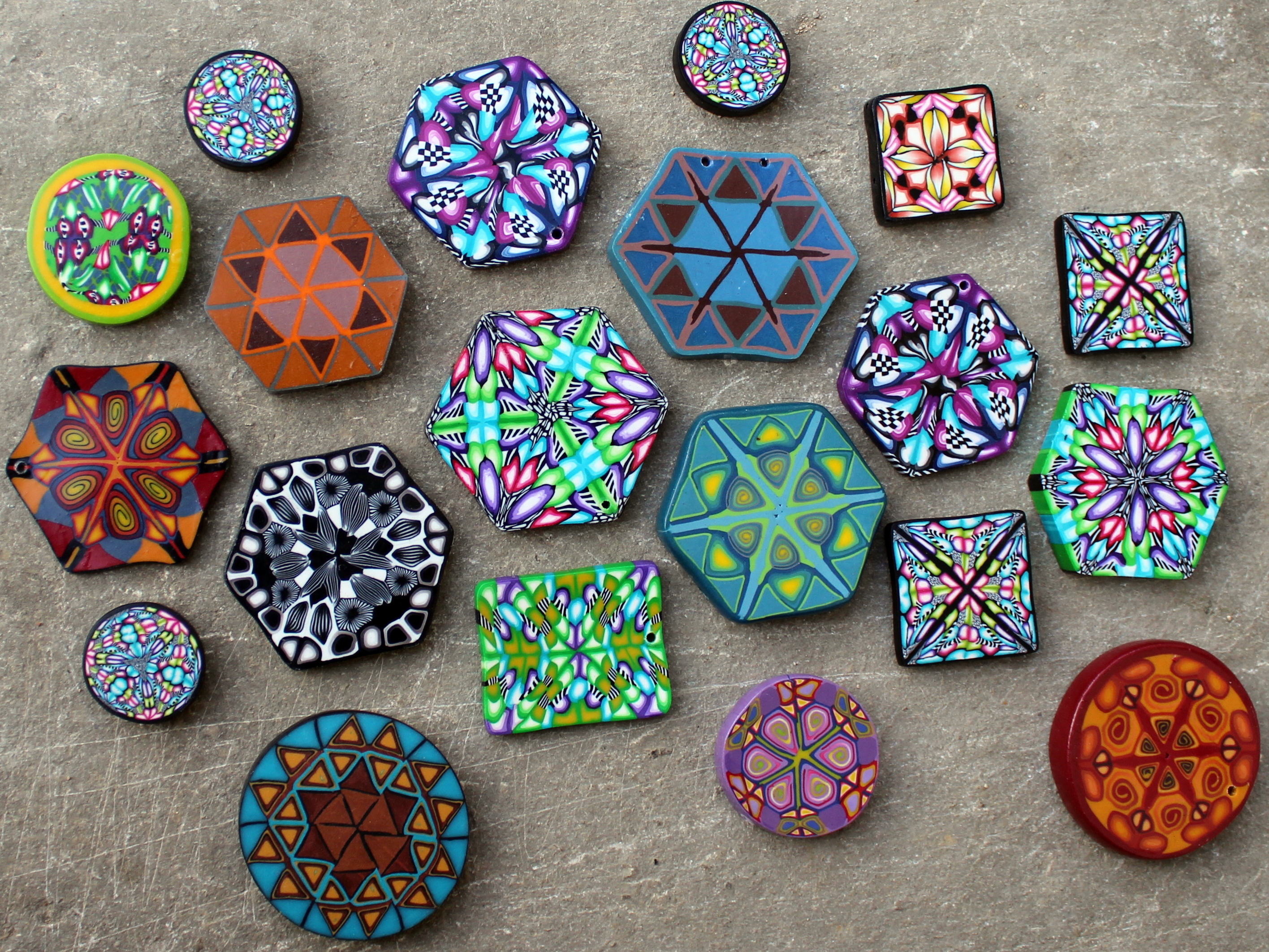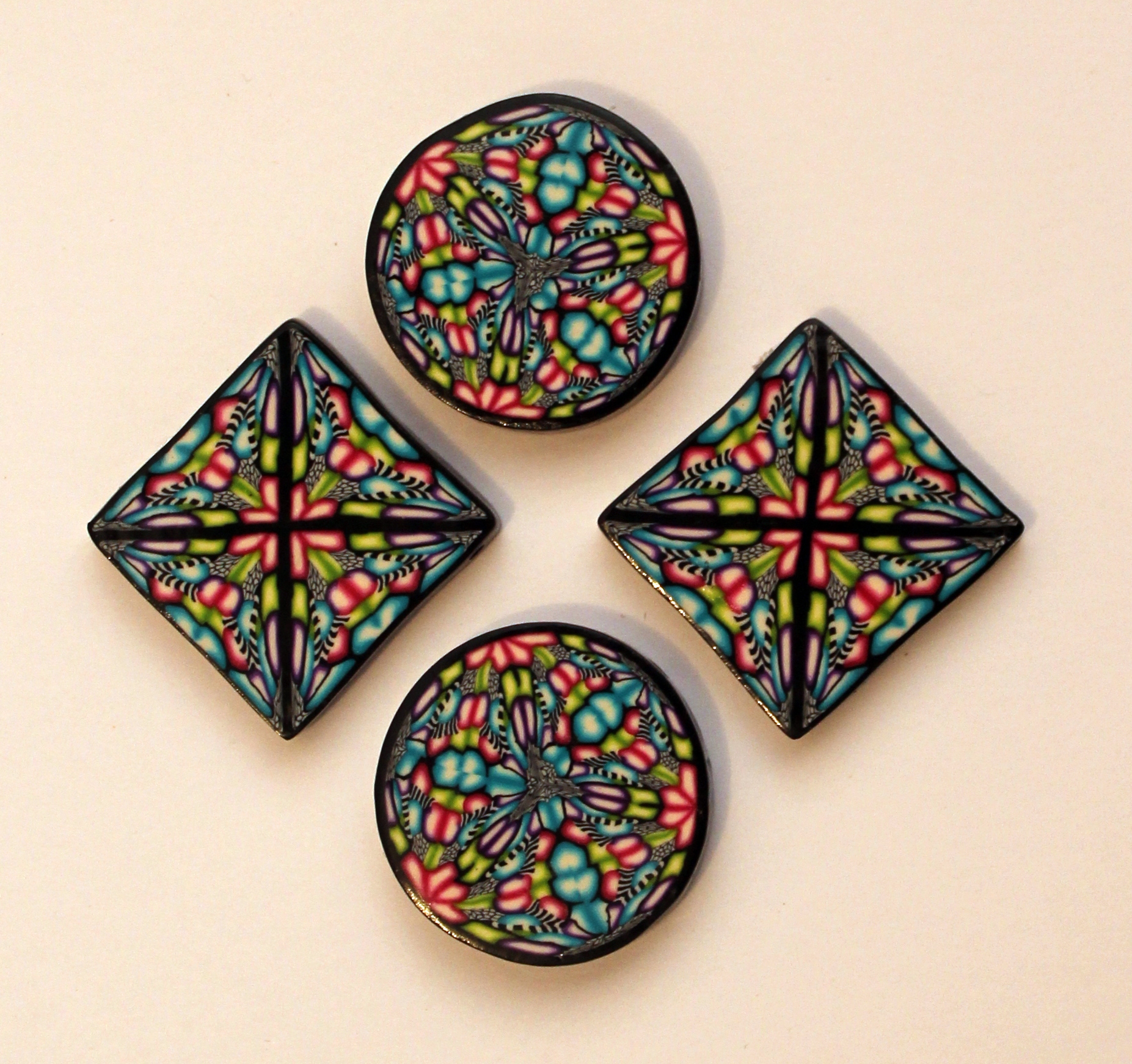 Et voilà un exemple de pièces réalisées à partir des canes dont j’ai montré la technique de fabrication dernièrement. Les bracelets sont montés sur élastique et les perles du collier ont été réalisées à partir de tranches de canes appliquées sur des petites boules de pâte crue.
