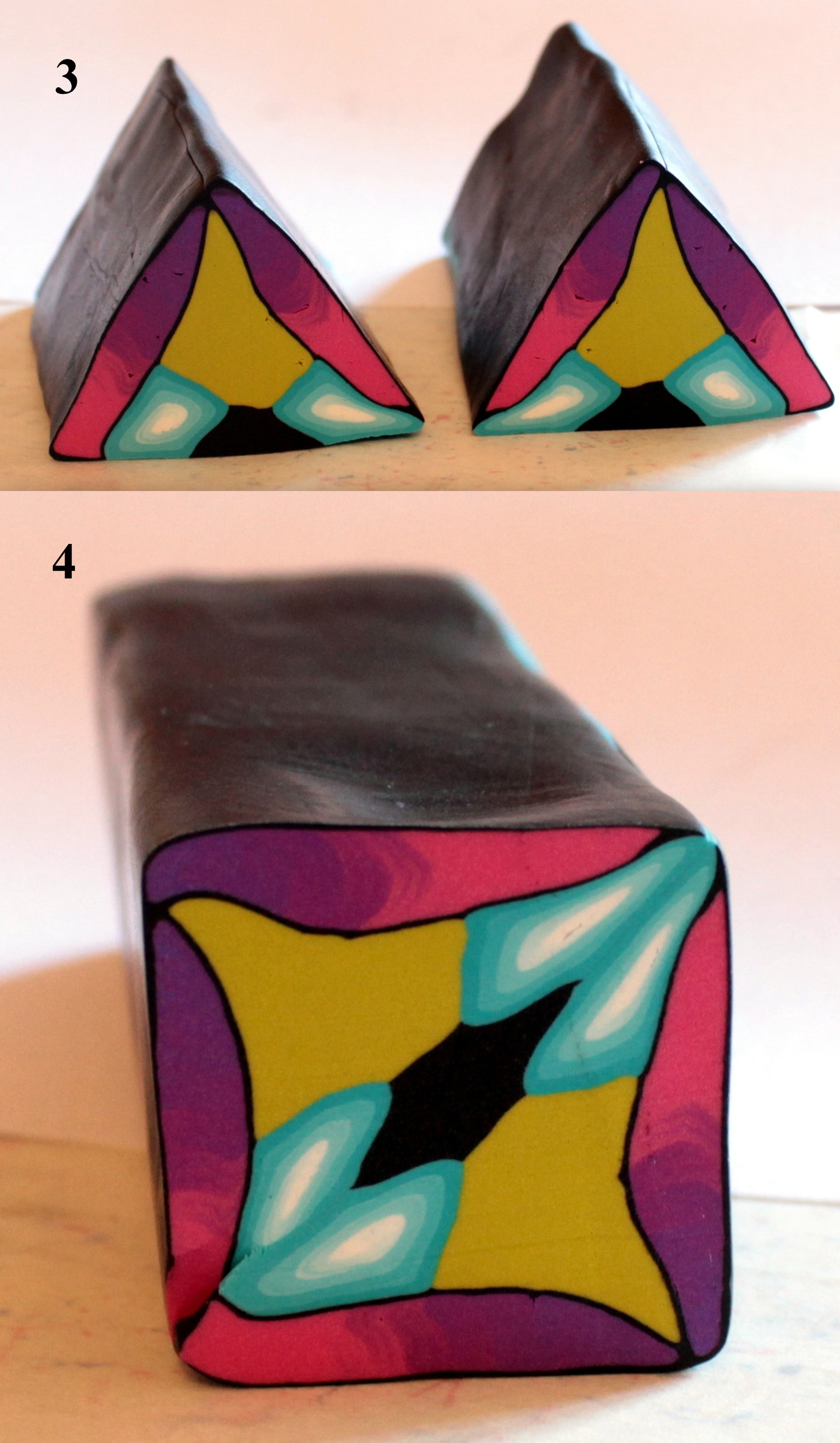 Photo 3 : Coupez la cane à section triangulaire en deux morceaux et assemblez-les de sorte à former une cane carrée, comme sur la photo 4. Étirez de nouveau sans déformer la cane.