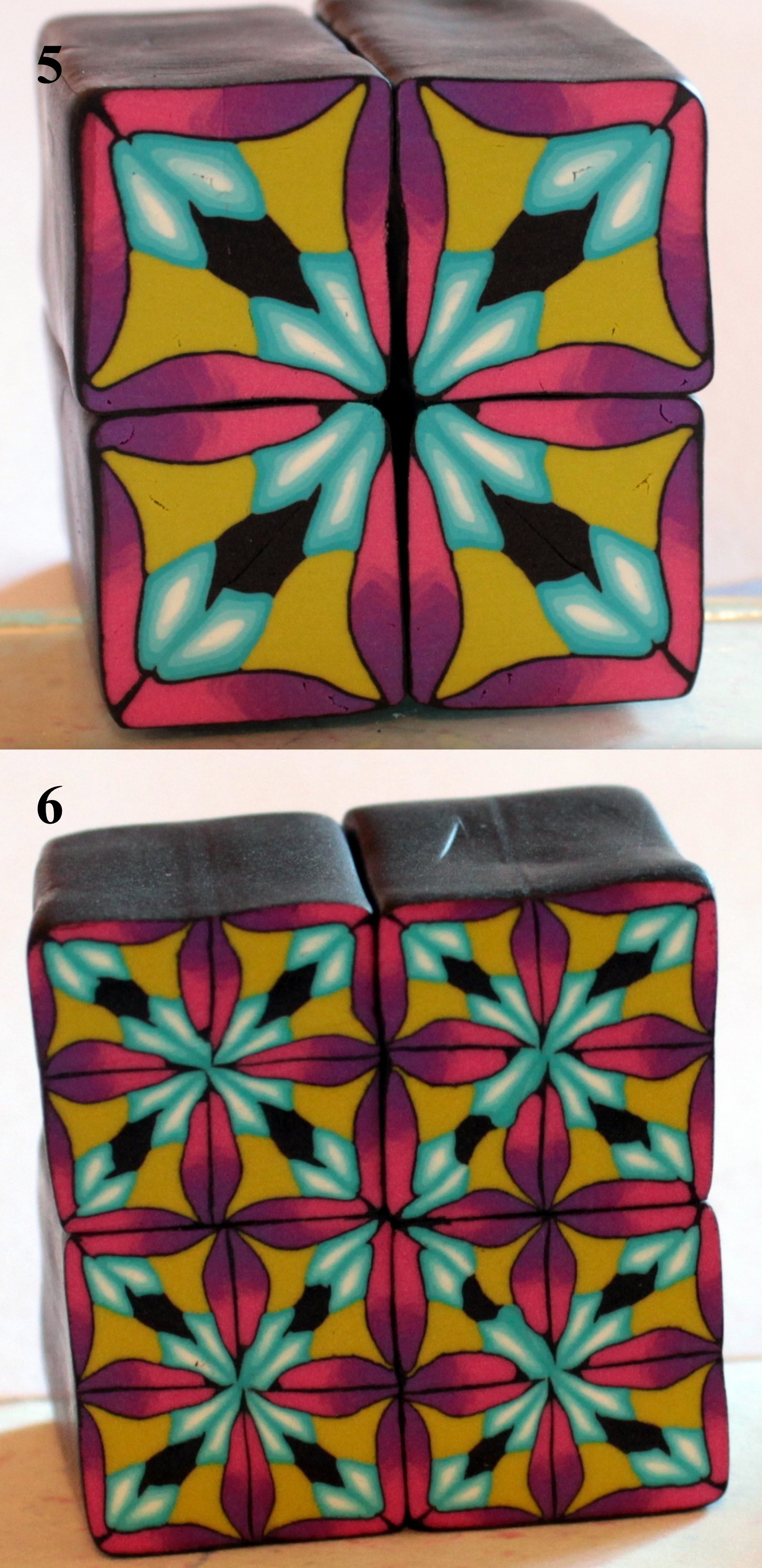 Ces canes roses et violettes ont été cerclées de noir et étirées en amande. J’ai ensuite assemblé mes canes dégradées ajoutées à une plus petite cane carré noire et une autre couleur (ici vert pomme) comme sur la photo.