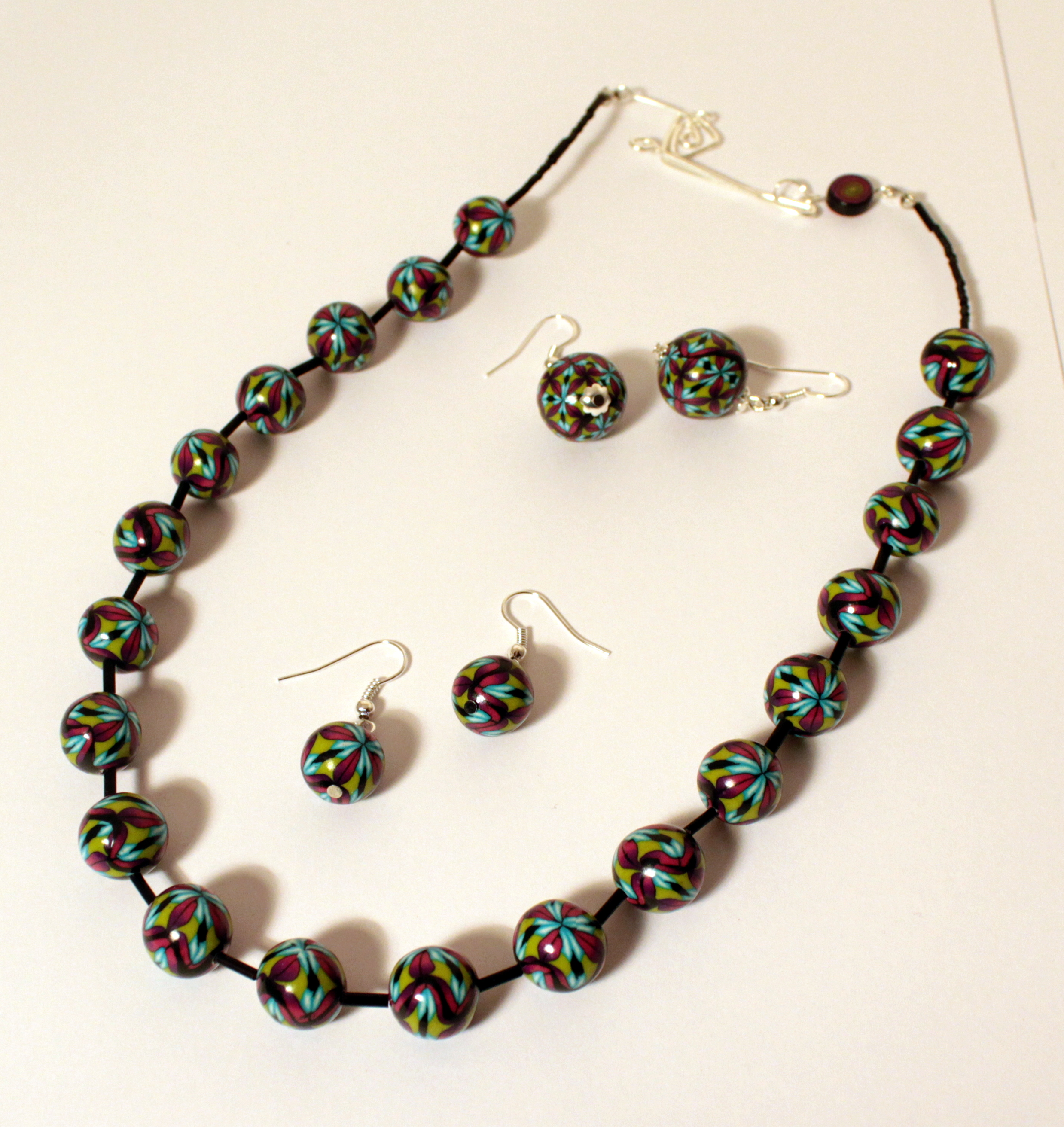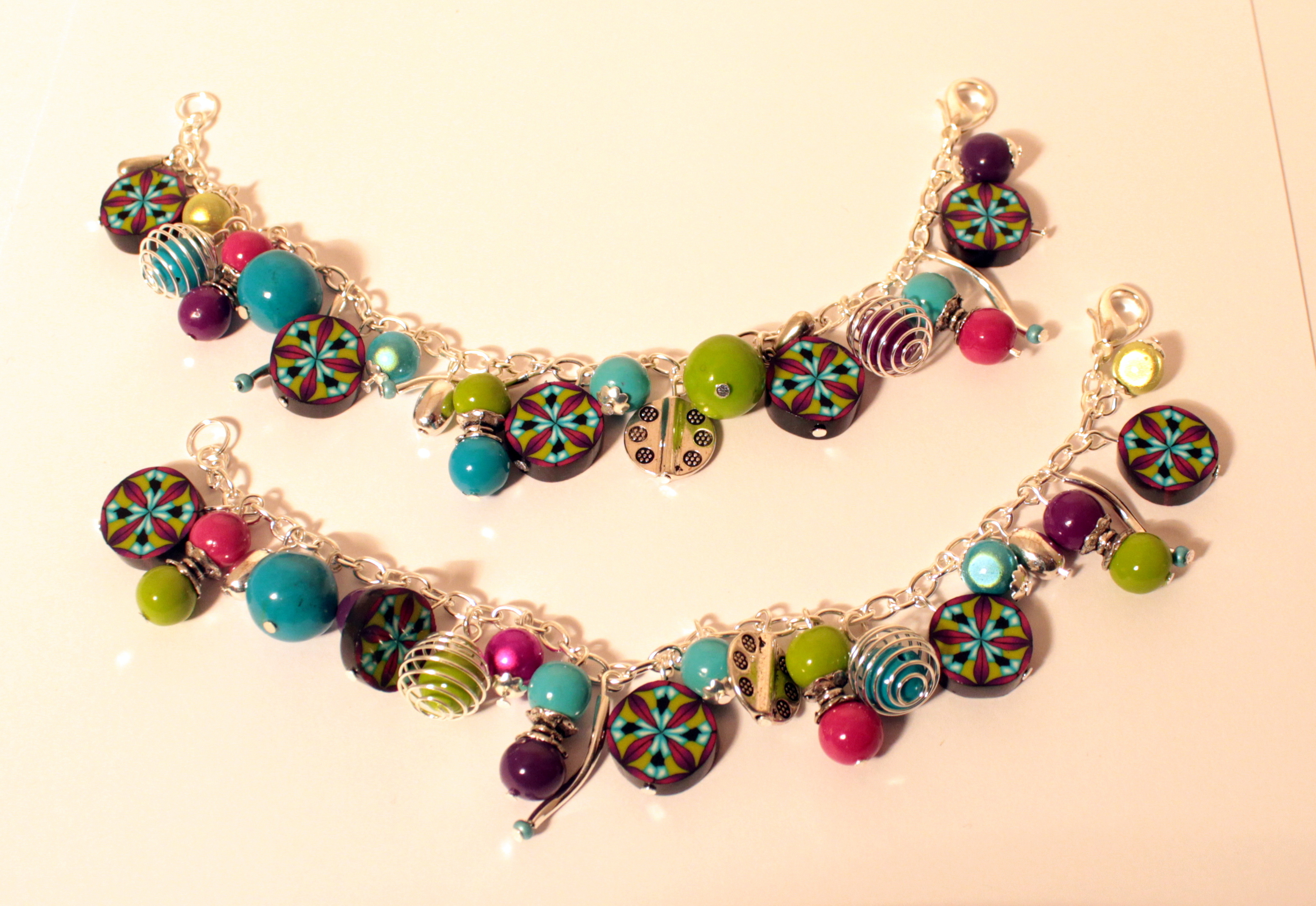 Et voilà ! Encore une cane à effet fou qui se révèle assez simple à réaliser. Vous pouvez la laisser en section carrée ou la faire rouler pour en faire des tranches rondes comme je l’ai fait pour les bracelets breloques ; vous pouvez également couper des tranches très fines et en recouvrir des petites boules de pate crue comme je l’ai fait pour le collier. Dans tous les cas, n’oubliez pas de laisser vos canes au moins une demi-heure au frigo afin de couper des tranches sans déformer le motif.