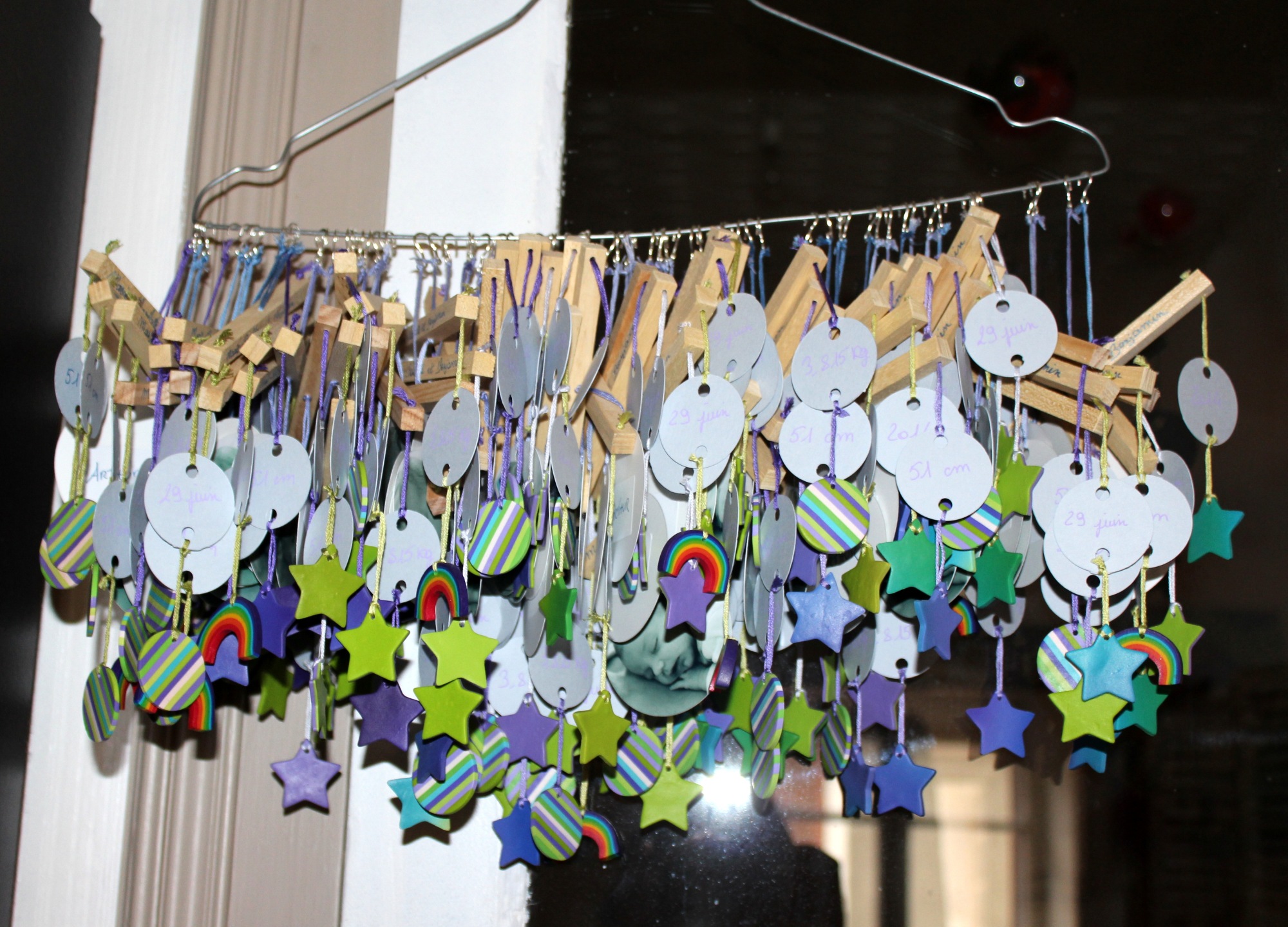 Il s’agit donc de petits mobiles entièrement fabriqués par nos petites mains et dans lesquels vous reconnaîtrez les petits arcs-en-ciel réalisés il y a 3 semaines.