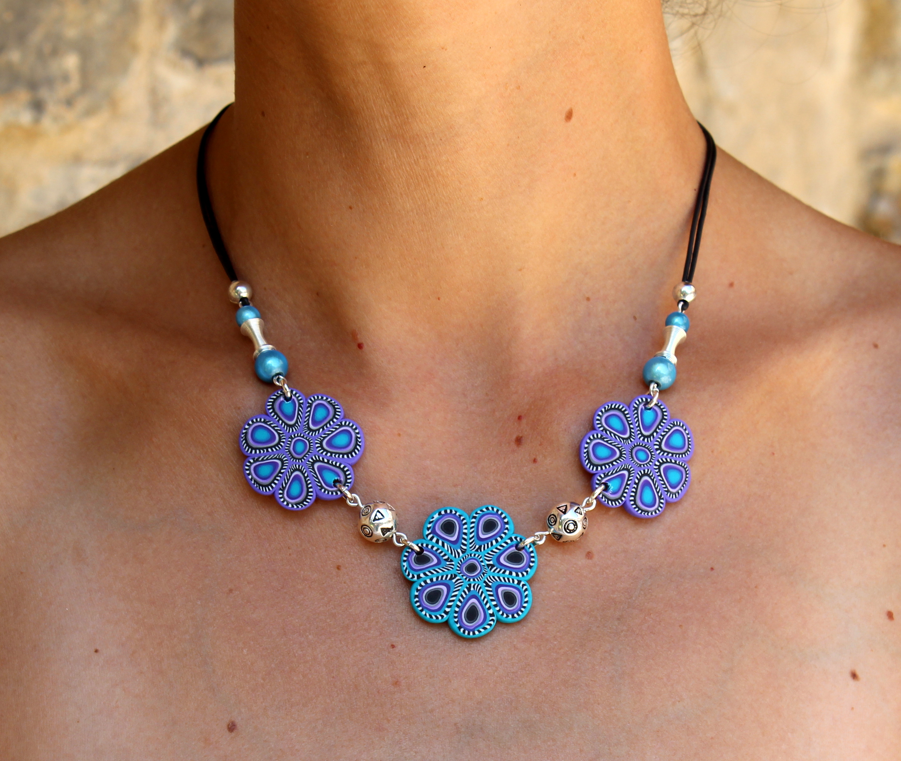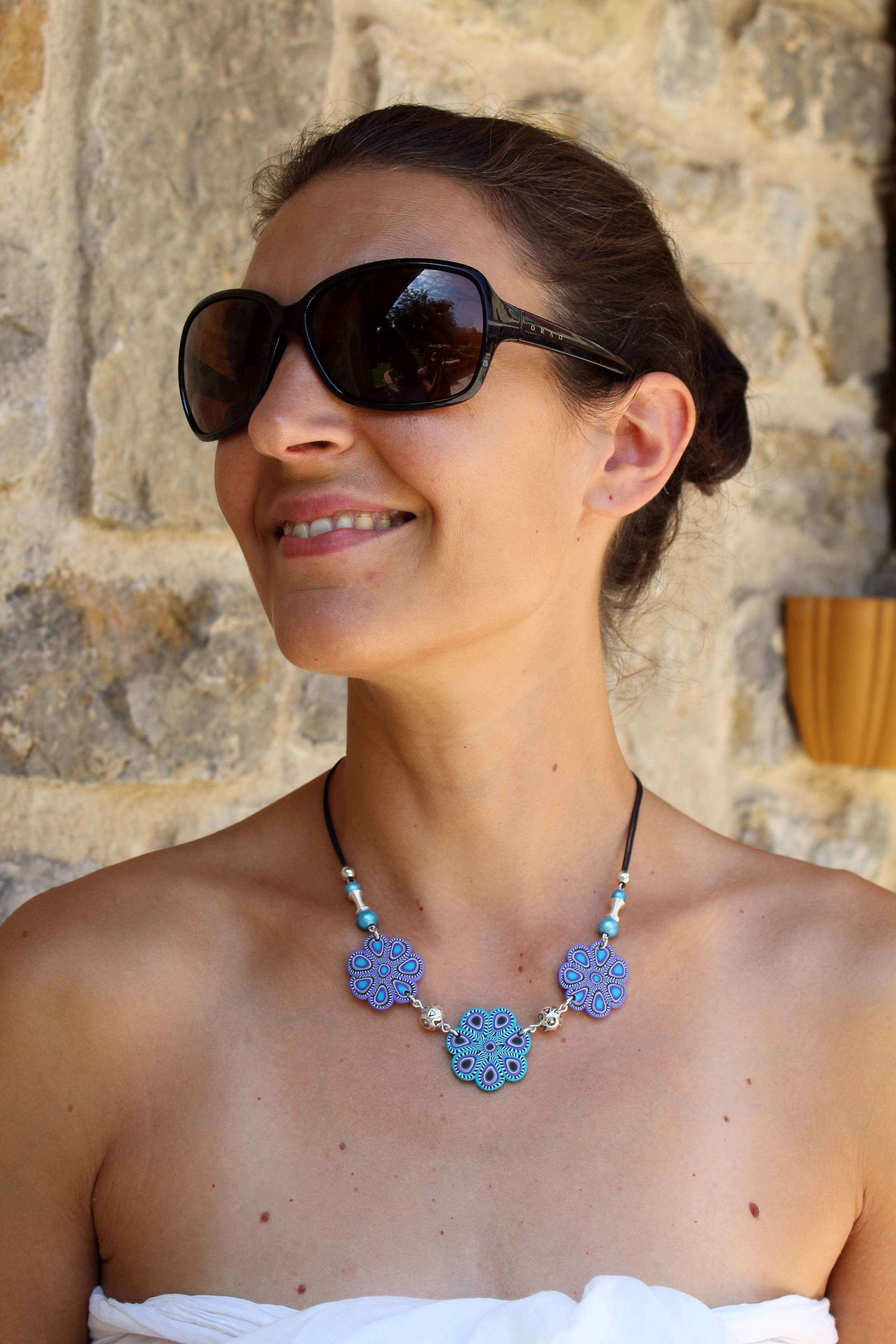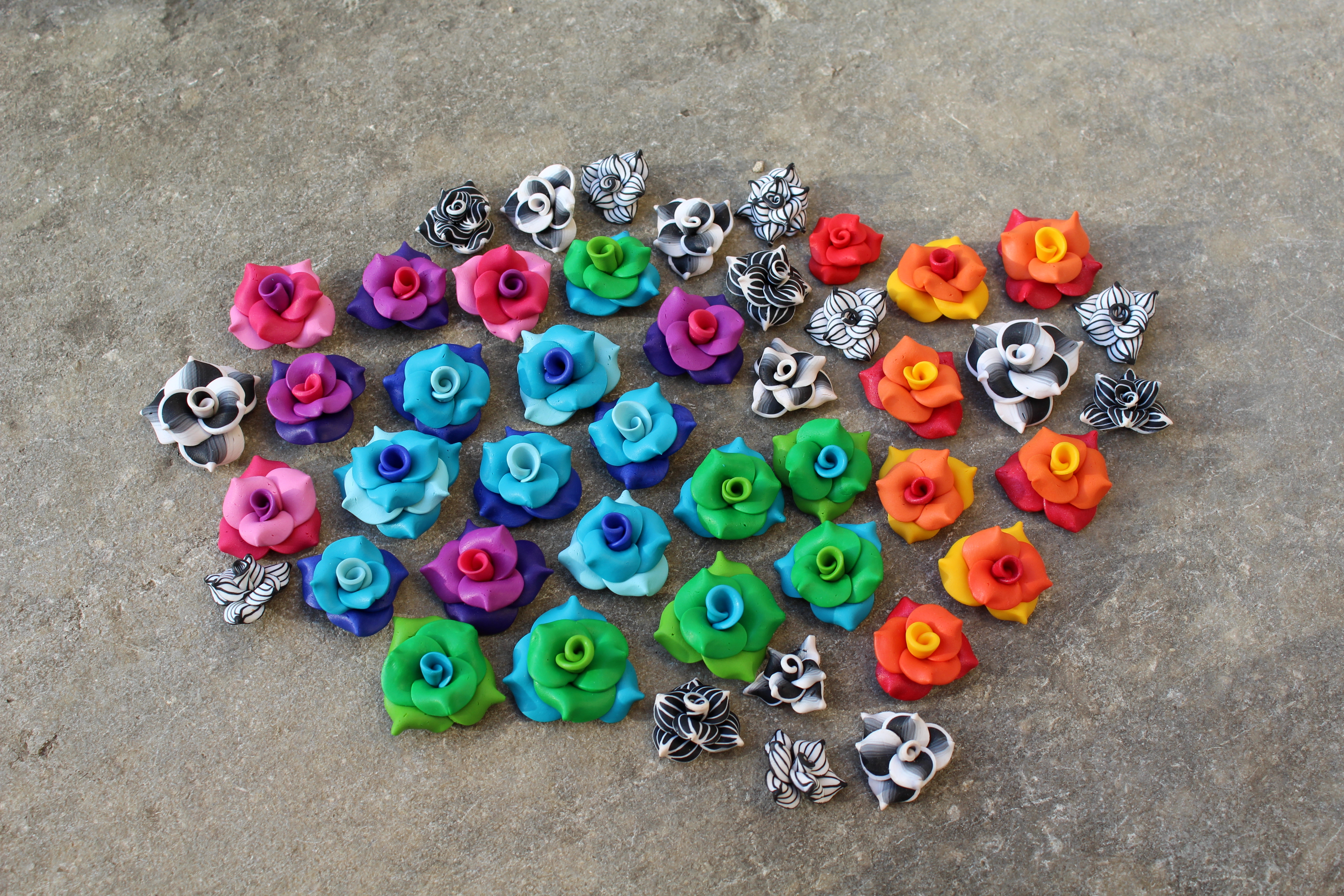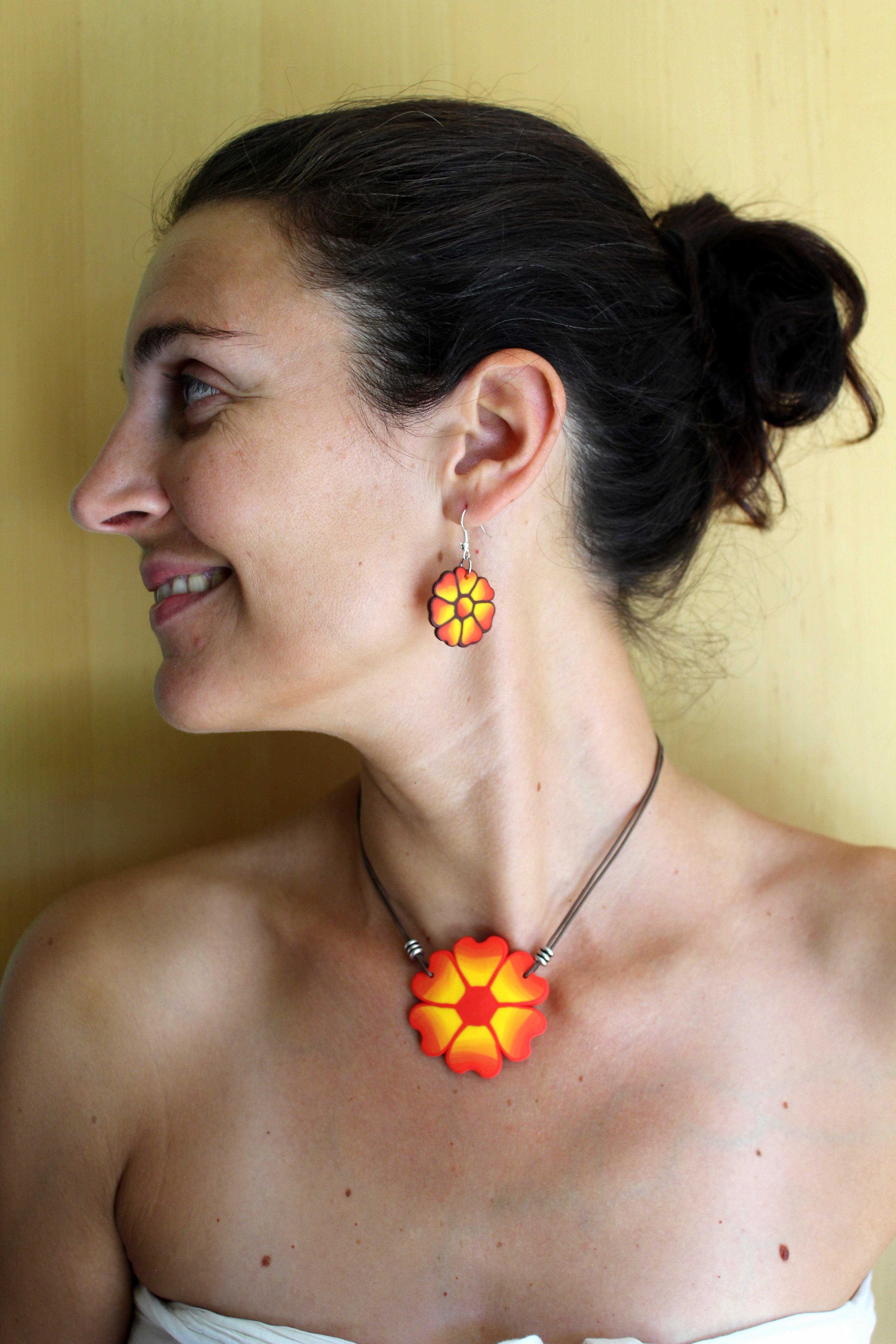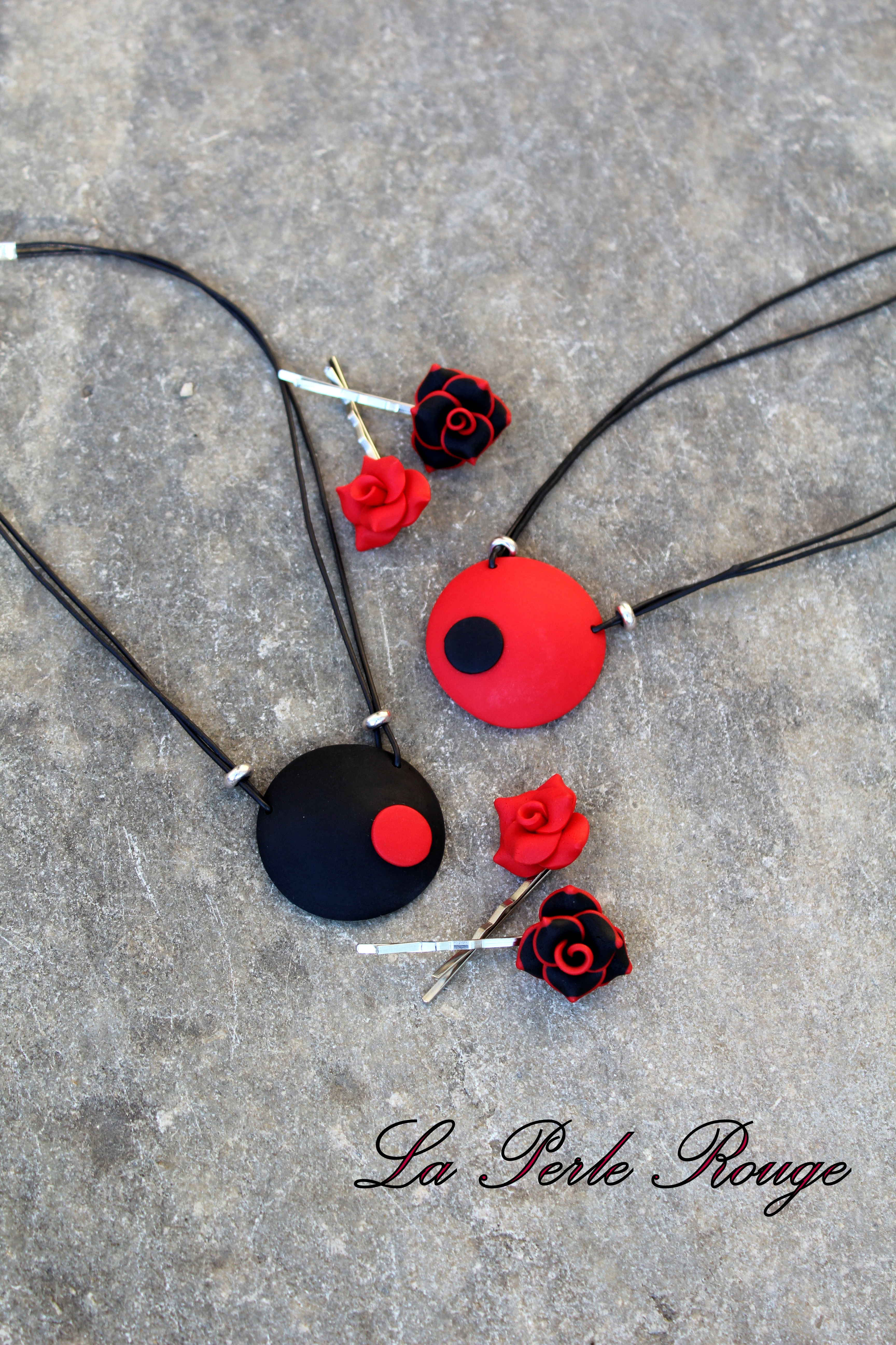 Pour l’occasion, et comme j’avais l’honneur d’être une des témoins de la mariée, (hé hé hé !) j’ai également fabriqué des parures simples pour l’autre témoin et moi qui étions habillées de la même façon, l’une en rouge et l’autre en noir. C’est là que je regrette de ne pas avoir pris le temps de poser avec elle une seconde, histoire de refaire la jaquette des « Demoiselles de Rochefort ». Heureusement, j’avais photographié les bijoux avant la cérémonie. Voilà : un pendentif simple et deux barrettes (toujours les mêmes fleurs !!! quand je vous dis qu’à présent je peux les réaliser les yeux fermés…). On était à croquer.
