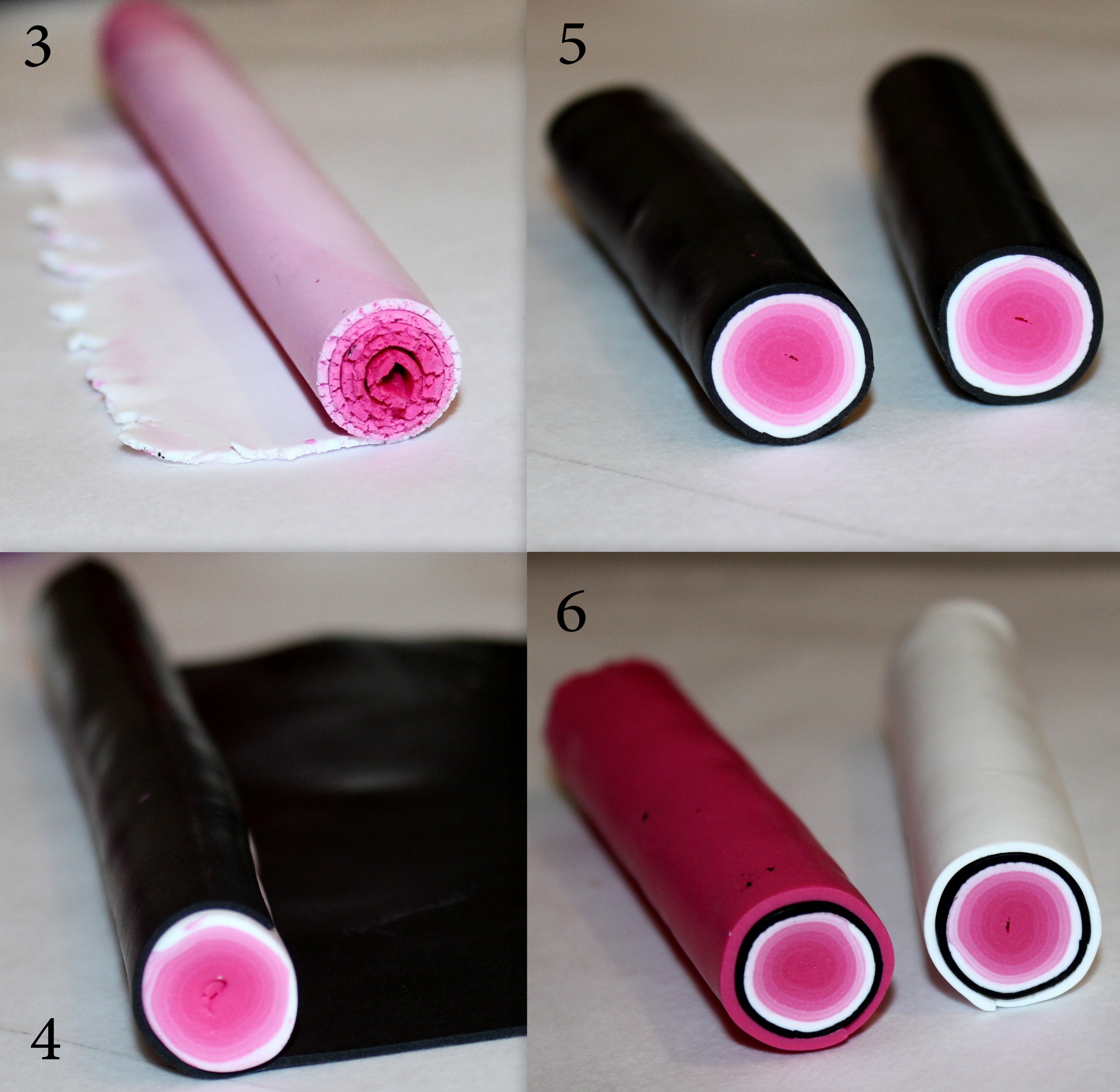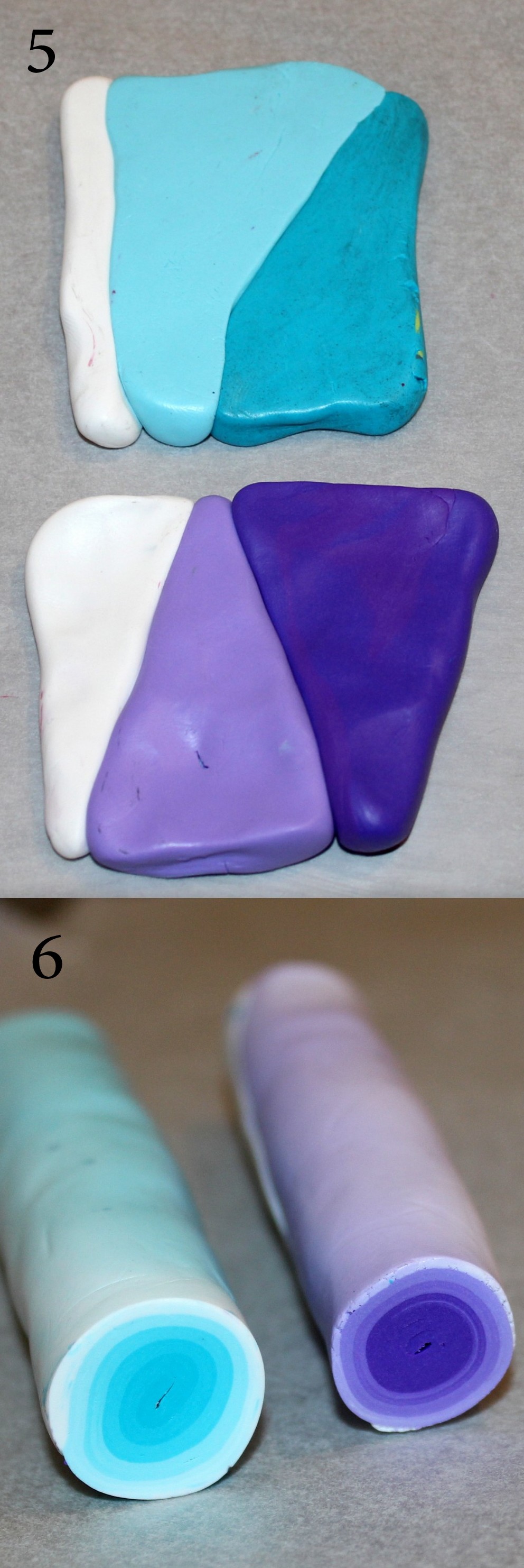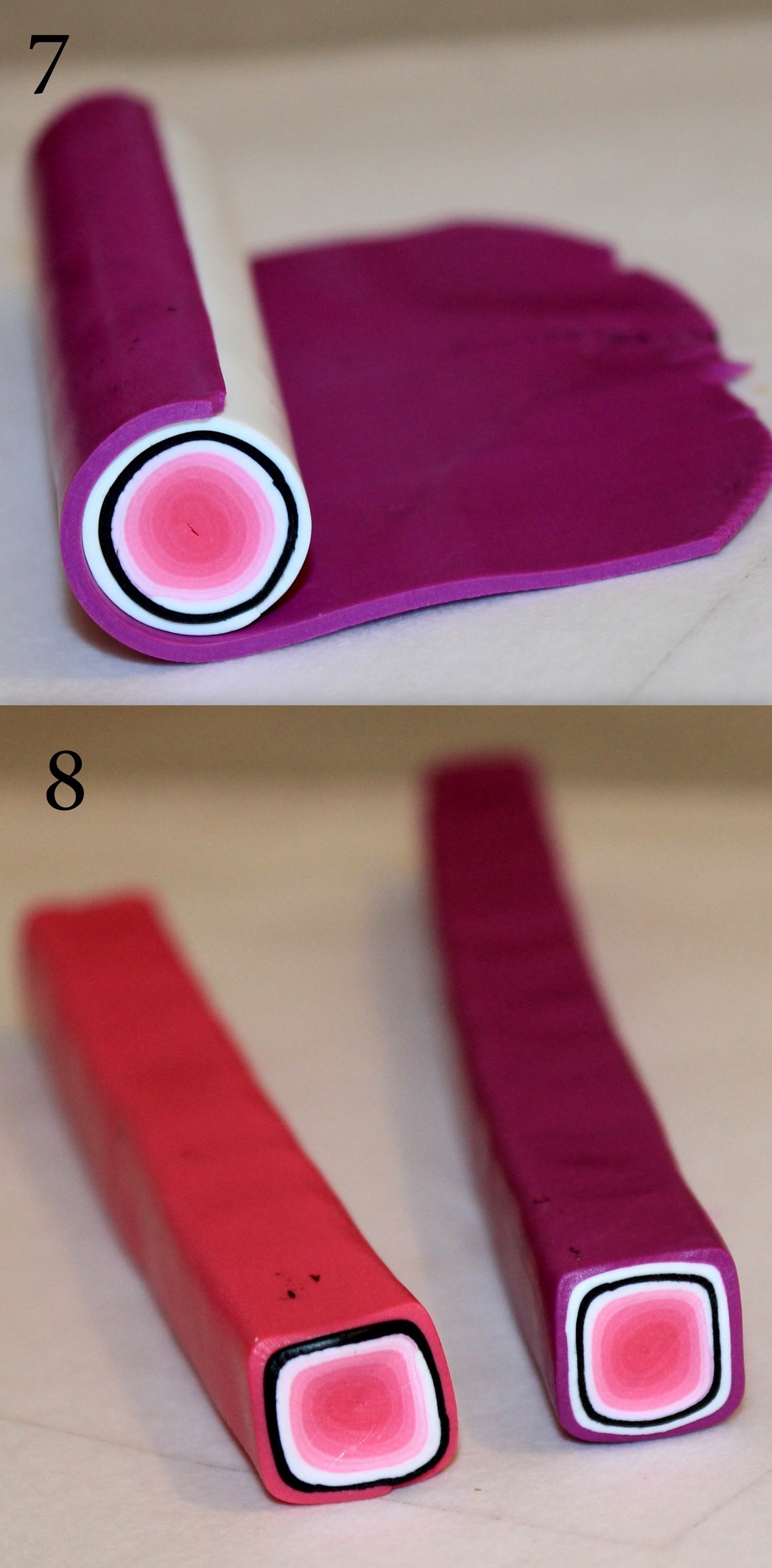 Photos 5 et 6 : Préparez deux autres canes dégradées de couleur, cette fois, en roulant simplement les plaques dégradées sur elles-mêmes comme nous avons l’habitude de le faire en début de tuto.