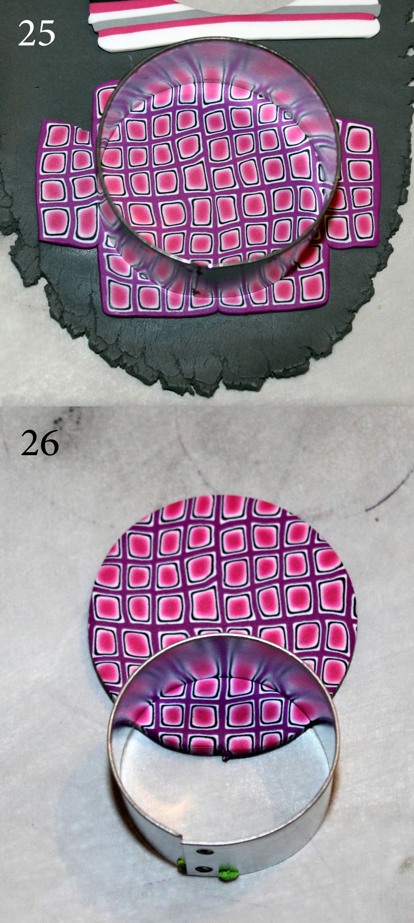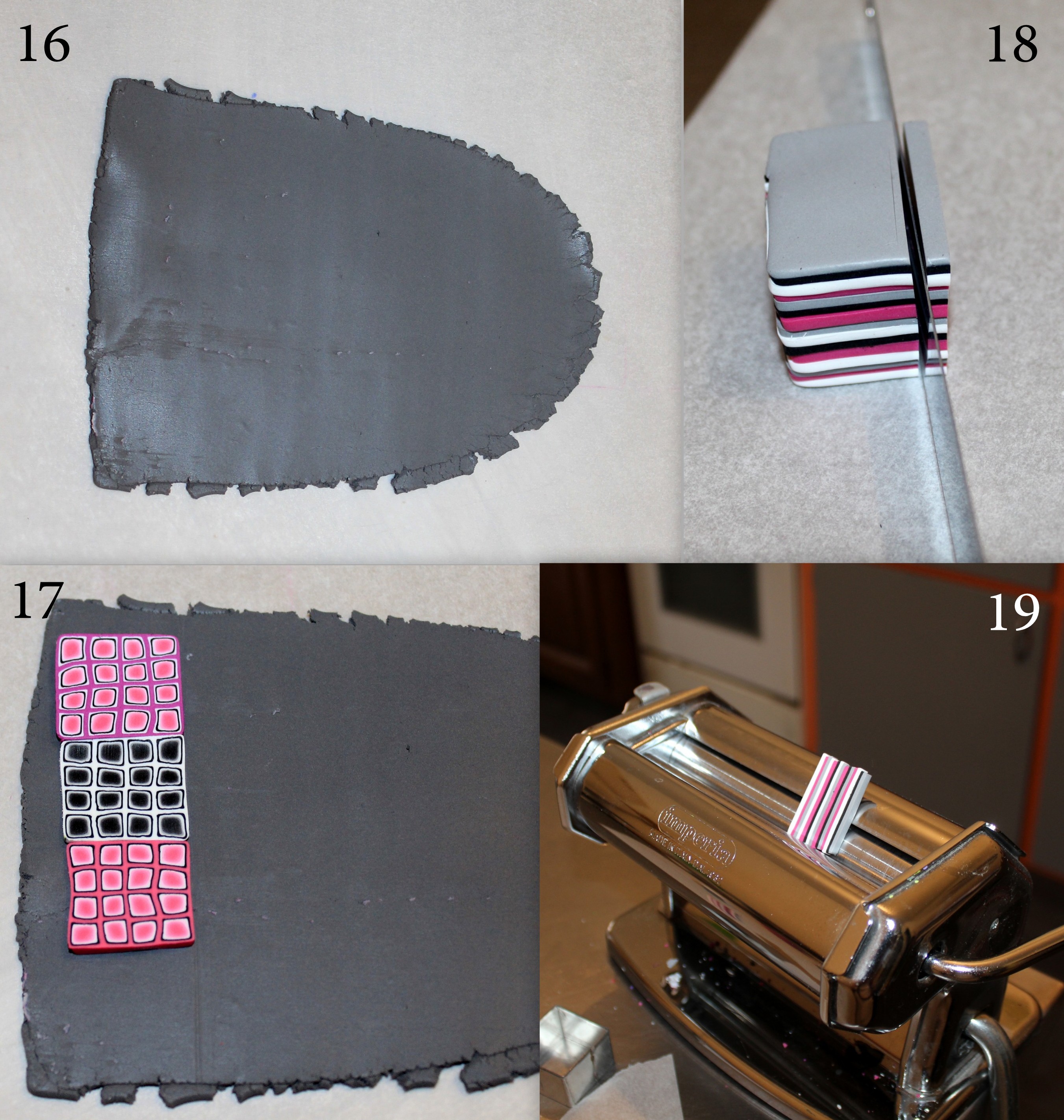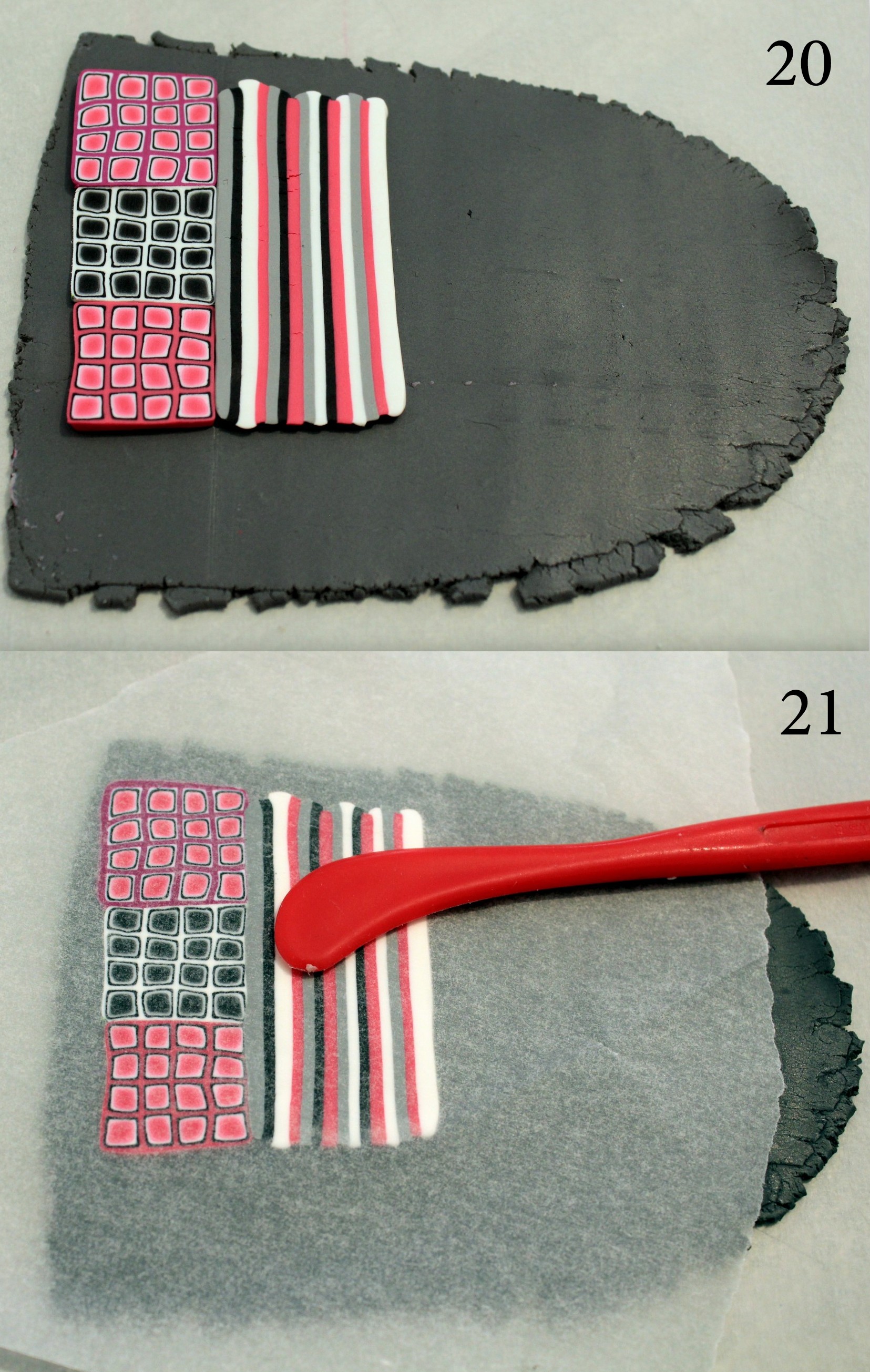 Photos 5 et 6 : Préparez deux autres canes dégradées de couleur, cette fois, en roulant simplement les plaques dégradées sur elles-mêmes comme nous avons l’habitude de le faire en début de tuto.