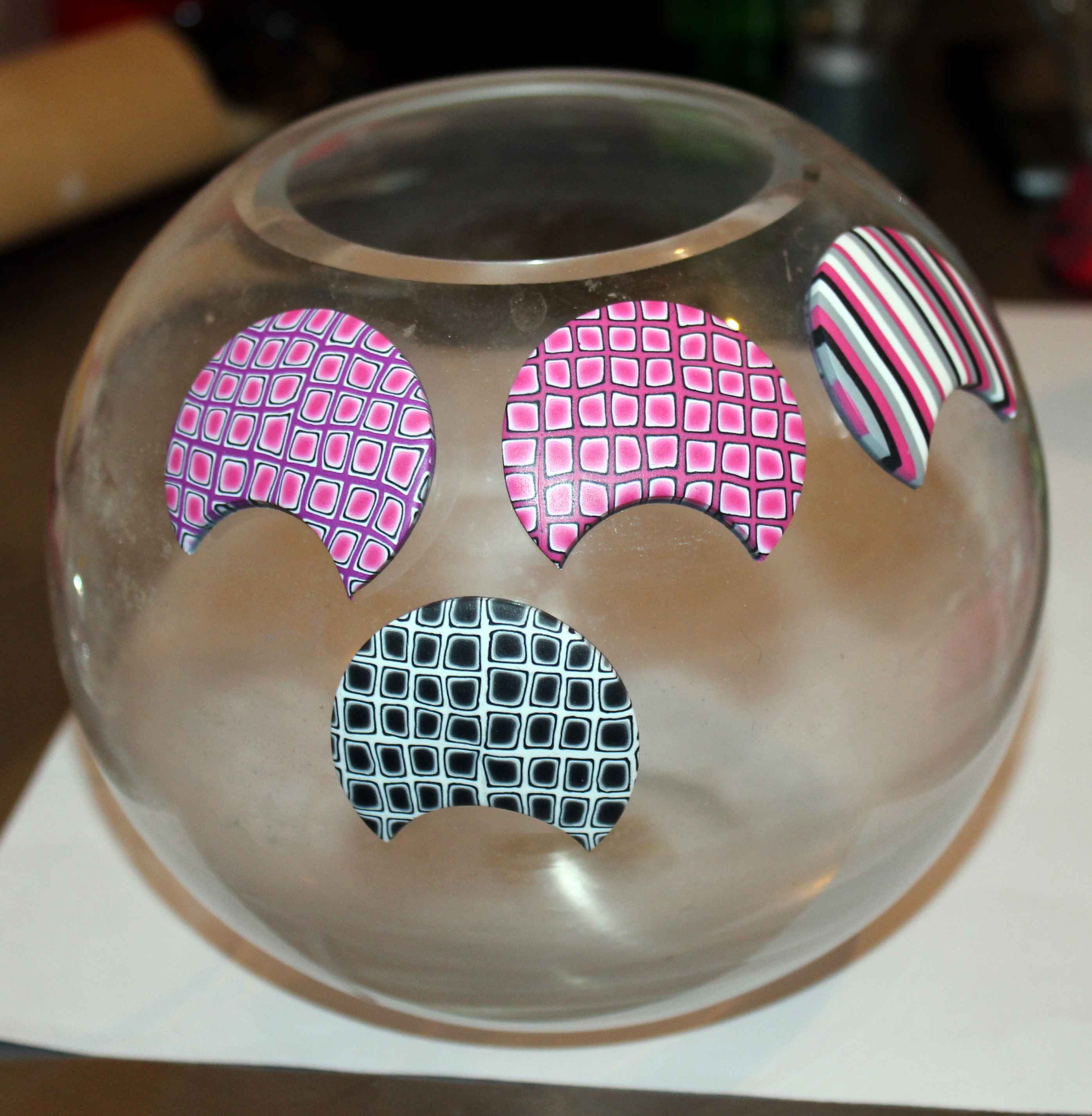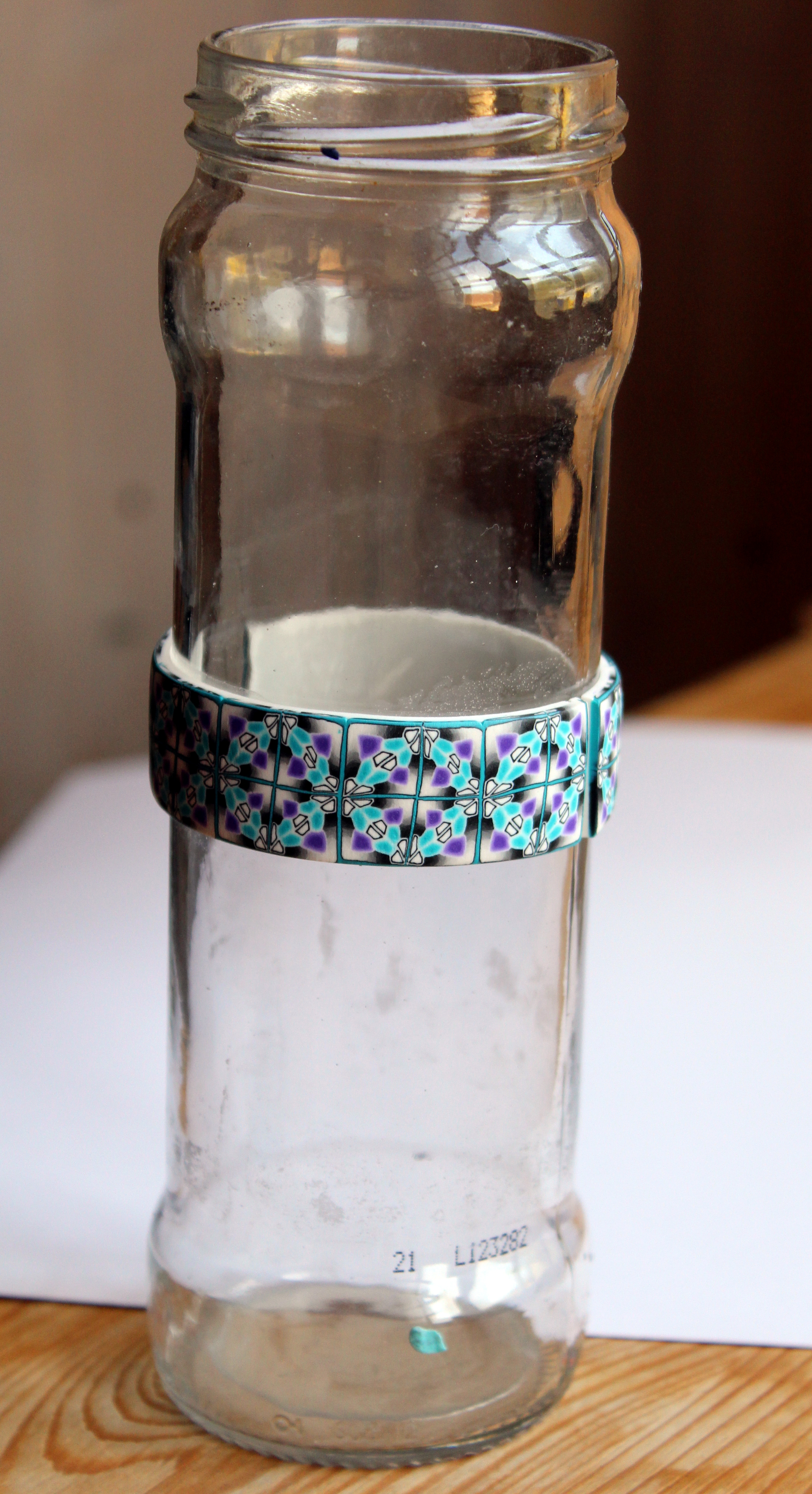 Pour ma part, j’en ai fait des petites perles plates carrées, j’ai également recouvert des petites boules de pâte crue pour faire des boucles, j’en ai assemblé plusieurs tranches pour en faire un bracelet rigide (vous admirerez encore mon superbe support de cuisson, cet un pot d’asperges, je crois…) et je me suis gardée quelques grandes tranches pour finir la décoration d’un nouveau vase :