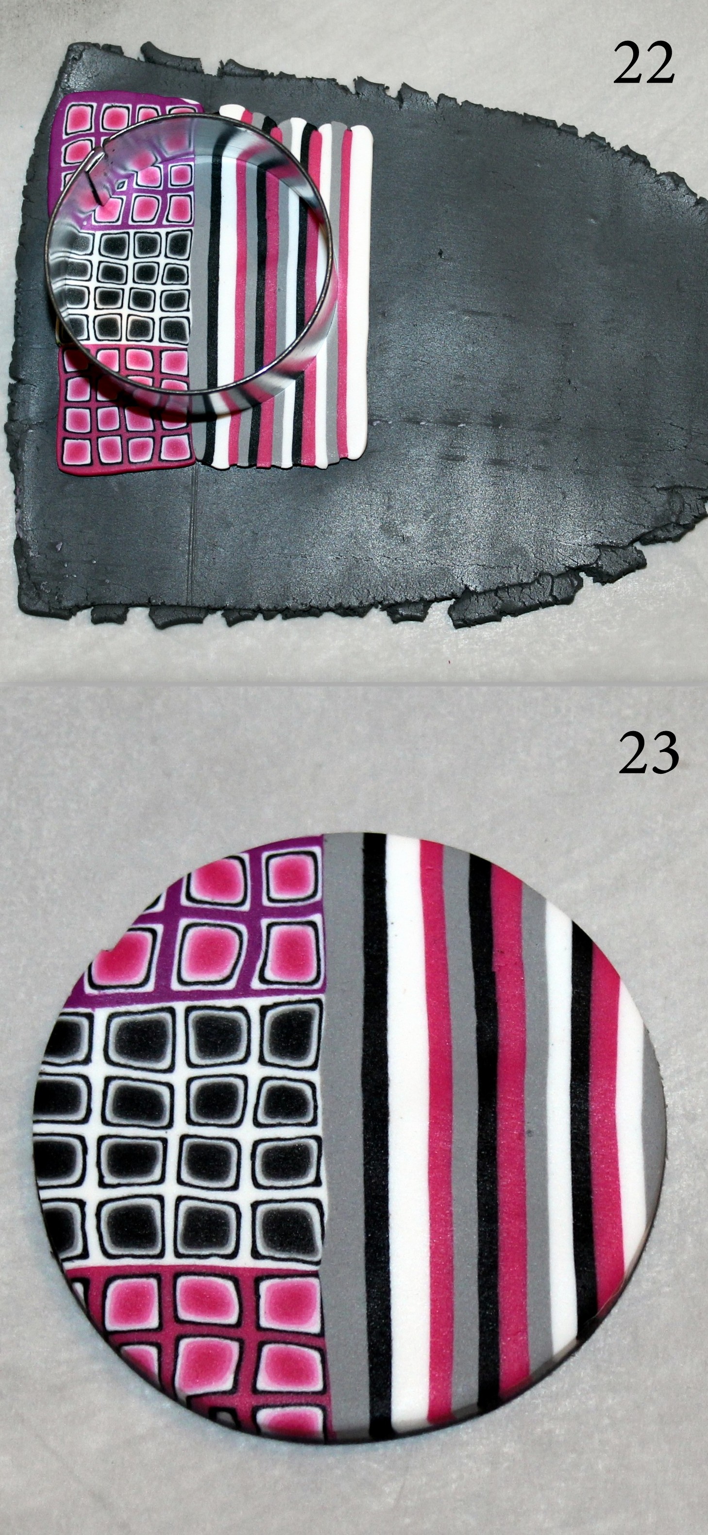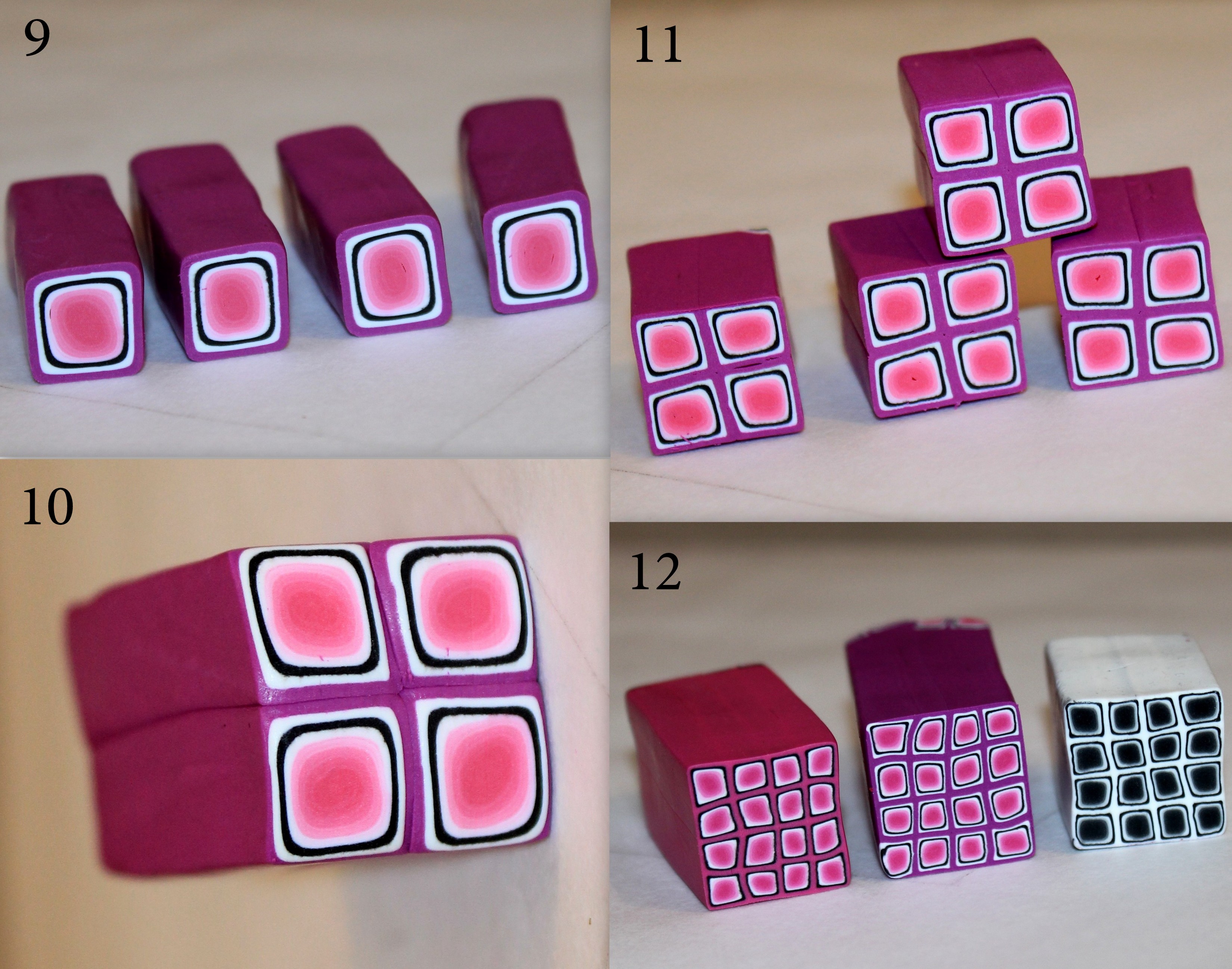 À partir de là, vous pouvez en couper des tranches épaisses pour en faire des pendentifs, en coupez des tranches fines et les placer sur une plaque unie pour faire une grande mosaïque dans laquelle vous découperez des motifs à l’emporte-pièce, continuer à dupliquer le motif en recoupant de nouveau 4 tronçons (attention, par excès de zèle, on arrive parfois à un motif trop petit pour qu’on voit encore correctement les détails des canes dégradées), ou encore transformer cette cane carrée en une cane ronde.