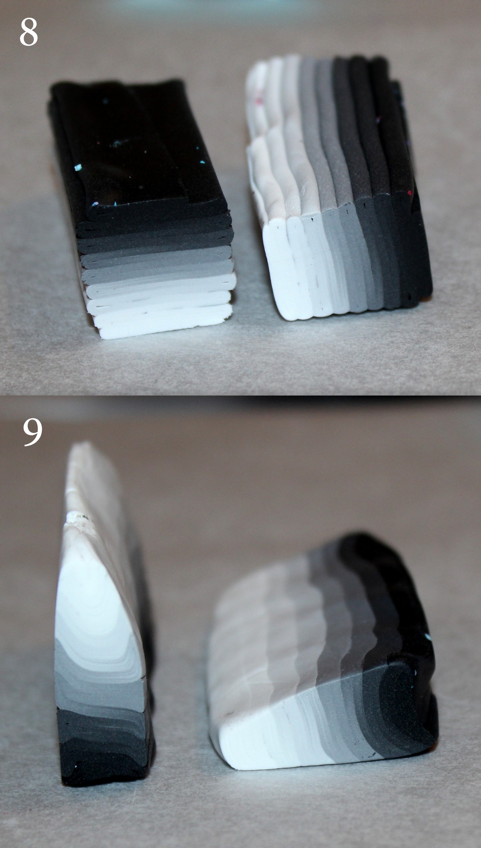 Photos 8 et 9 : Coupez la cane dégradée noire et blanche en deux et modelez-la en deux canes à section triangulaire (ou modelez la cane en triangle et coupez-là en deux, cela revient évidemment au même… cela permet peut-être même d’être plus régulier). Il ne faut pas que le triangle de la cane soit équilatéral mais isocèle avec une petite base.
