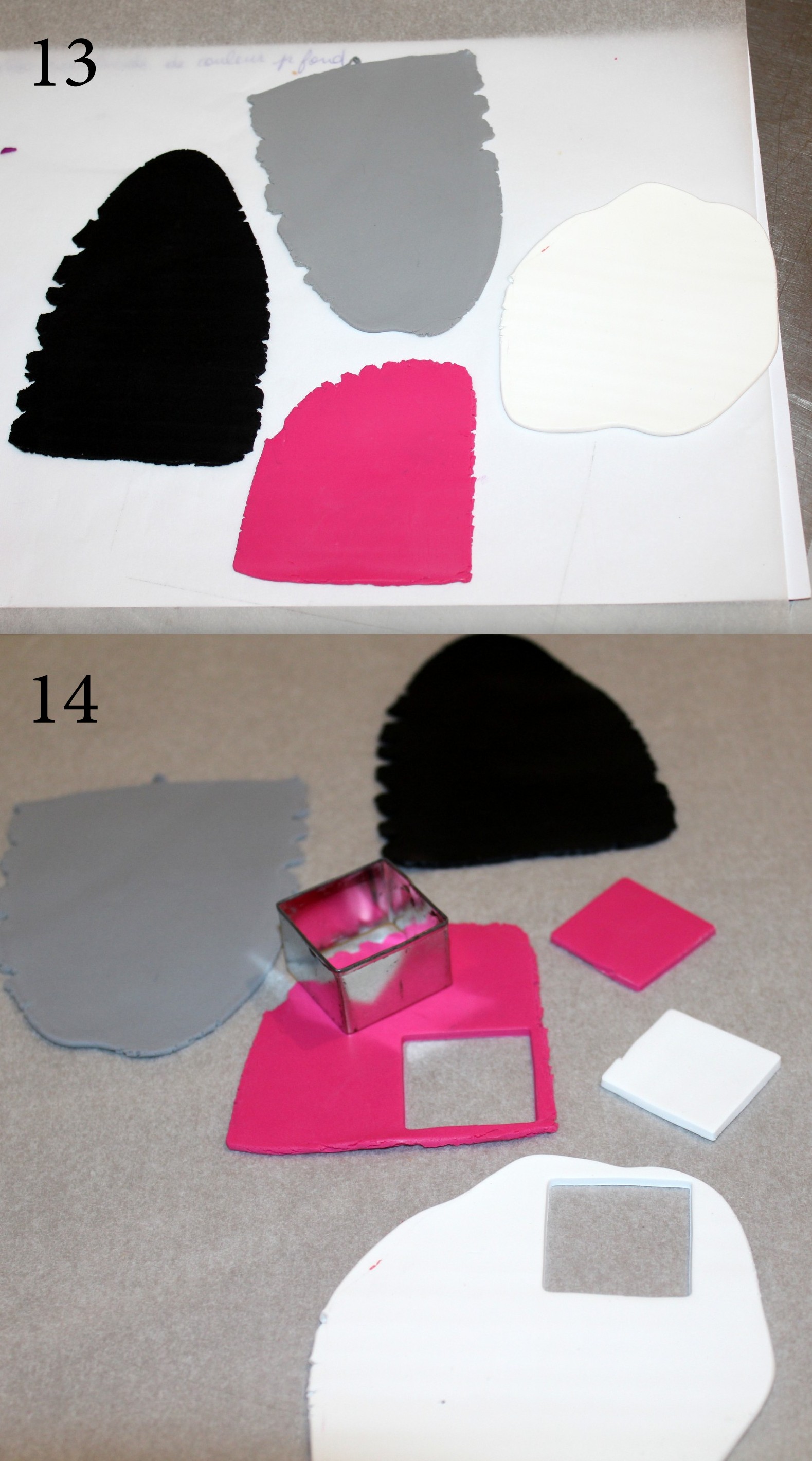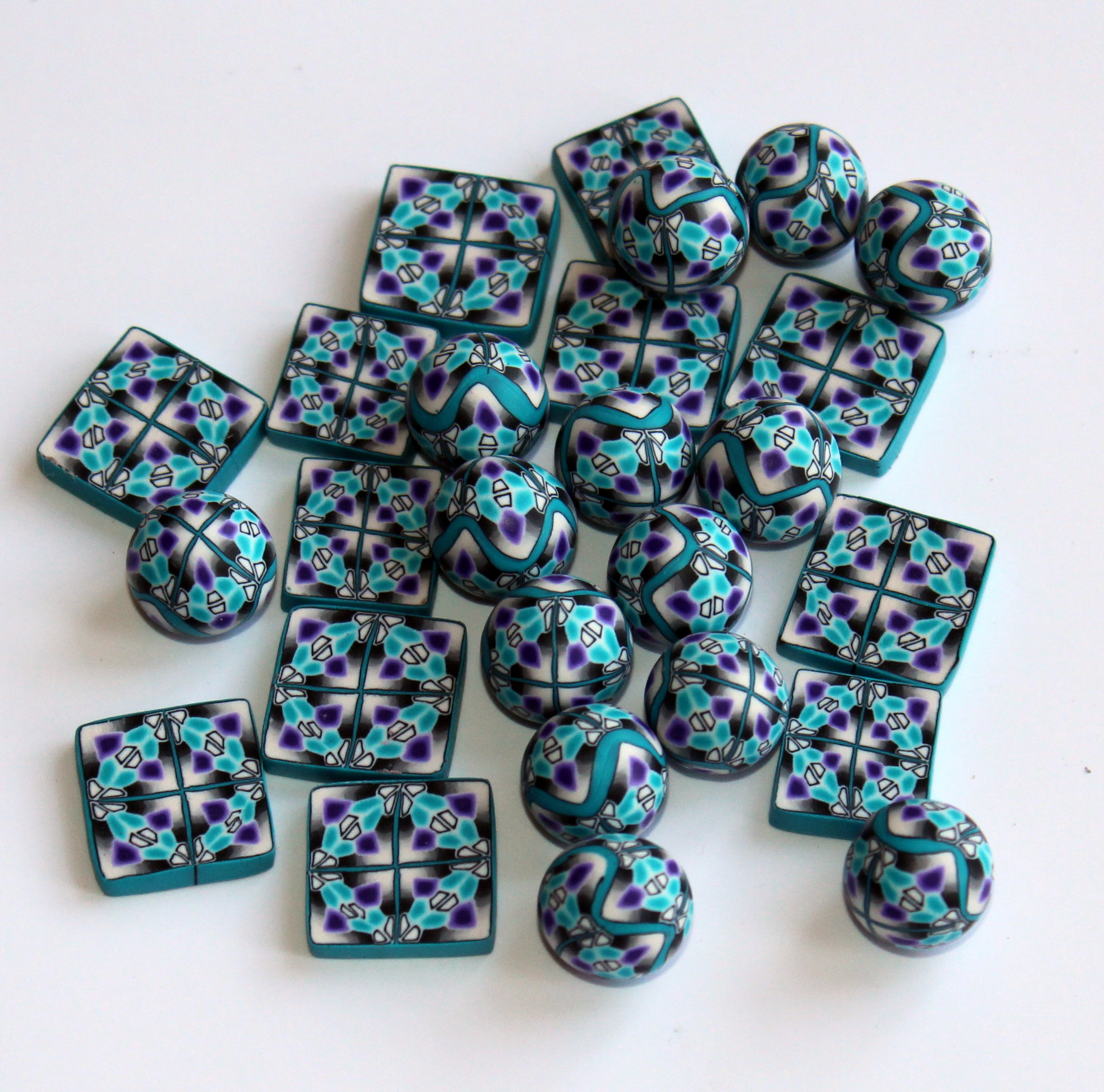 - Pâtes polymères de votre choix, ici, BLANC, noir, turquoise et violet.