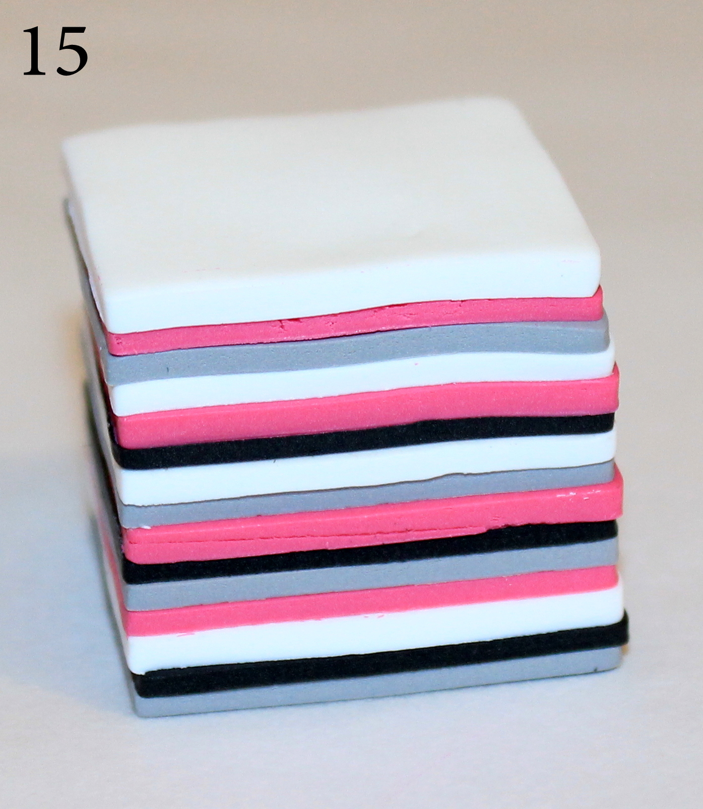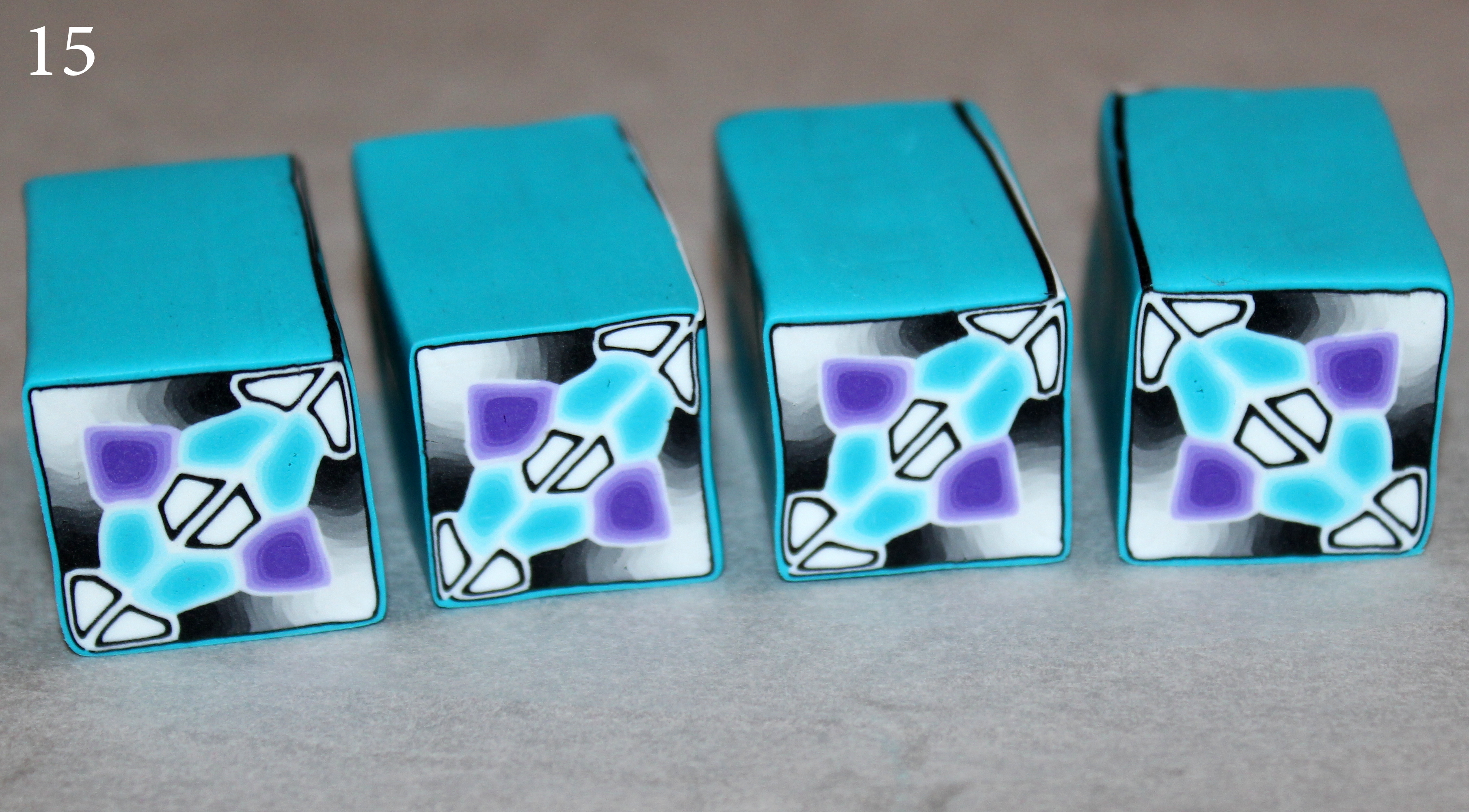 Photo 15 : Étirez la cane carrée jusqu’à en couper 4 tronçons égaux. (astuce : avant de couper les 4 morceaux, pensez d’abord à couper proprement les deux extrémités). Assemblez-les comme vous le voulez ; pour ma part, j’aime lorsque le dégradé est au cœur et que les autres canes dessinent un carré « dans le carré ».