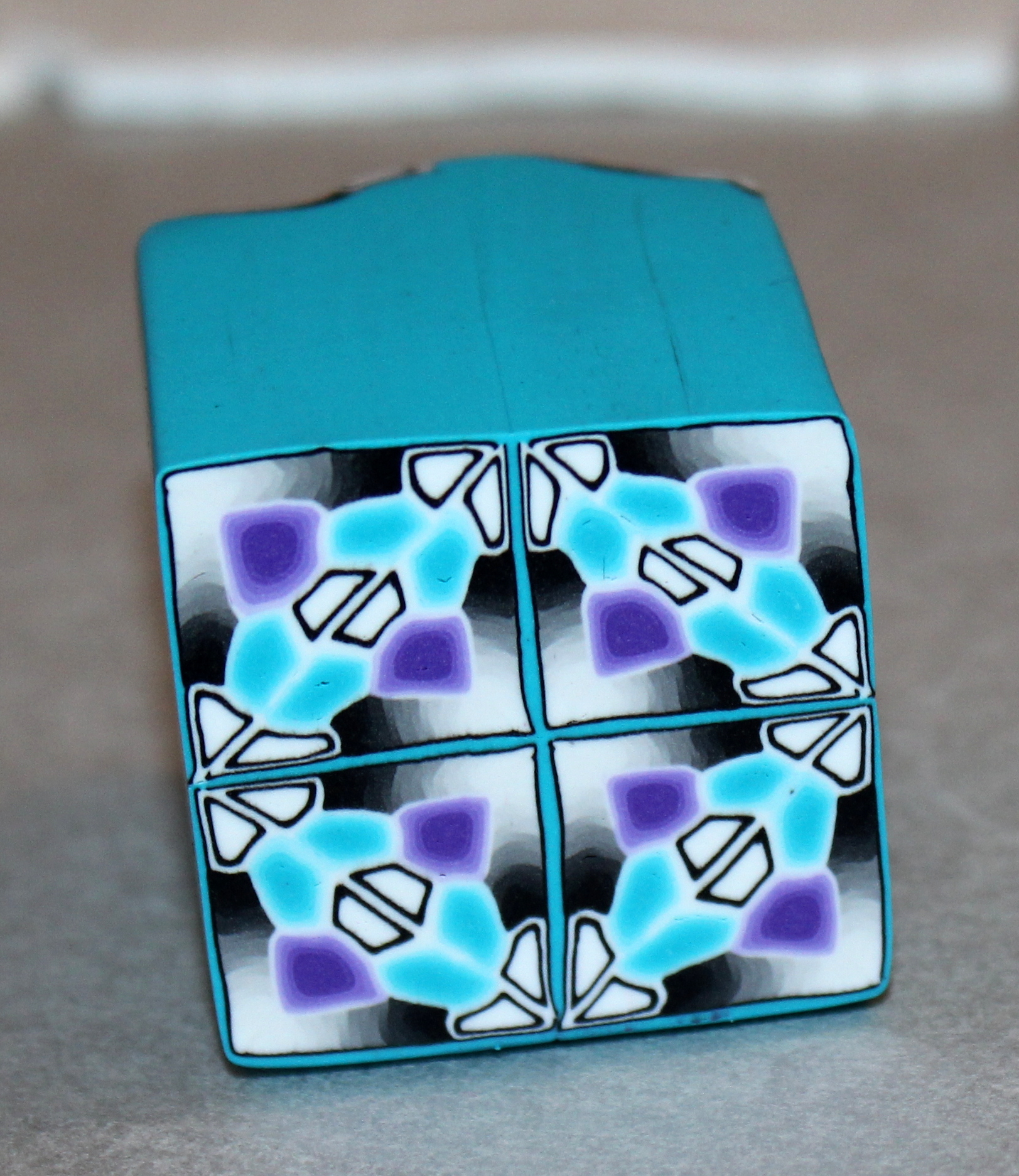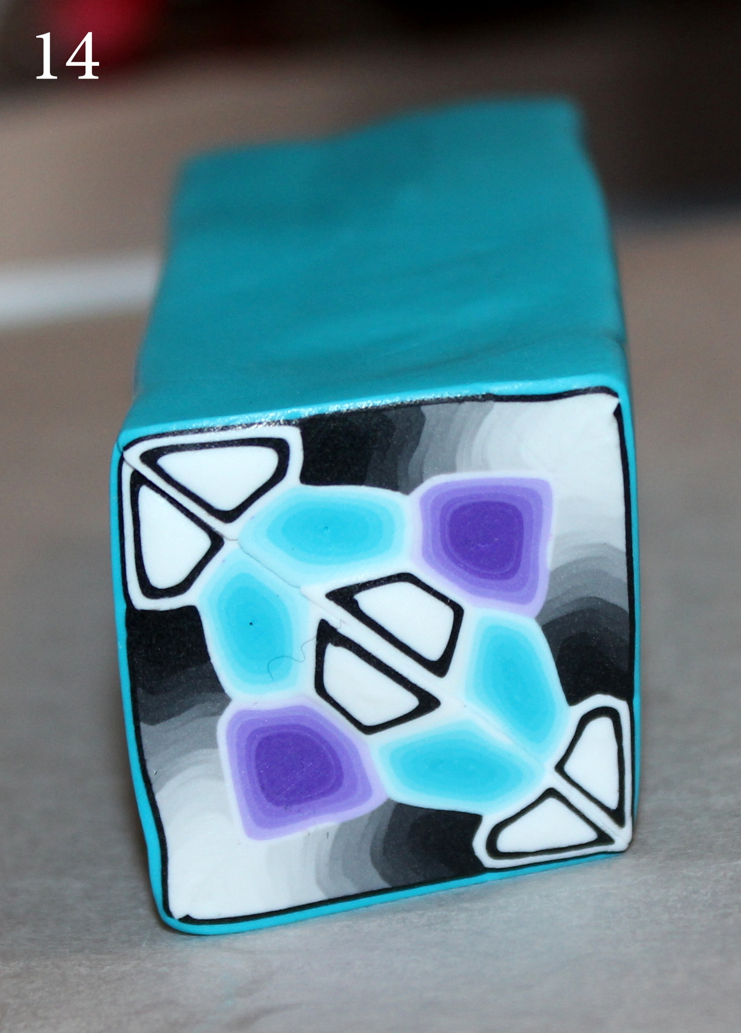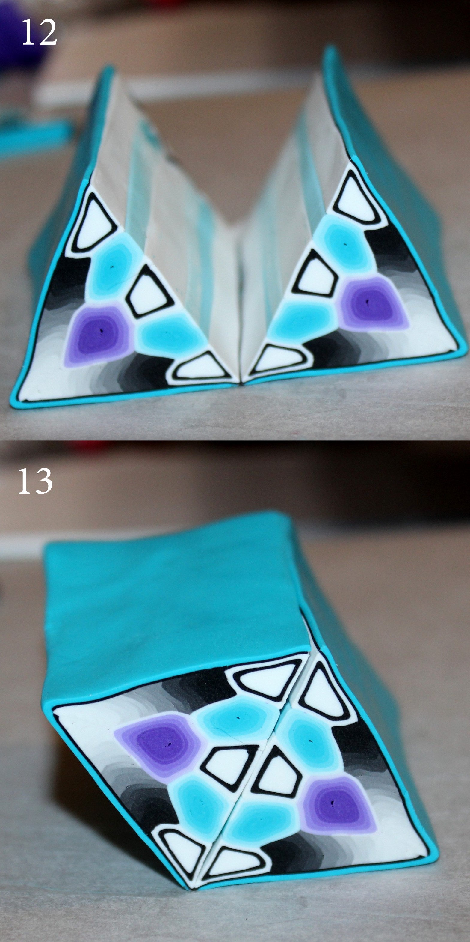 Photos 10 et 11 : Procédez à l’assemblage : Pour ma part, j’ai commencé par former un triangle grossier avec la cane dégradée violette et les deux morceaux de dégradés noirs et blancs. Dans un deuxième temps j’ai ajouté les deux morceaux de cane turquoise et j’ai bouché les trous avec la cane cible noire et blanche préalablement coupé en 3 morceaux. J’ai modelé un peu plus précisément en triangle l’ensemble de la cane et j’ai fini par recouvrir le sommet d’une fine plaque de noir puis d’une turquoise un chouia plus épaisse. (Ces deux fines plaques dessineront la croix centrale du motif, vous pouvez choisir de changer de couleur pour qu’elle ressorte).