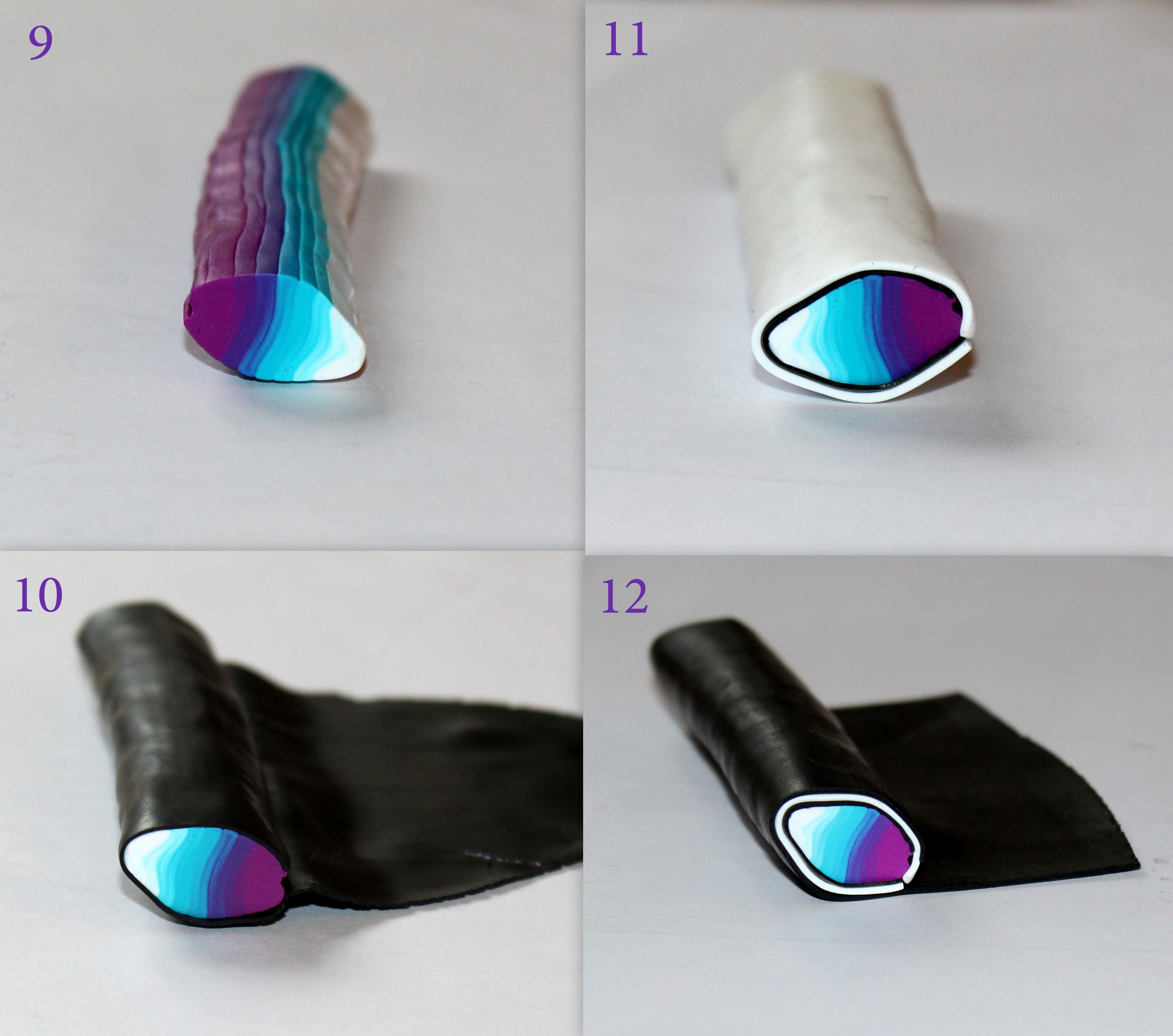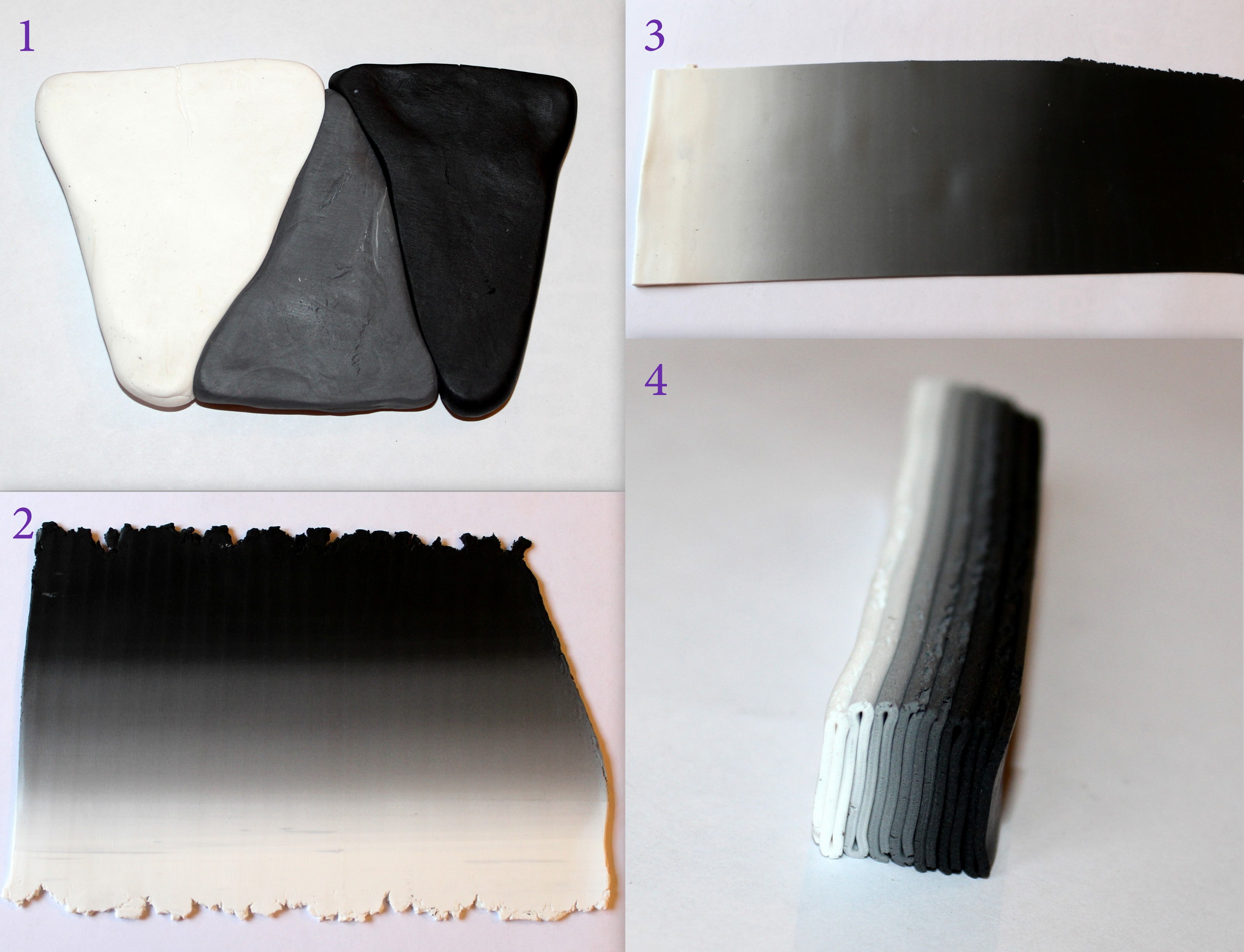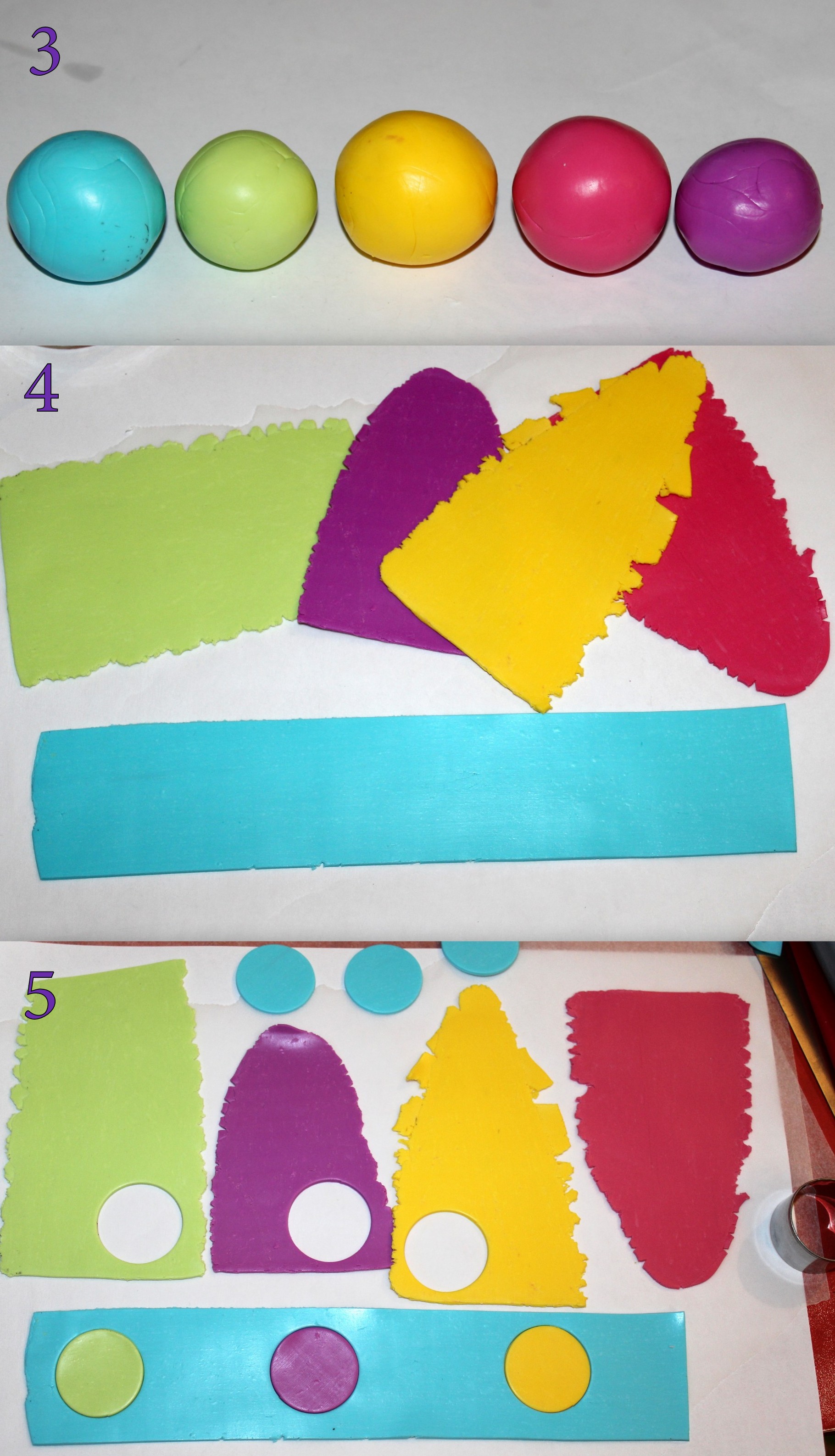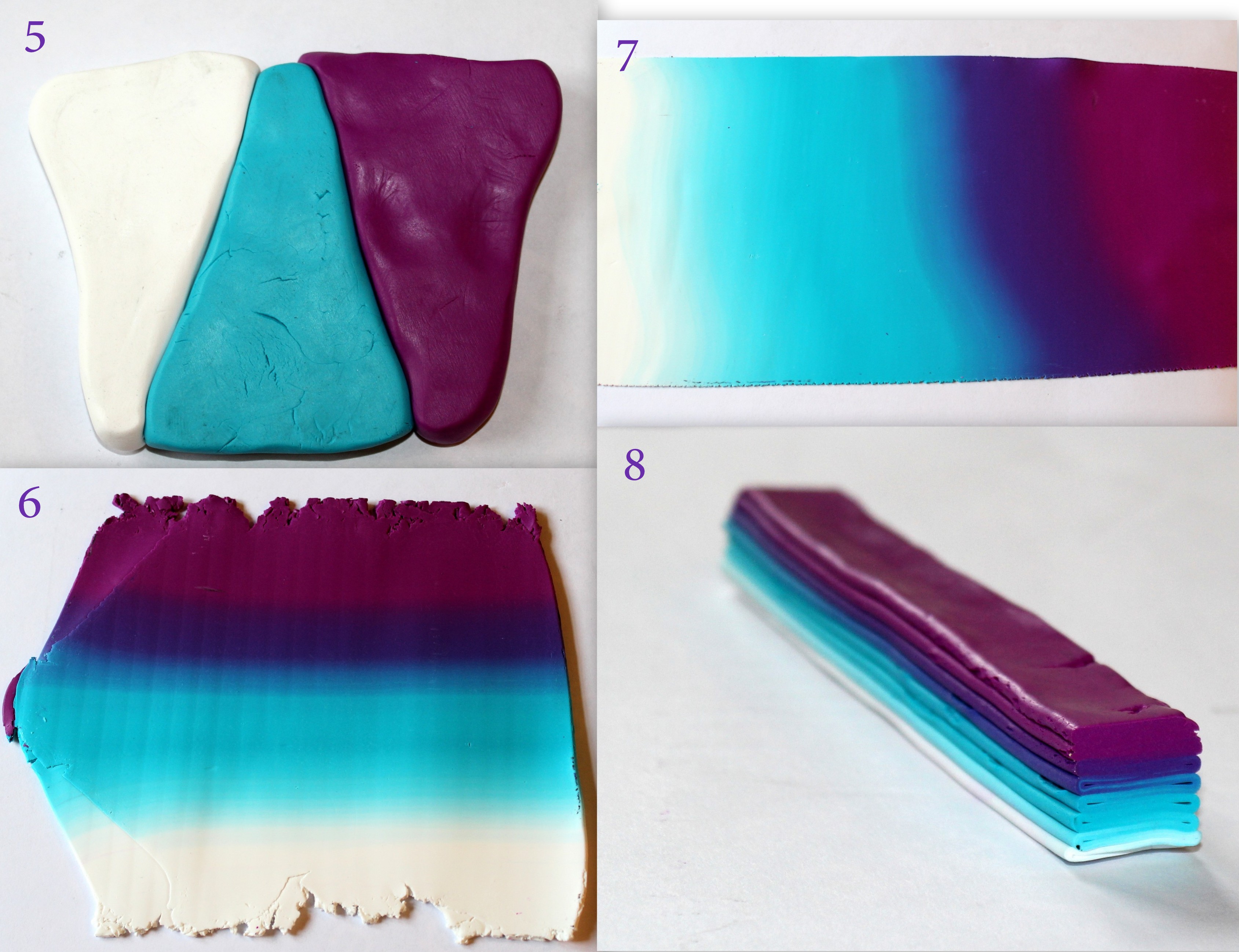 Photos 3, 4, 5 et 6 : Une fois que mes couleurs sont prêtes, j’en fais des plaques en les passant à la machine au réglage 1 (le plus épais).