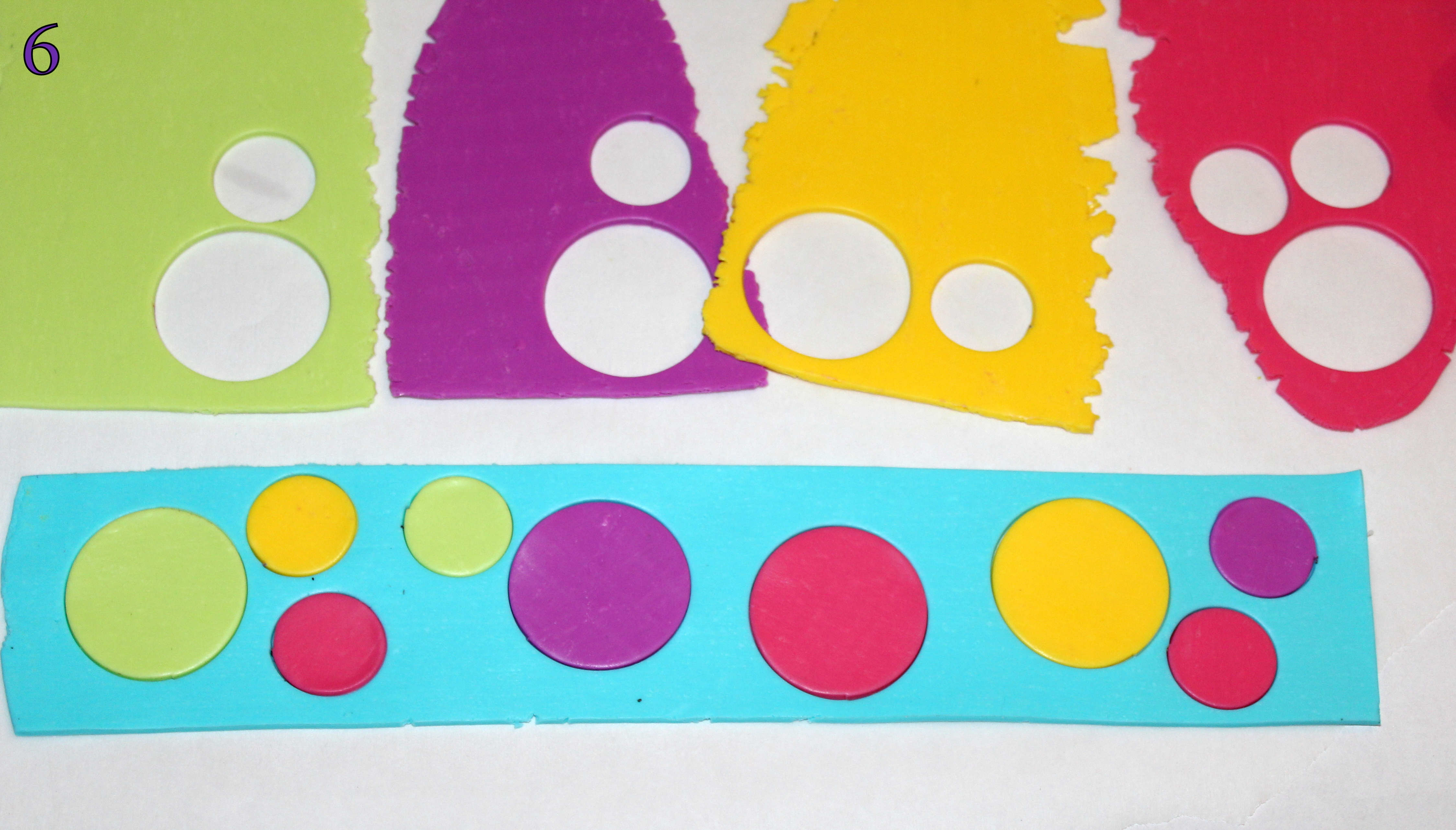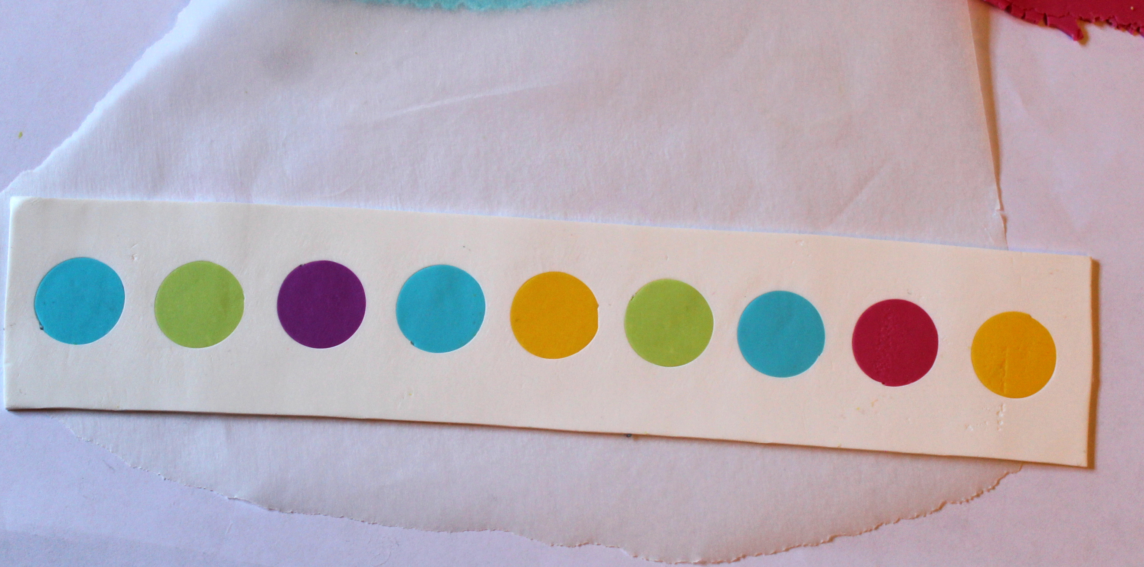 Je commence par découper à l’emporte-pièce rond des disques bleus de tailles différentes que je remplace par d’autres couleurs. Pas besoin d’être régulier, au contraire !