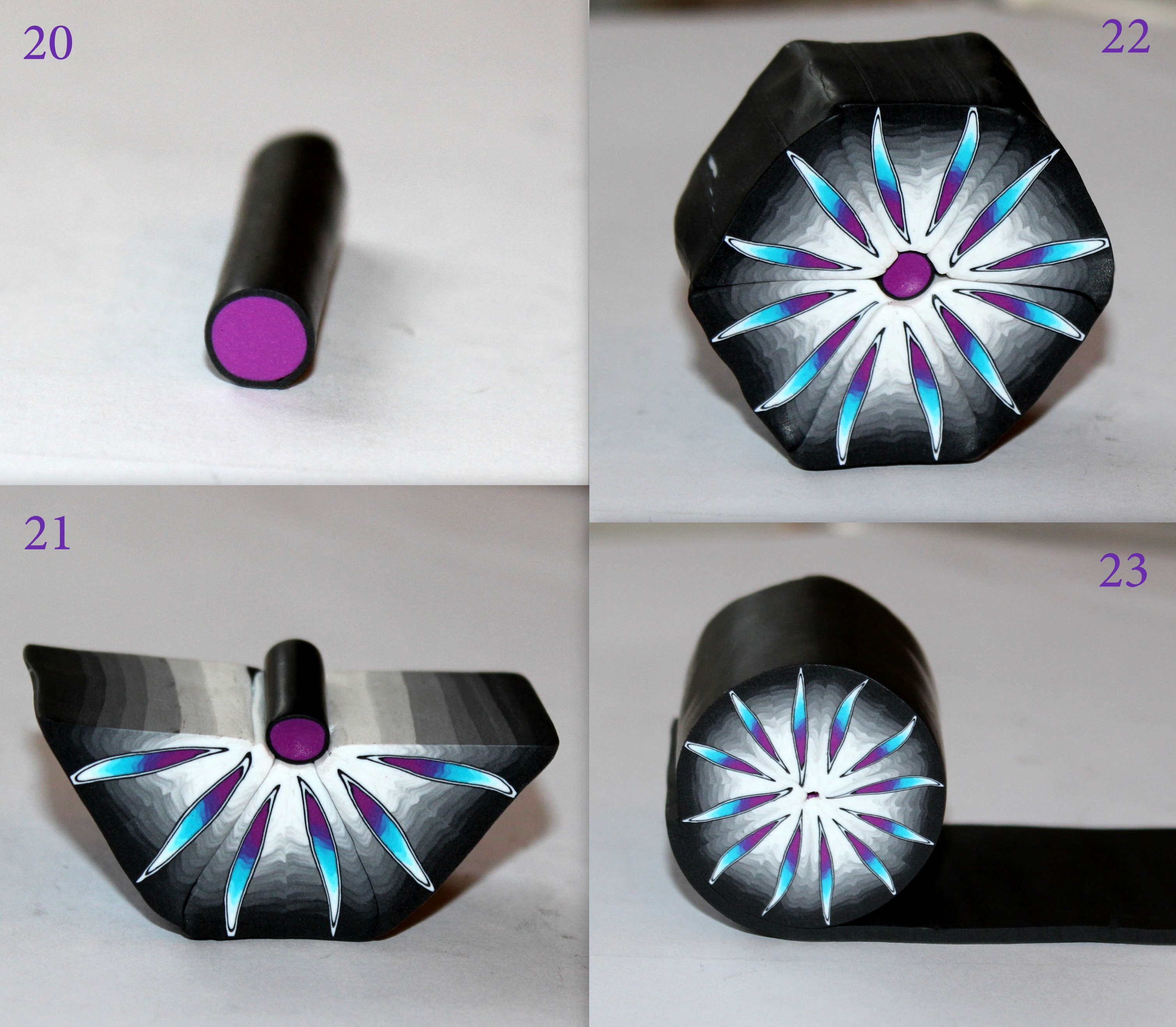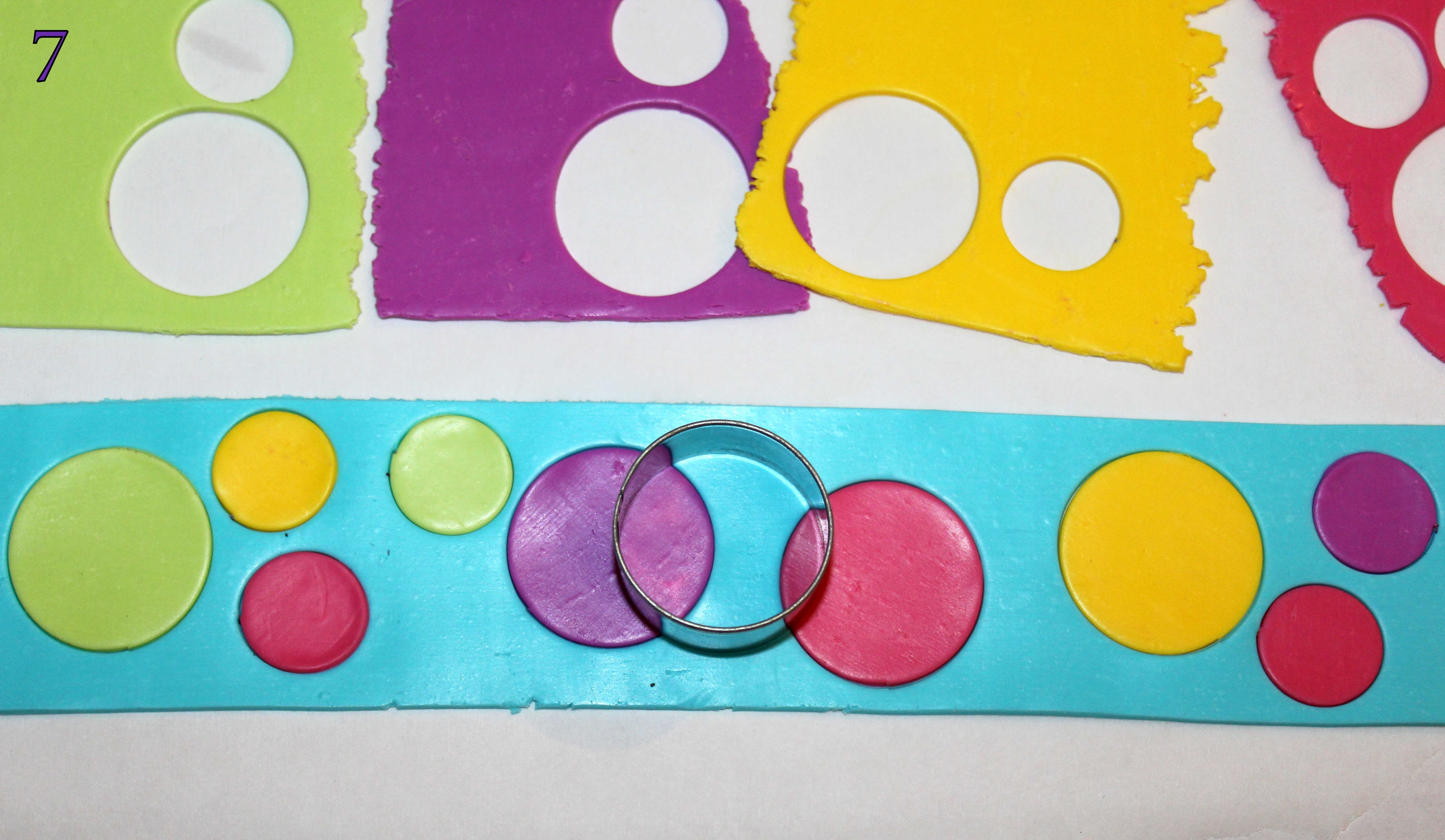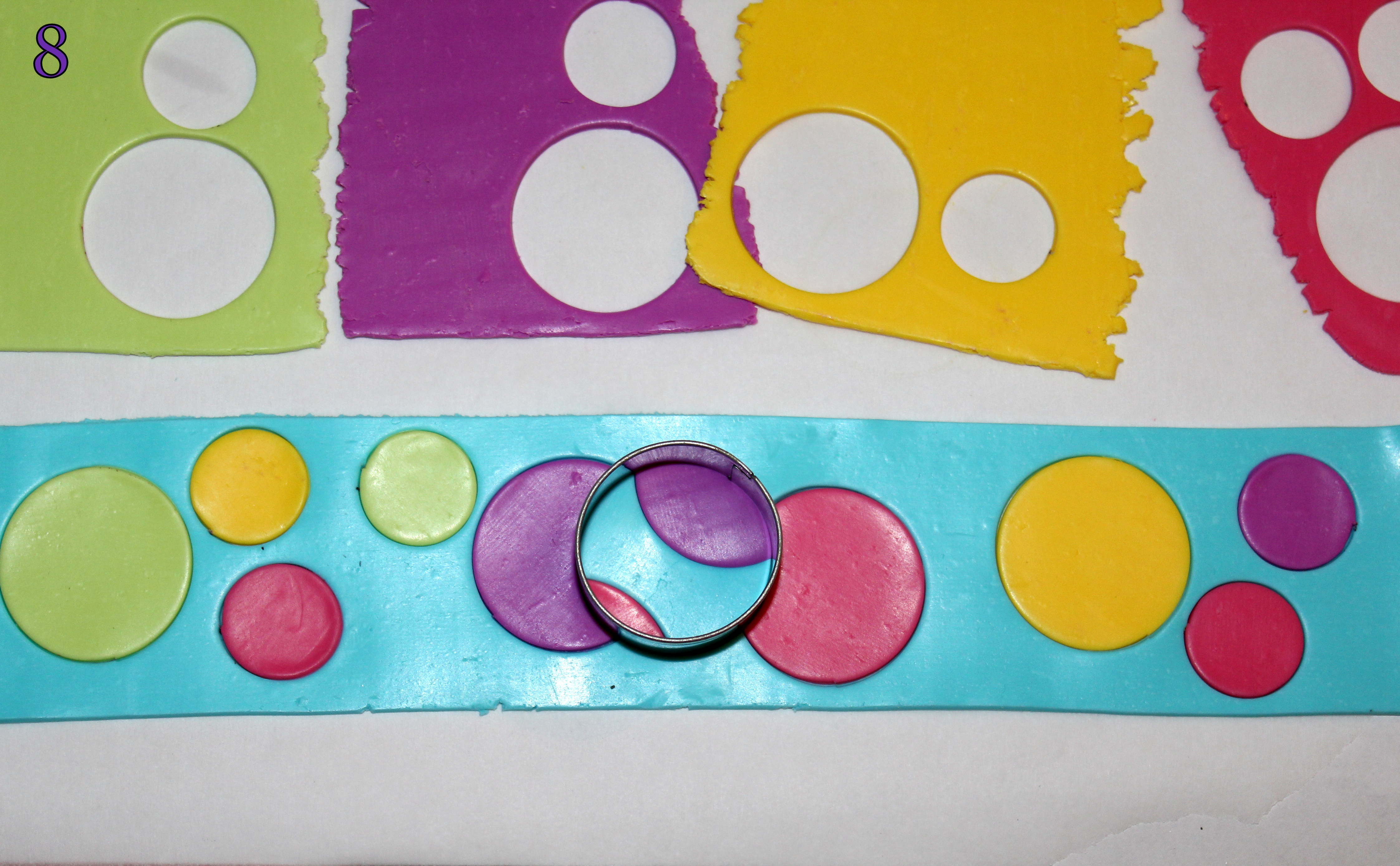 Photos 7 et 8 : Une fois que j’ai un certain nombre de ronds de couleur, je prends l’emporte-pièce le plus gros et je découpe une zone entre plusieurs couleurs. SANS RELEVER l’emporte-pièce, je le fais PIVOTER d’au moins un quart de tour et je le retire enfin en laissant la pâte décalée. (rmq : Cette technique rend encore mieux lorsqu’à la place du bleu uni, on utilise une plaque dégradée, dans ce cas, inutile de prévoir d’autre couleurs mais contentez-vous d’inverser les zones comme je l’ai fait sur ce tableau.)