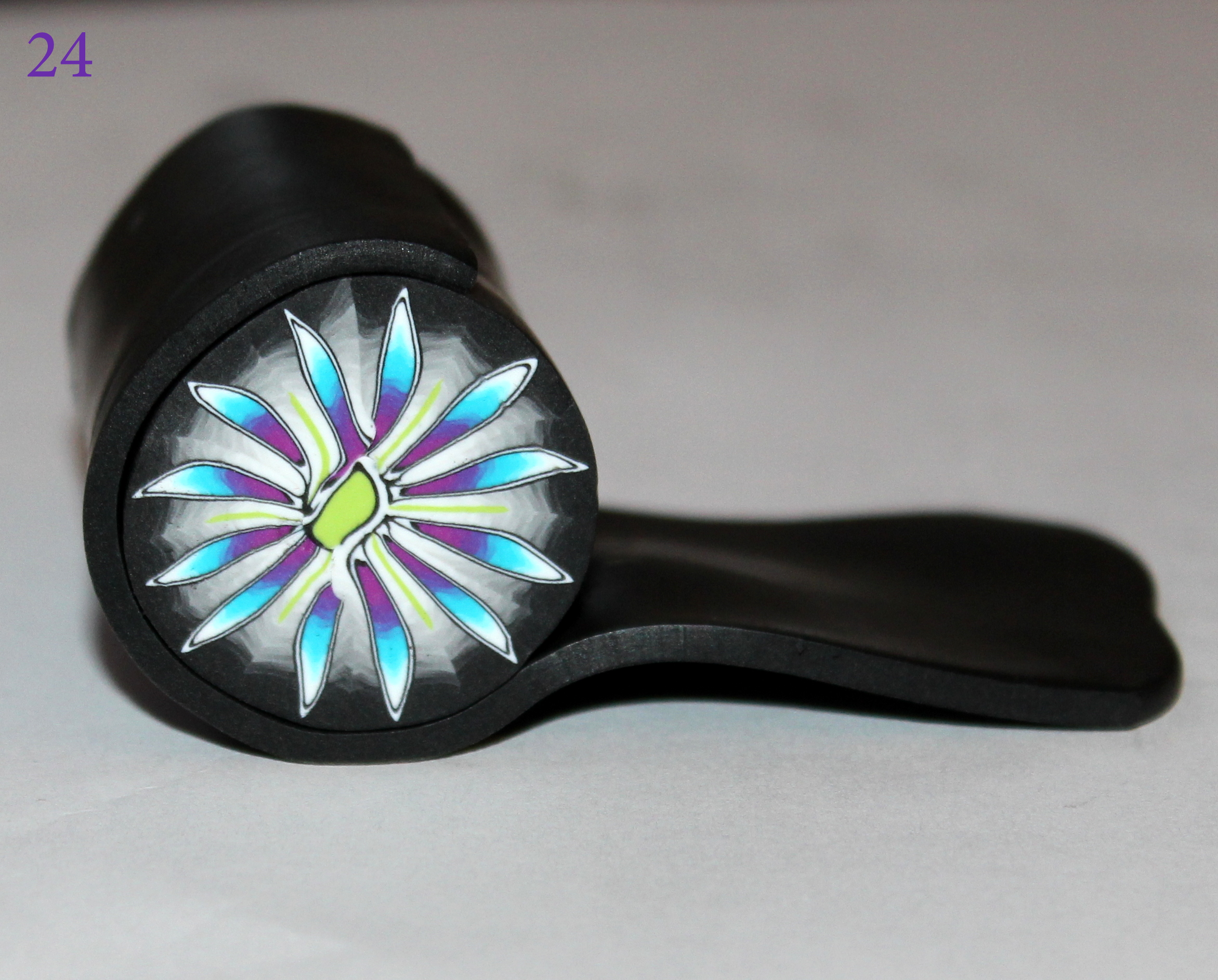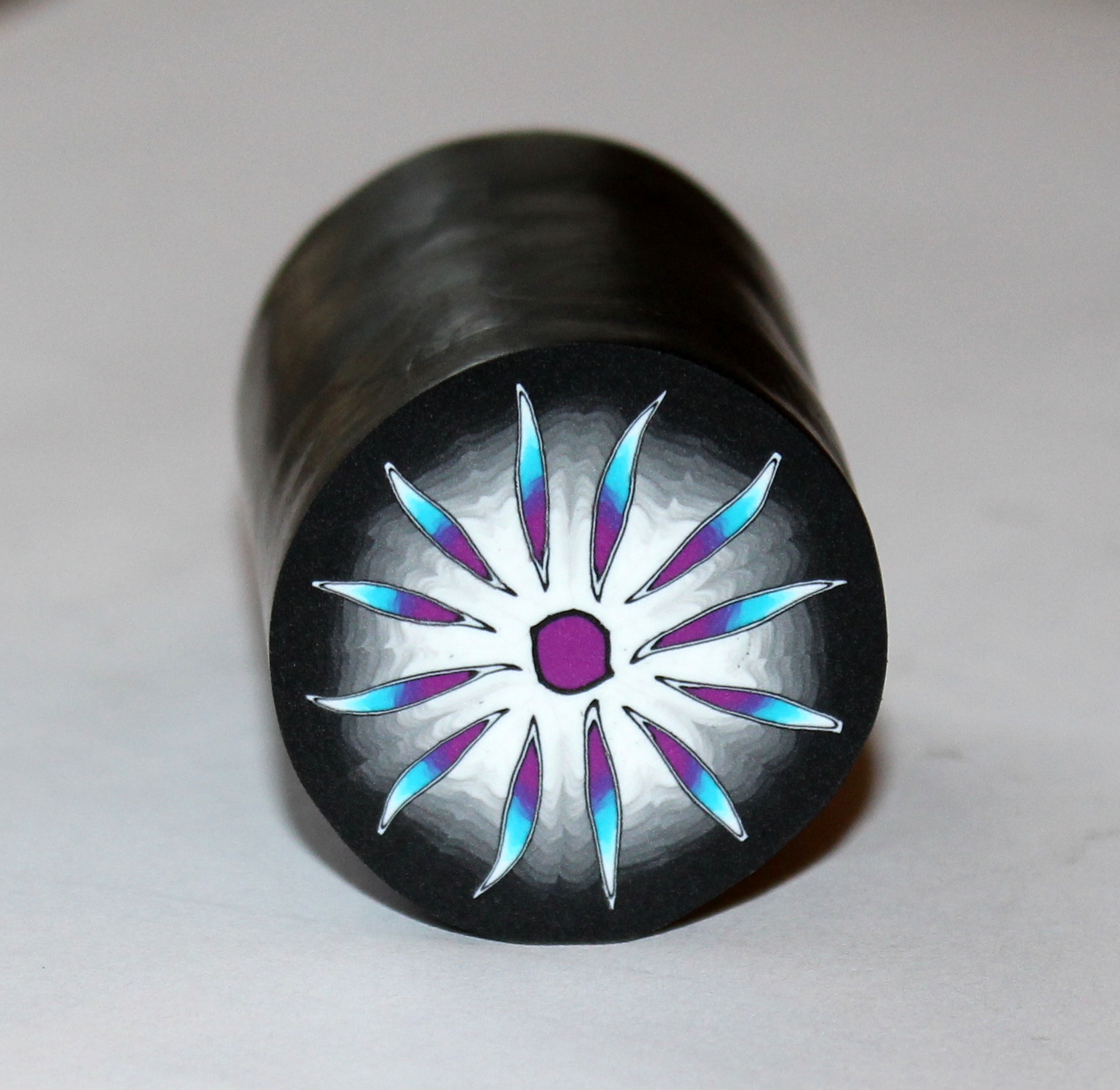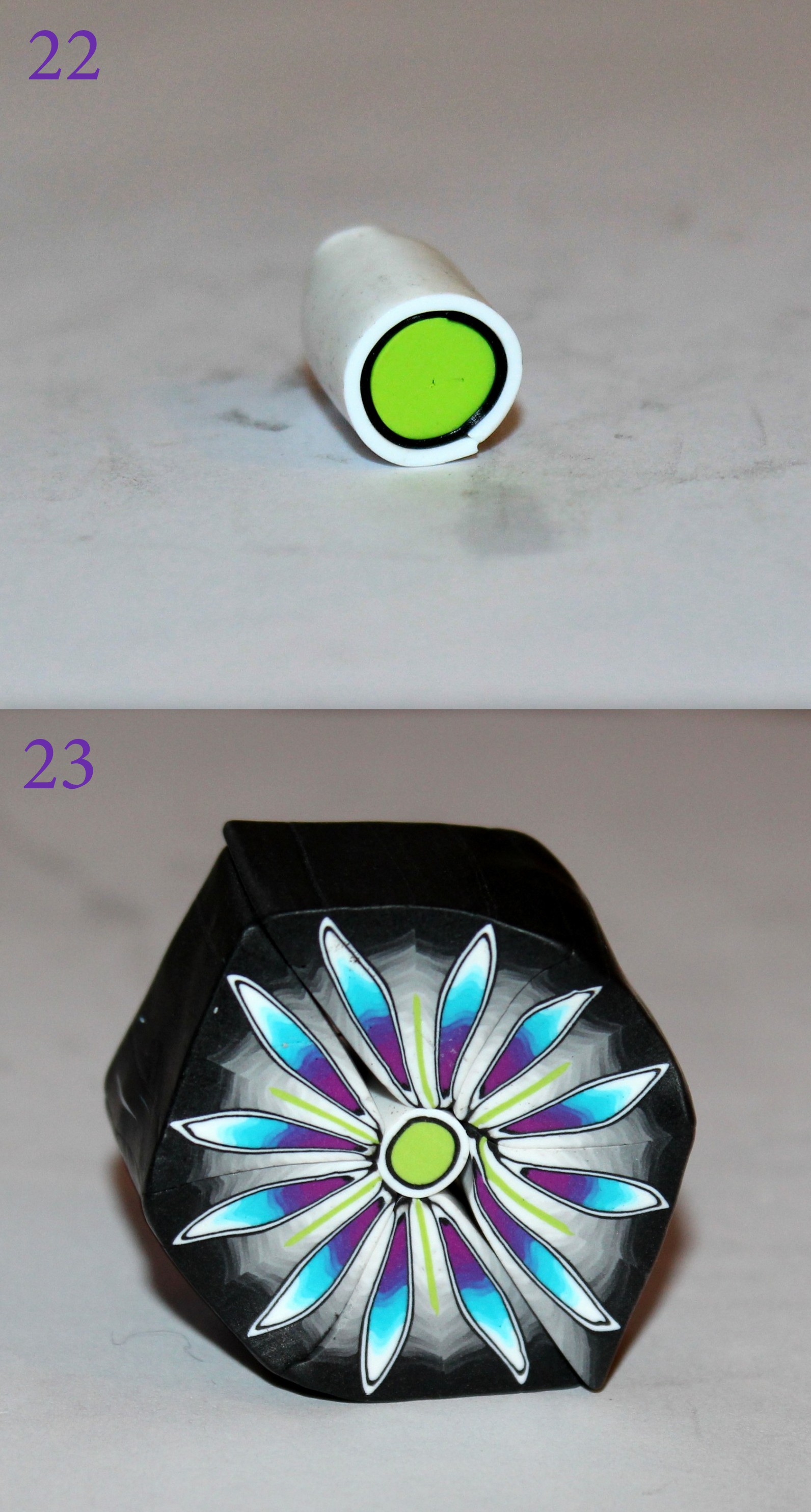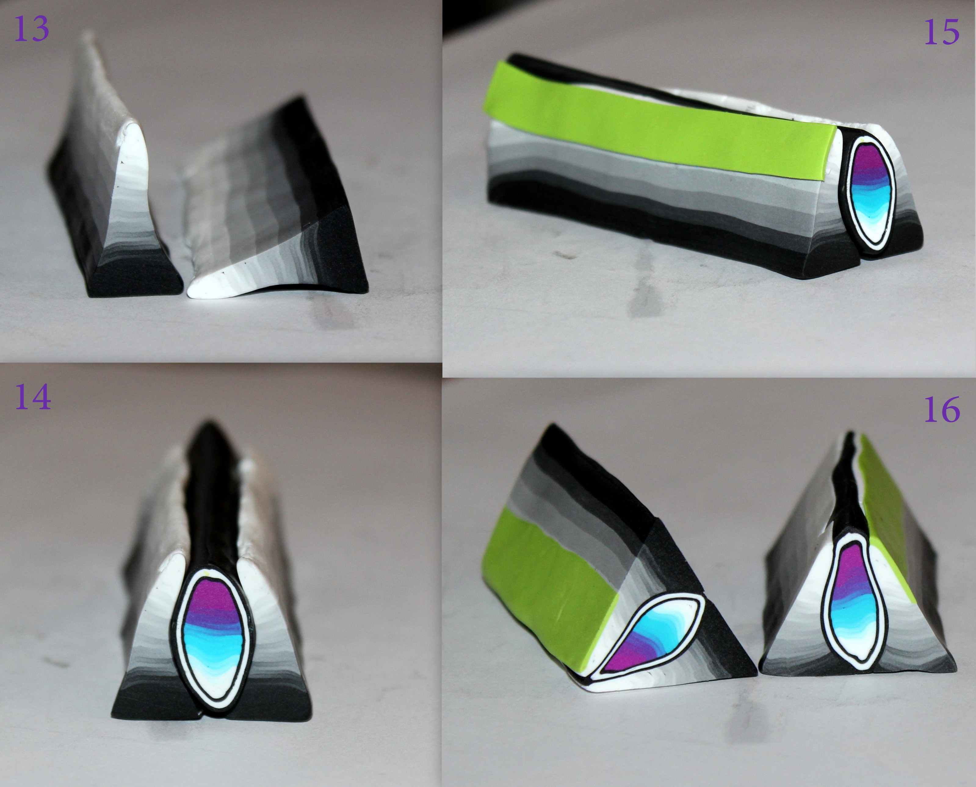 Photos 7 et 8 : Une fois que j’ai un certain nombre de ronds de couleur, je prends l’emporte-pièce le plus gros et je découpe une zone entre plusieurs couleurs. SANS RELEVER l’emporte-pièce, je le fais PIVOTER d’au moins un quart de tour et je le retire enfin en laissant la pâte décalée. (rmq : Cette technique rend encore mieux lorsqu’à la place du bleu uni, on utilise une plaque dégradée, dans ce cas, inutile de prévoir d’autre couleurs mais contentez-vous d’inverser les zones comme je l’ai fait sur ce tableau.)