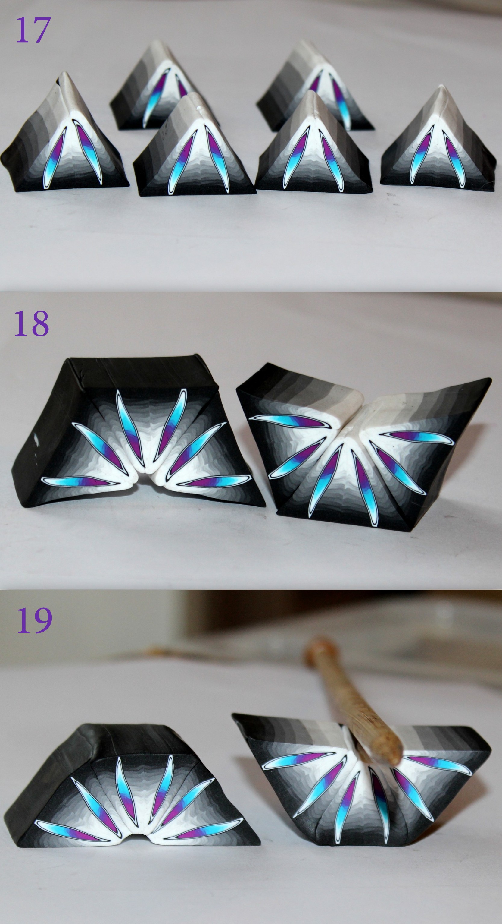 Photos 9, 10 et 11 : Répétez l’opération autant de fois que vous le désirez et avec autant d’emporte-pièce ronds que vous le voulez. Une fois que l’ensemble vous satisfait, faites comme d’habitude, c’est-à-dire posez une feuille de papier sulfurisé propre et lissez le tout à l’aide d’une spatule de modelage. Découpez votre bande de la longueur et de la hauteur nécessaire à recouvrir votre pot et appliquez-la dessus. Il ne vous reste qu’à lisser proprement la jonction et éventuellement ajouter un tour au niveau du col.