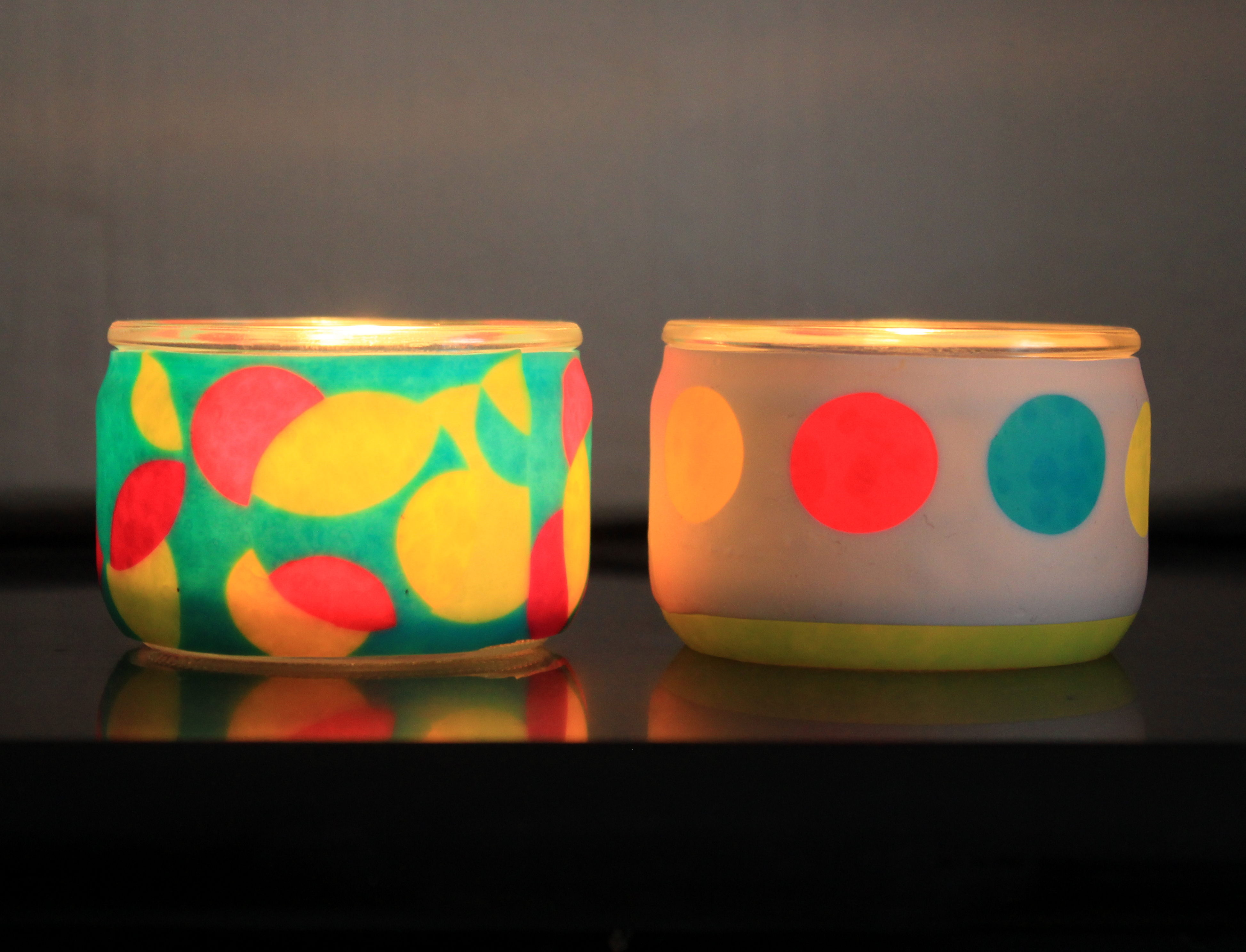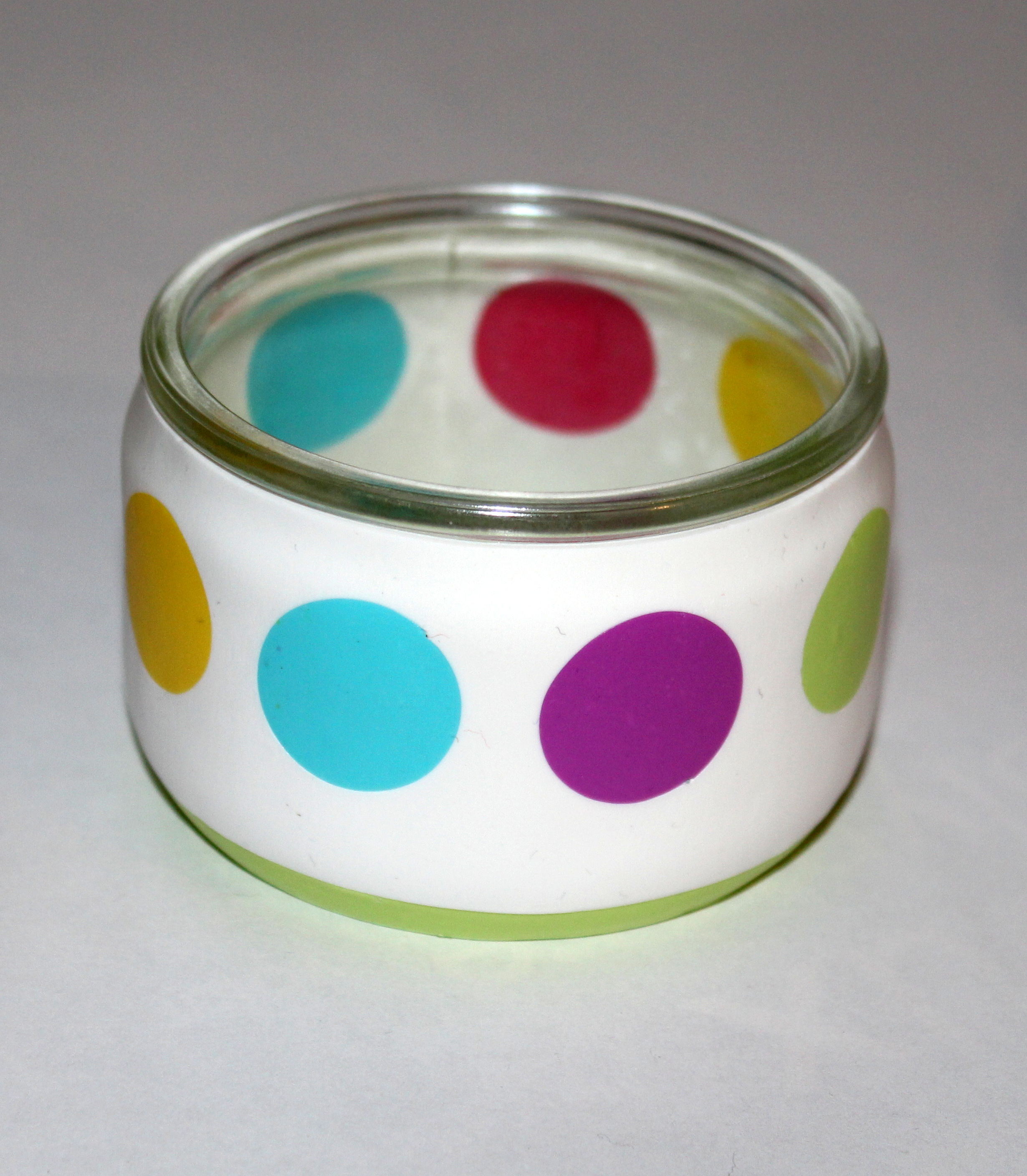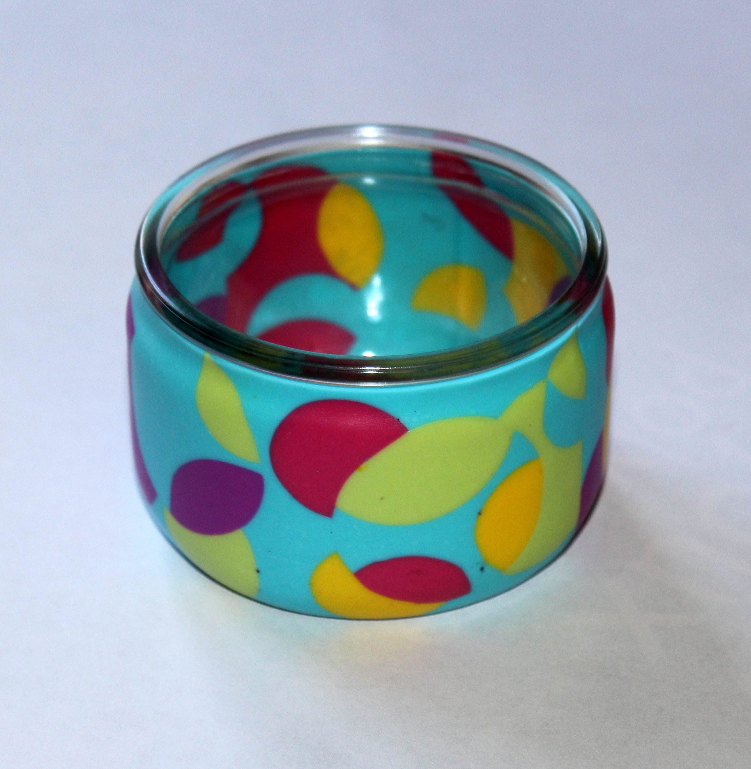 Une fois mon petit photophore terminé, j’ai eu envie d’en faire un plus régulier avec comme fond de la pâte opaque, cette fois. Je l’ai choisie blanche et j’aime beaucoup le résultat, en revanche, lorsqu’on décide de faire un motif régulier comme la succession de petits ronds ici, il est difficile de prévoir pile-poil la répartition des ronds pour être sûr que cela soit harmonieux une fois appliqué sur le pot. En tout cas, j’aime assez.