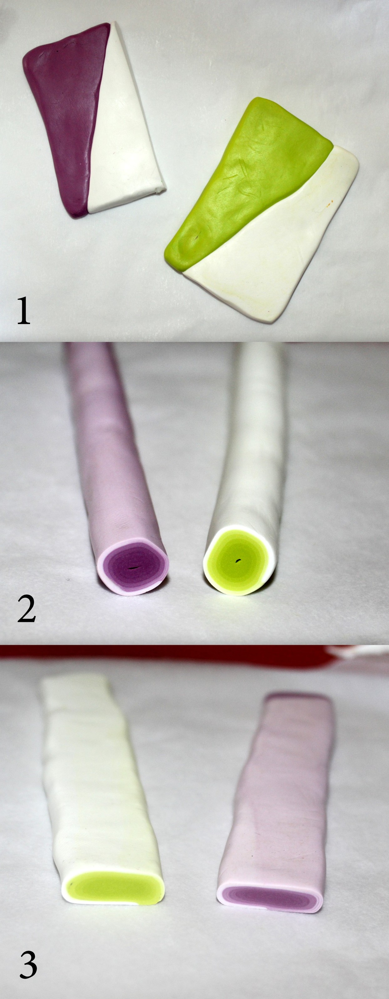 Photos 1, 2 et 3 : Réalisez deux canes dégradées (rappel pour la cane dégradée ici) violette et verte en plaçant la couleur au centre. Étirez et aplatissez-les.