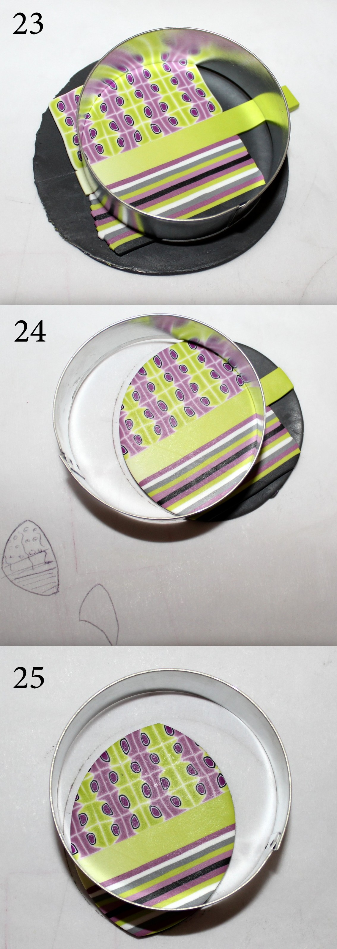 Photos 23, 24 et 25 : Saisissez-vous du plus gros des emporte-pièces ronds et découpez votre pendentifs. Pour vous aider, n’hésitez pas à schématiser le résultat que vous recherchez au crayon à côté.