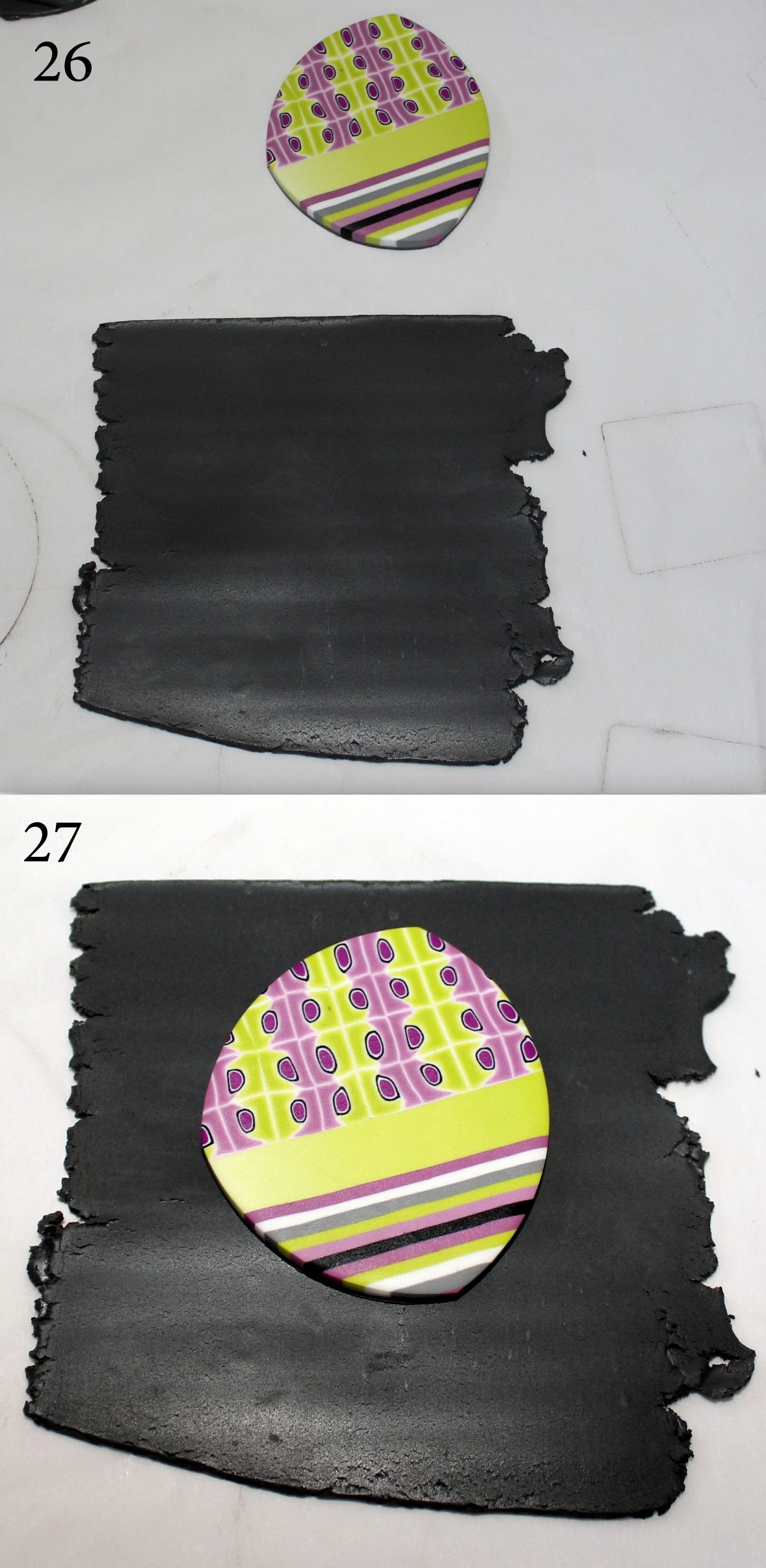 Photos 26 et 27 : Préparez une plaque unie de la même couleur que le dos et découpez la même forme que votre pendentif.