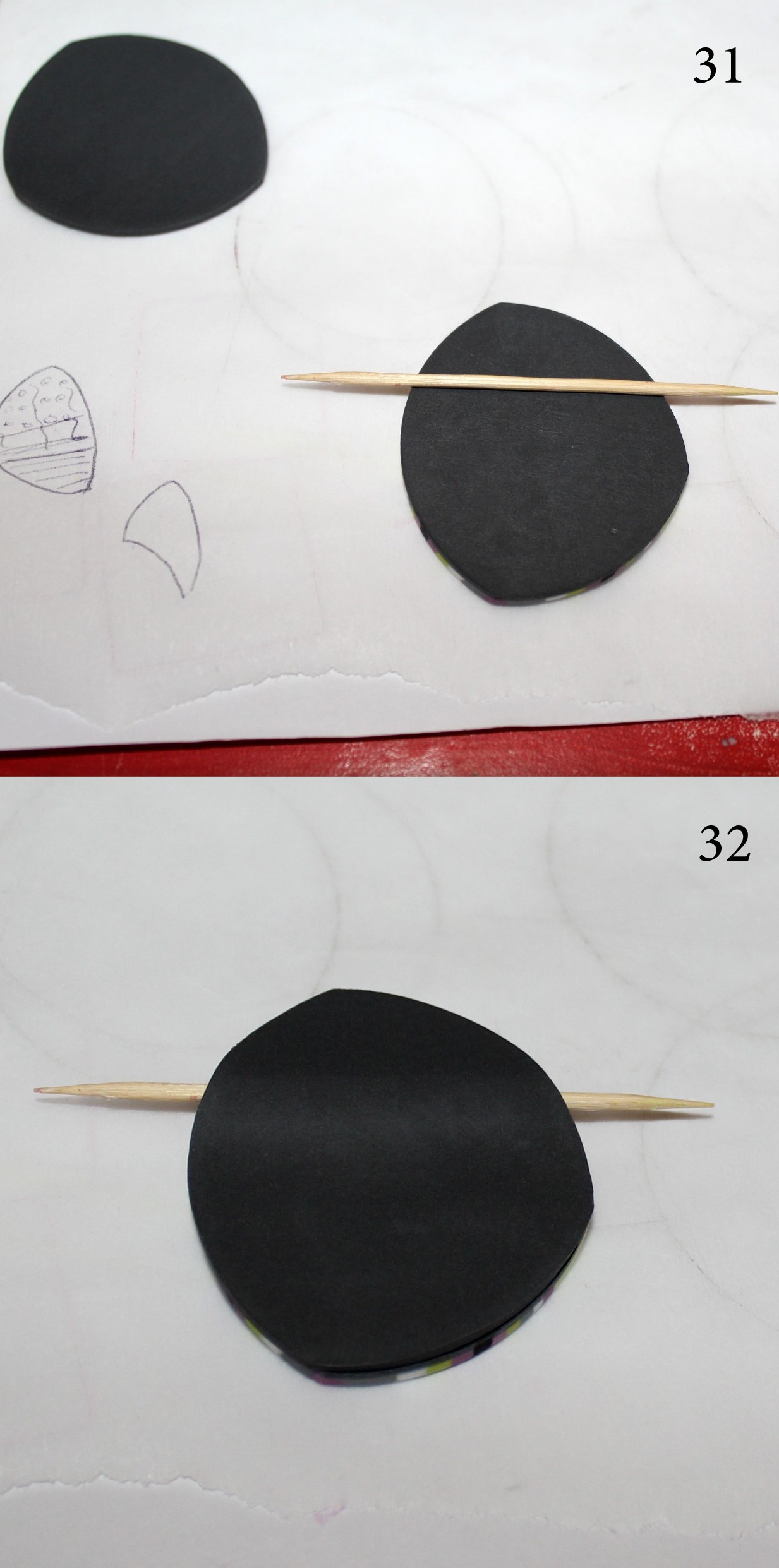 Photos 31 et 32 : Pfffffffff, on en est déjà à la photo 32 ? ! ! ! Je vous préviens, je ne ferai pas de tutos aussi détaillés très souvent… Bref, décollez vos deux formes et retournez celle qui a les motifs. Placez un cure-dent là où passera le cordon et recouvrez le tout avec la seconde forme que vous ferez bien adhérer.