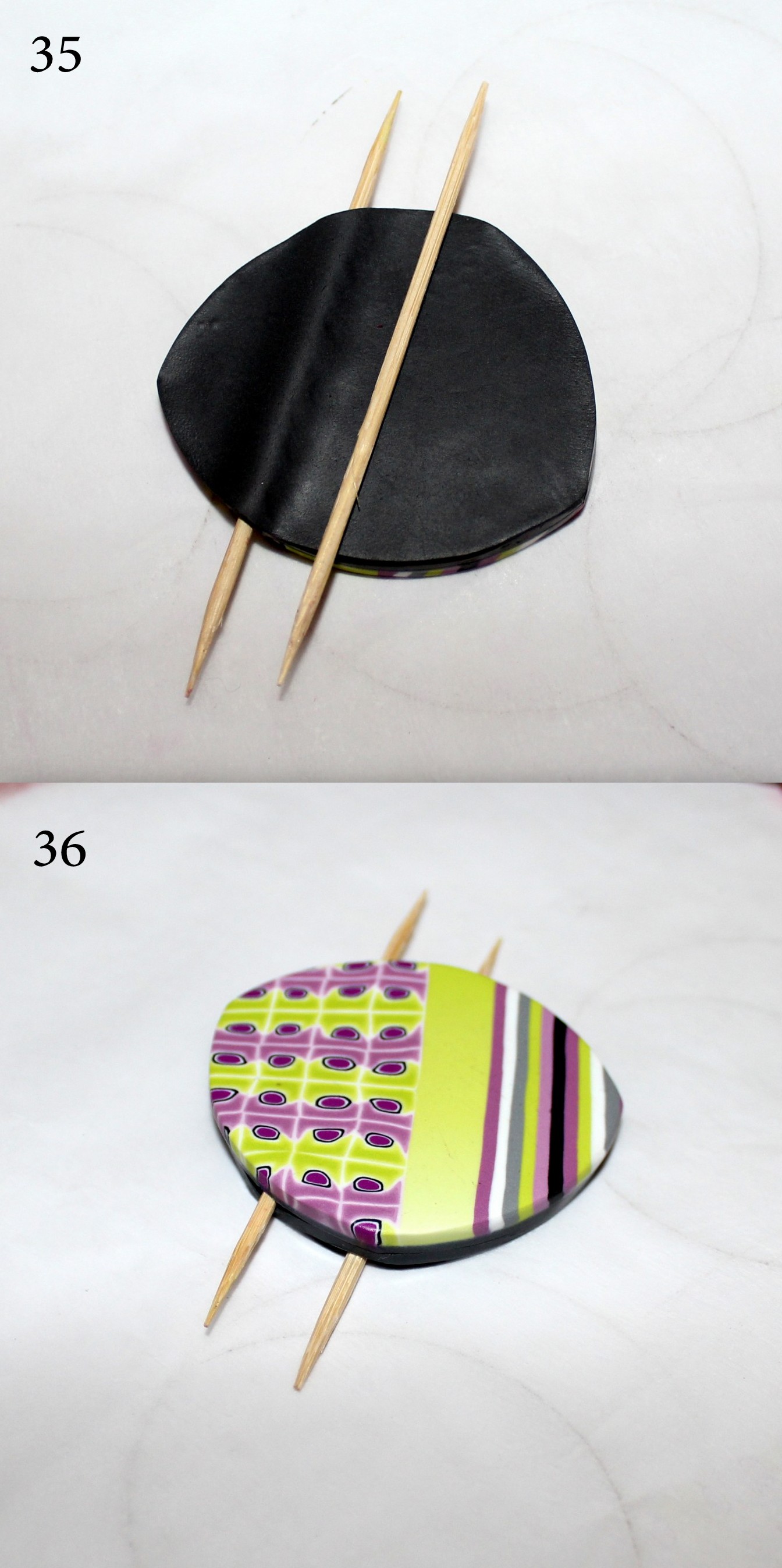 Photos 35 et 36 : Pour ma part, j’ai pris l’habitude de placer un second cure-dent sous le pendentif pour la cuisson. Il me permet d’appuyer un peu aux extrémités pour donner à ma pièce une forme légèrement courbe.