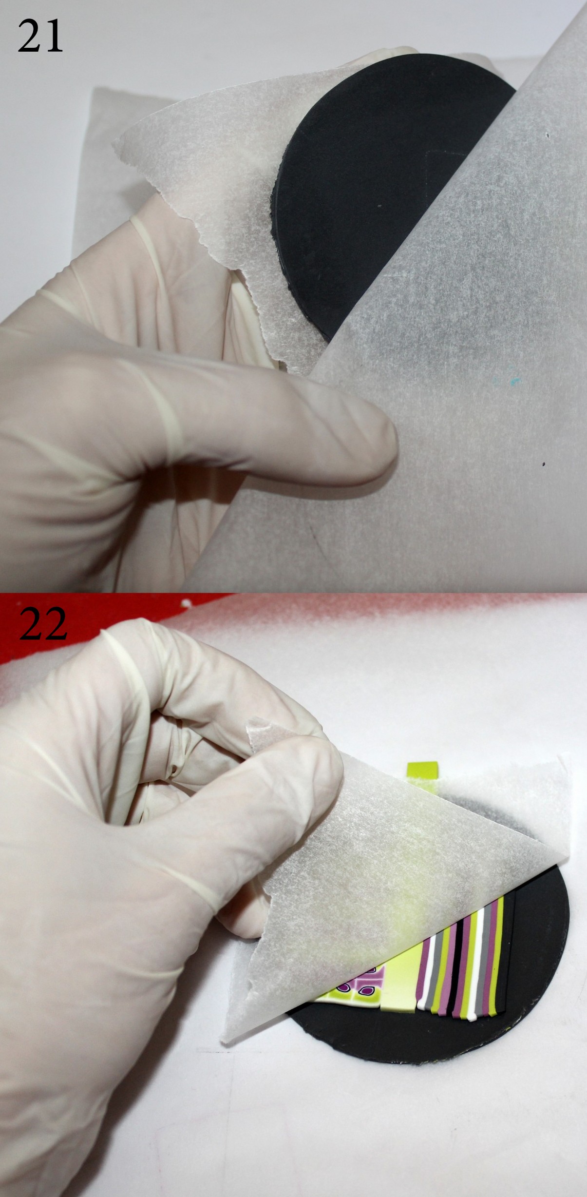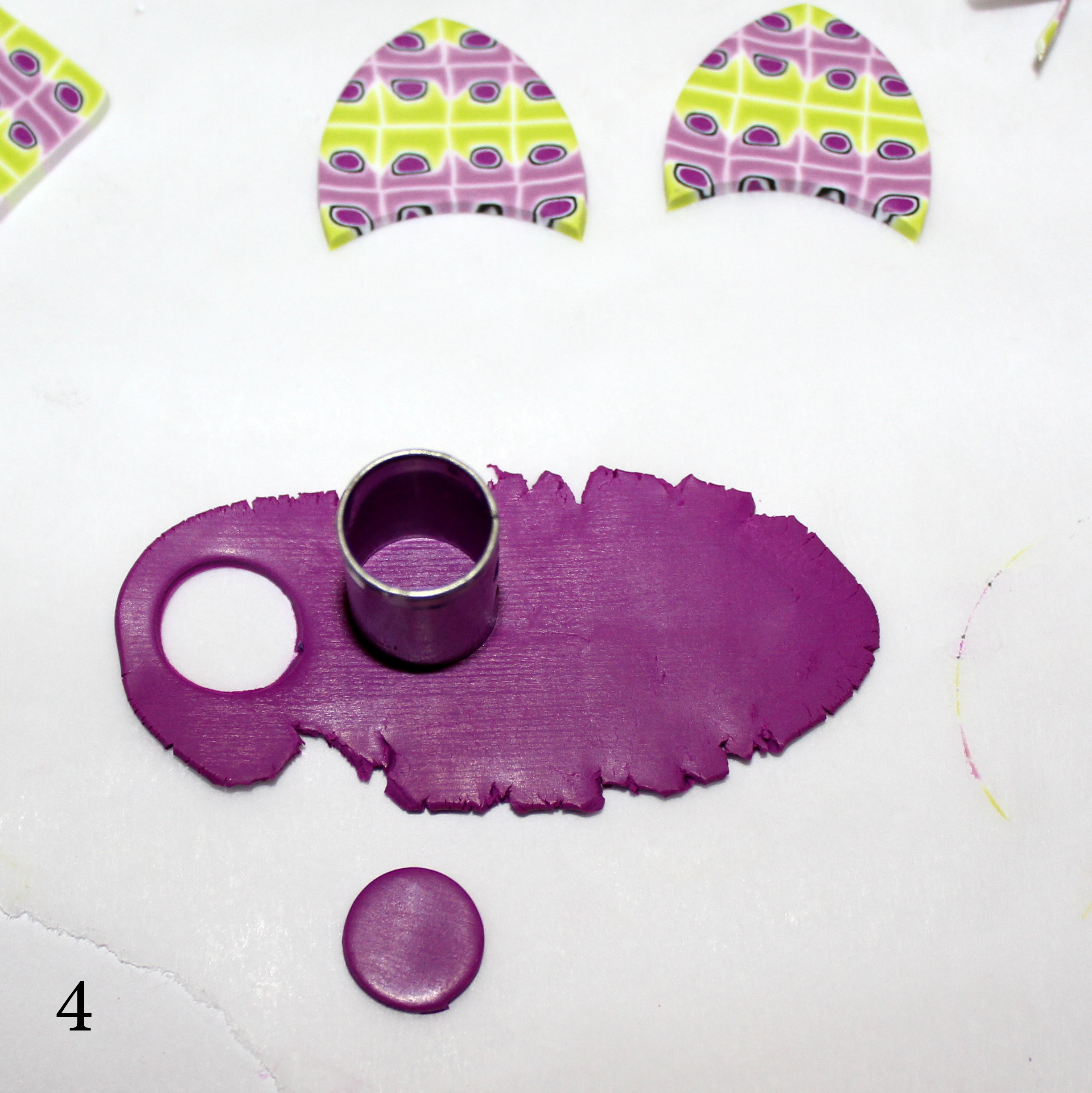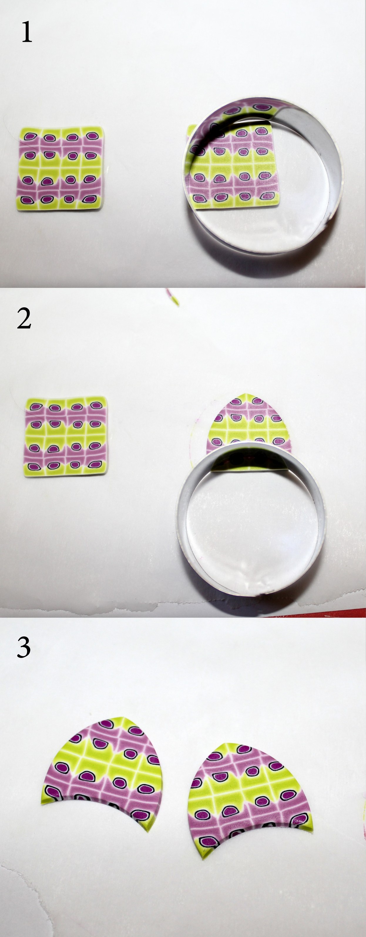 Photos 1, 2 et 3 : Coupez deux tranches de la cane à motifs. Lissez-les bien à travers du papier sulfu pour obtenir une surface propre et régulière et utilisez de nouveau l’emporte-pièce rond afin de donner la forme de la photo n°3.