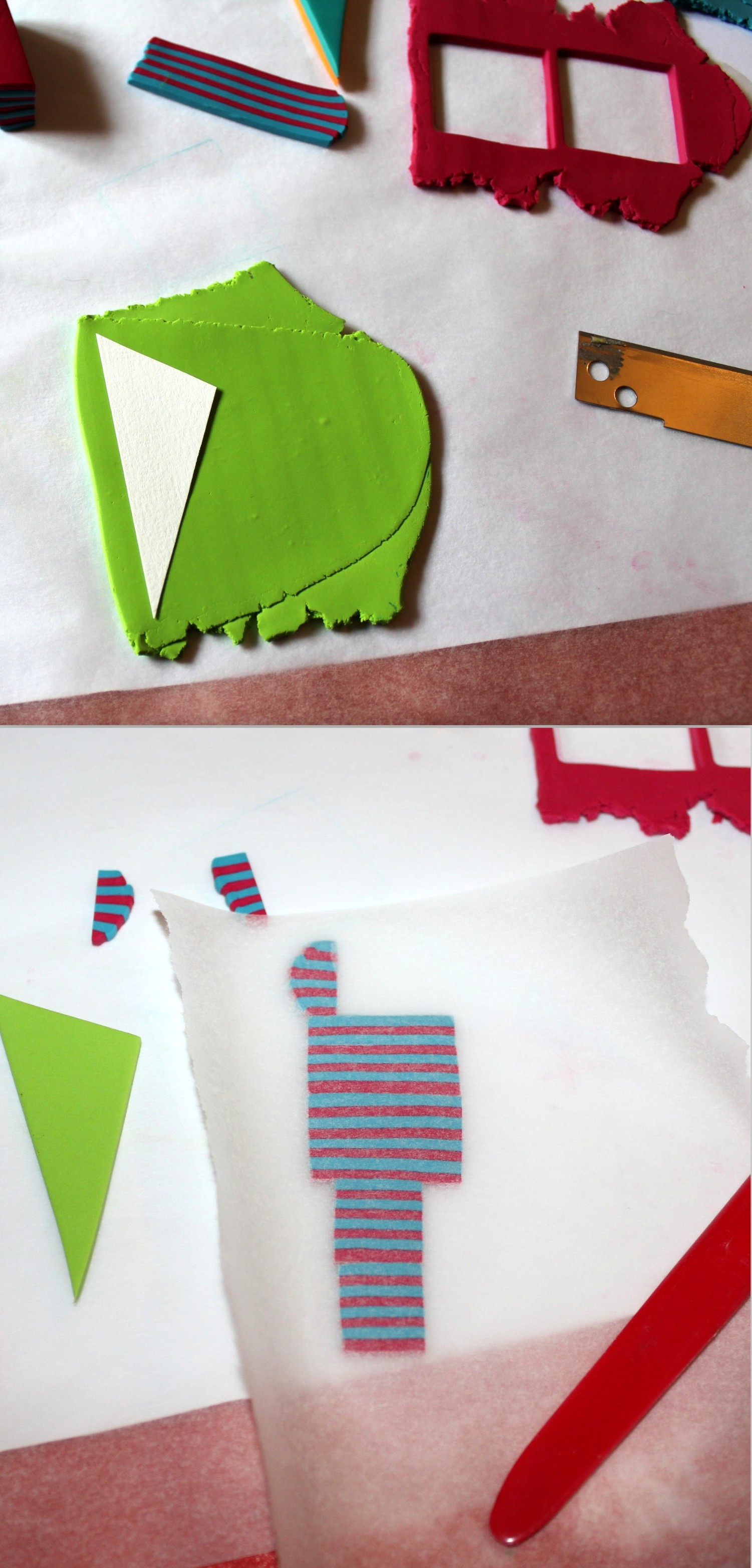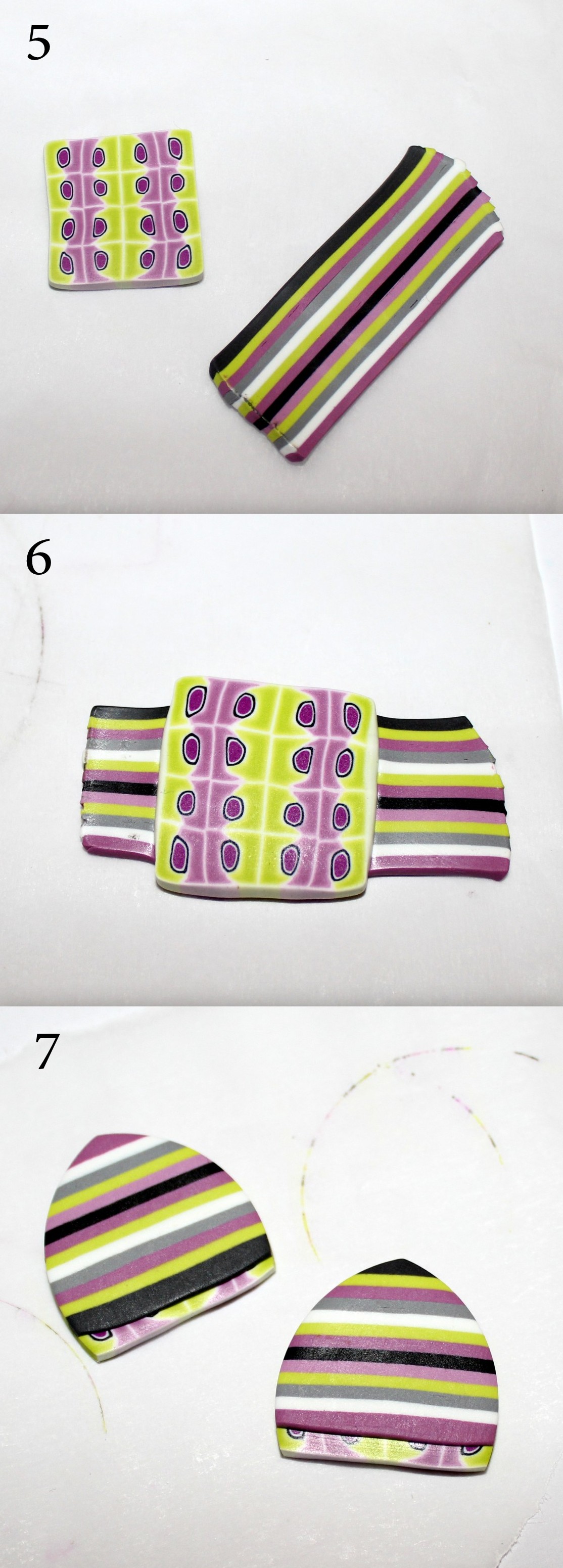 Photos 5, 6 et 7 : Utilisez deux tranches de cane à motifs et deux bandes à rayures. Collez-les l’une contre l’autre en lissant bien à travers du papier sulfurisé (ne les repasser pas dans la machine) et procédez de nouveau à une découpe à l’emporte-pièce.