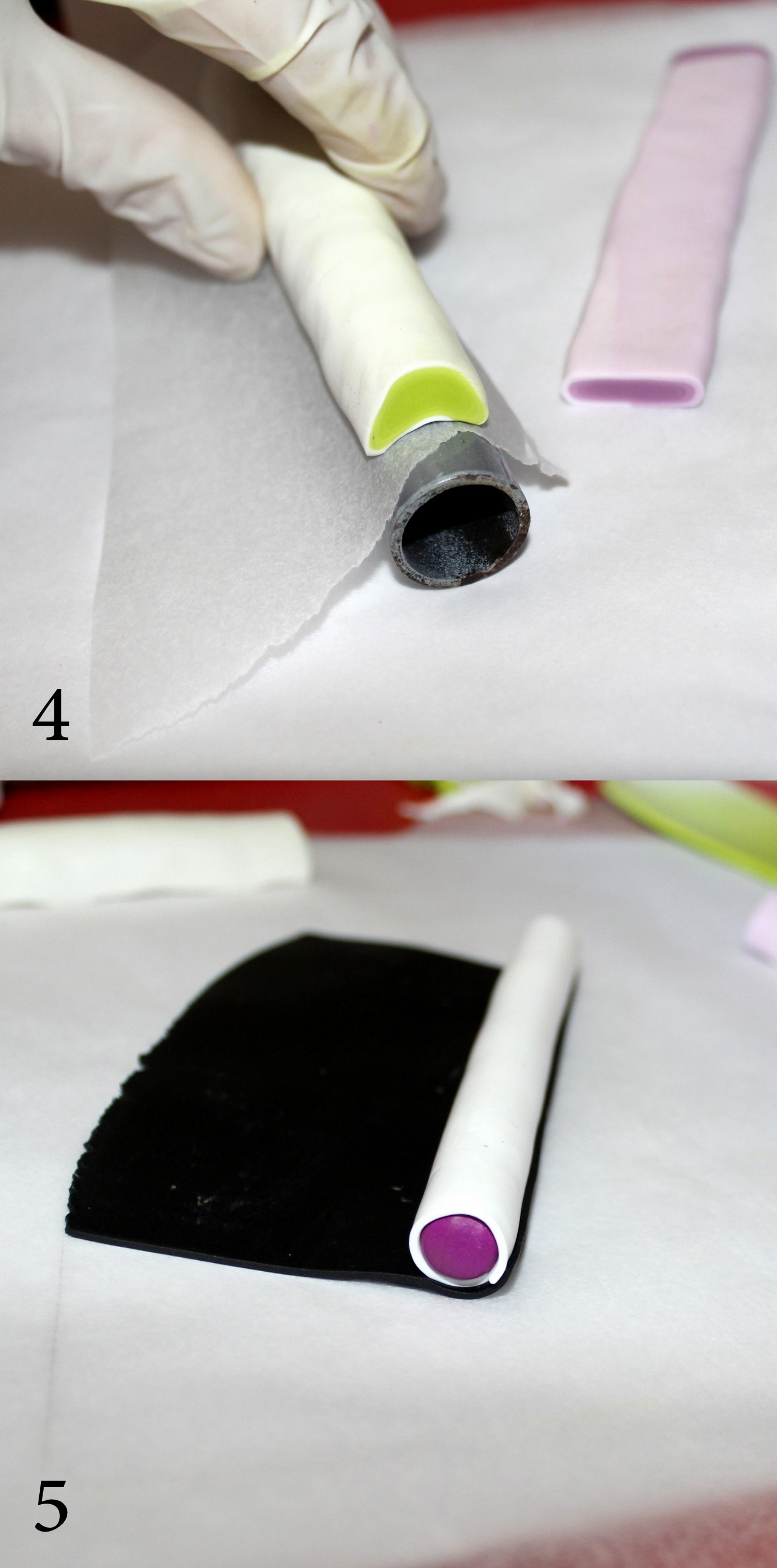 Photos 4 et 5 : Courbez les deux canes dégradées en vous aidant d’un rouleau. (Pensez à le recouvrir de papier sulfurisé afin de pouvoir le retirer sans serrer les dents). Préparez une cane-cible simple avec une couleur un peu plus flashi au cœur, ici, du fushia.