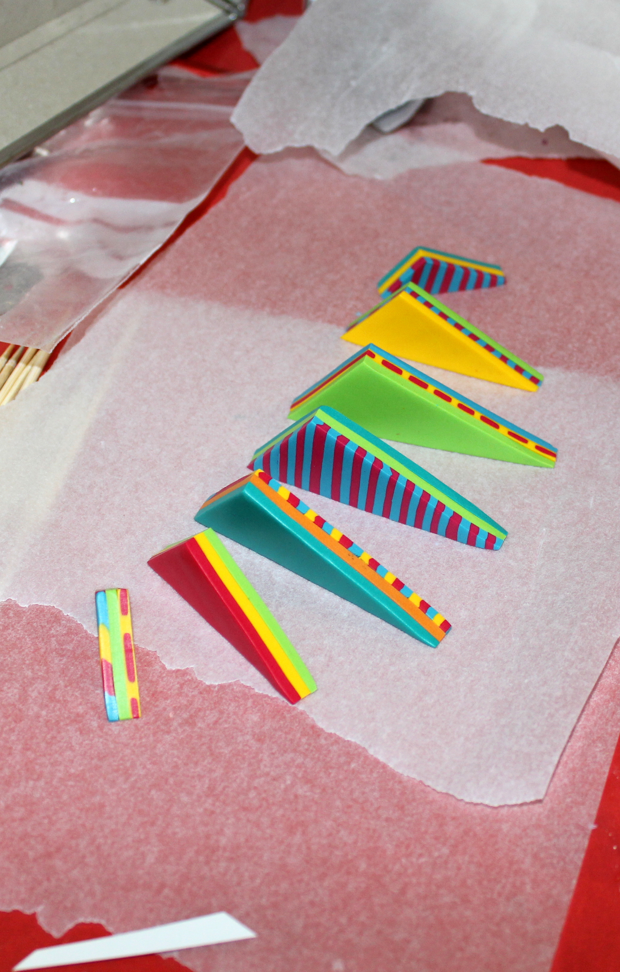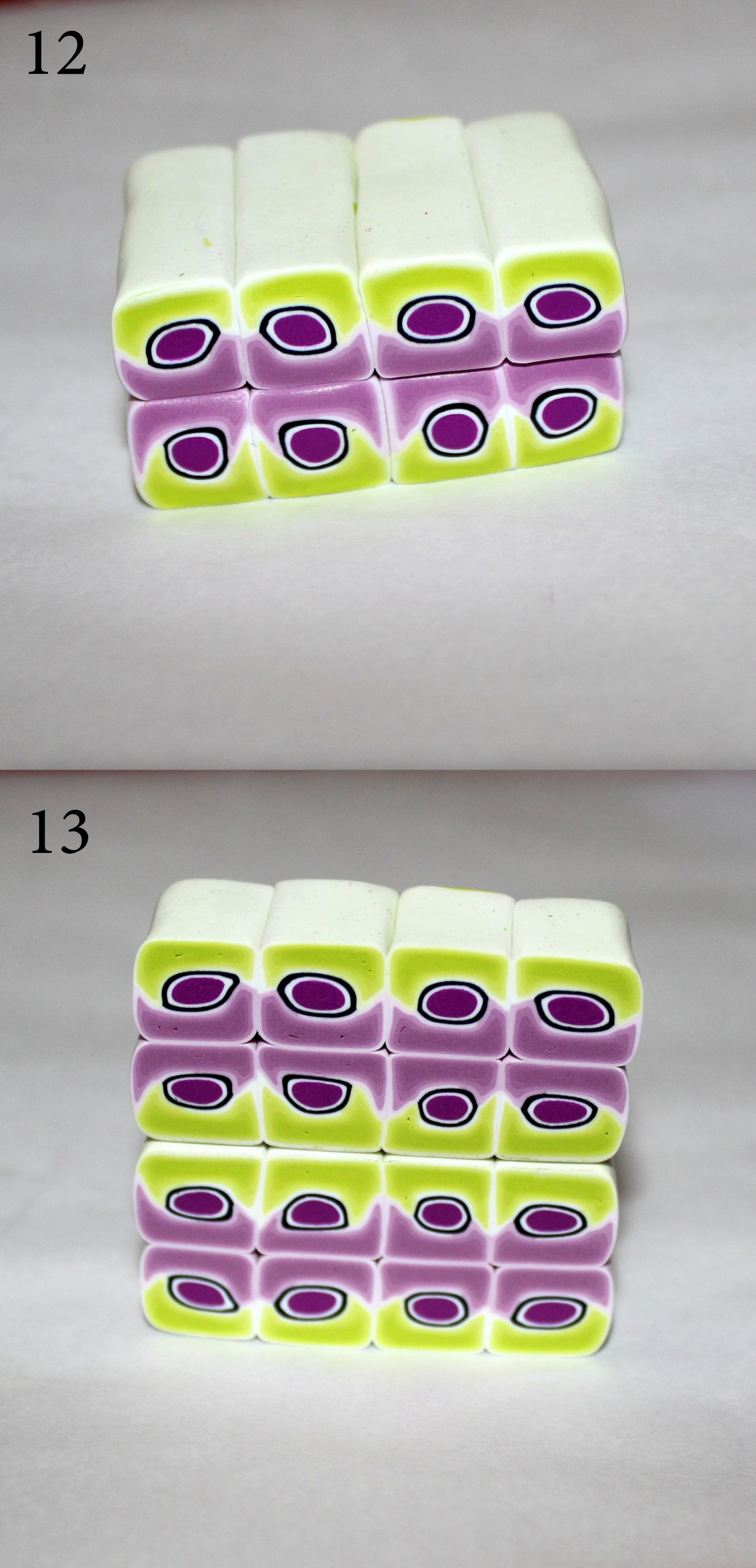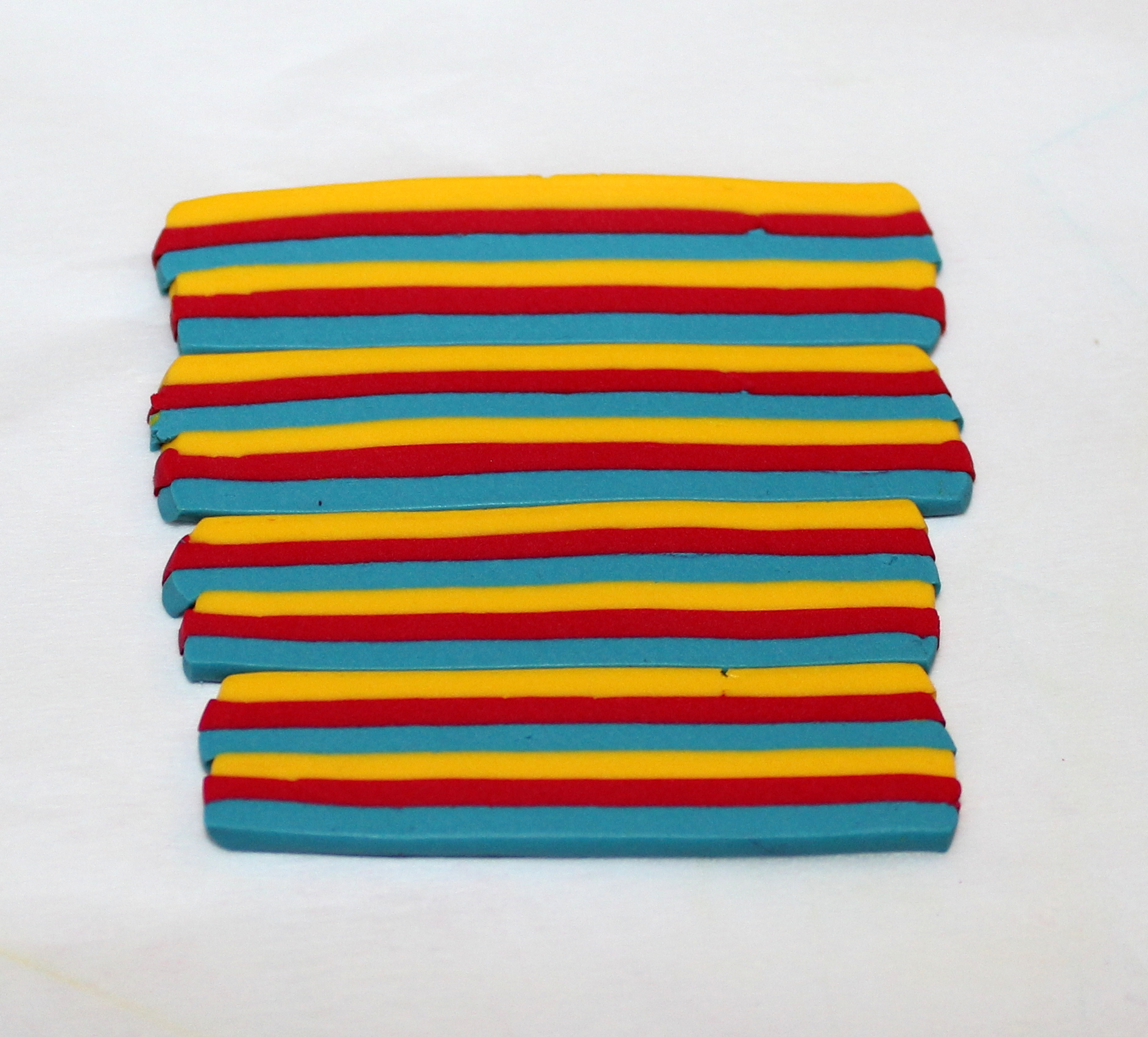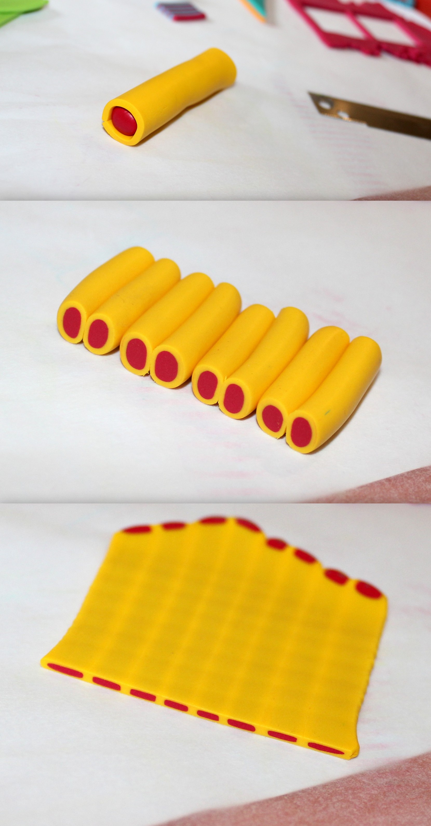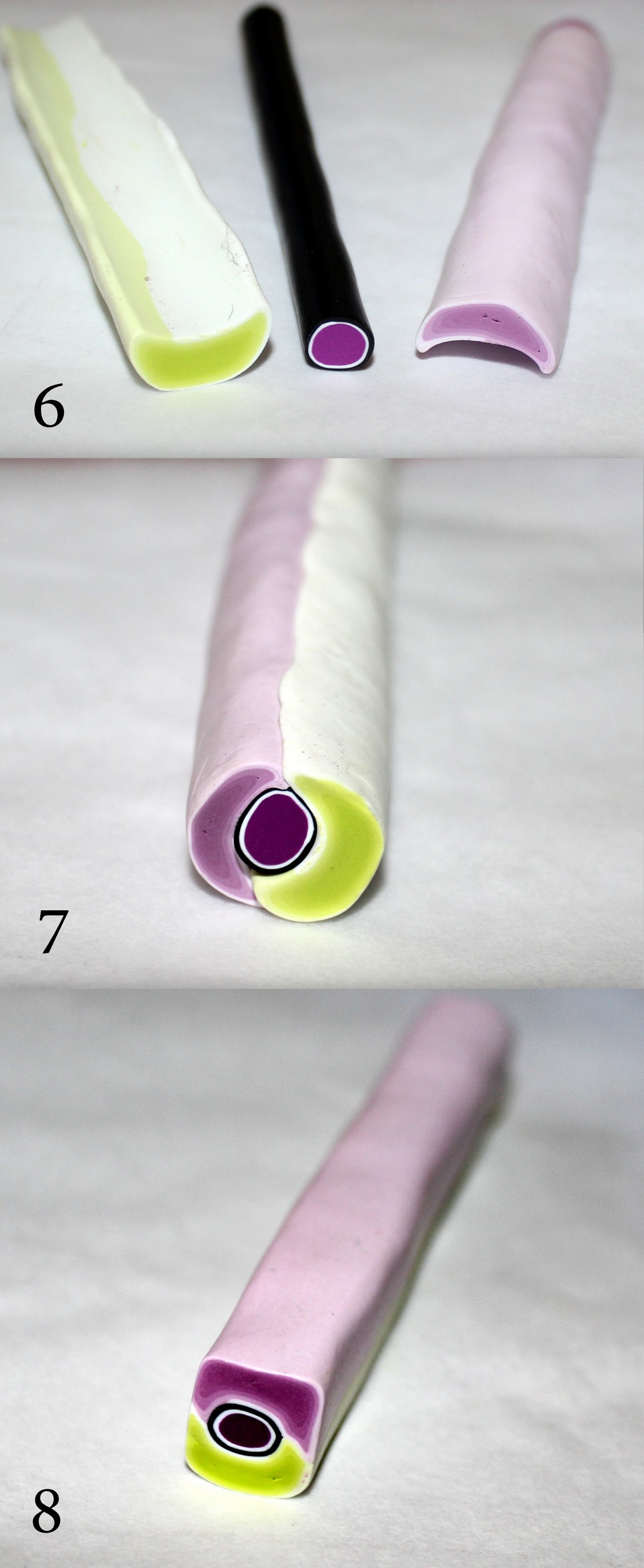Photos 9, 10 et 11 : Étirez proprement votre cane et coupez-en quatre tronçons. Assemblez-les en situant les couleurs du même côté. Modelez un peu tout ça et coupez en deux pour faire une deuxième rangée.