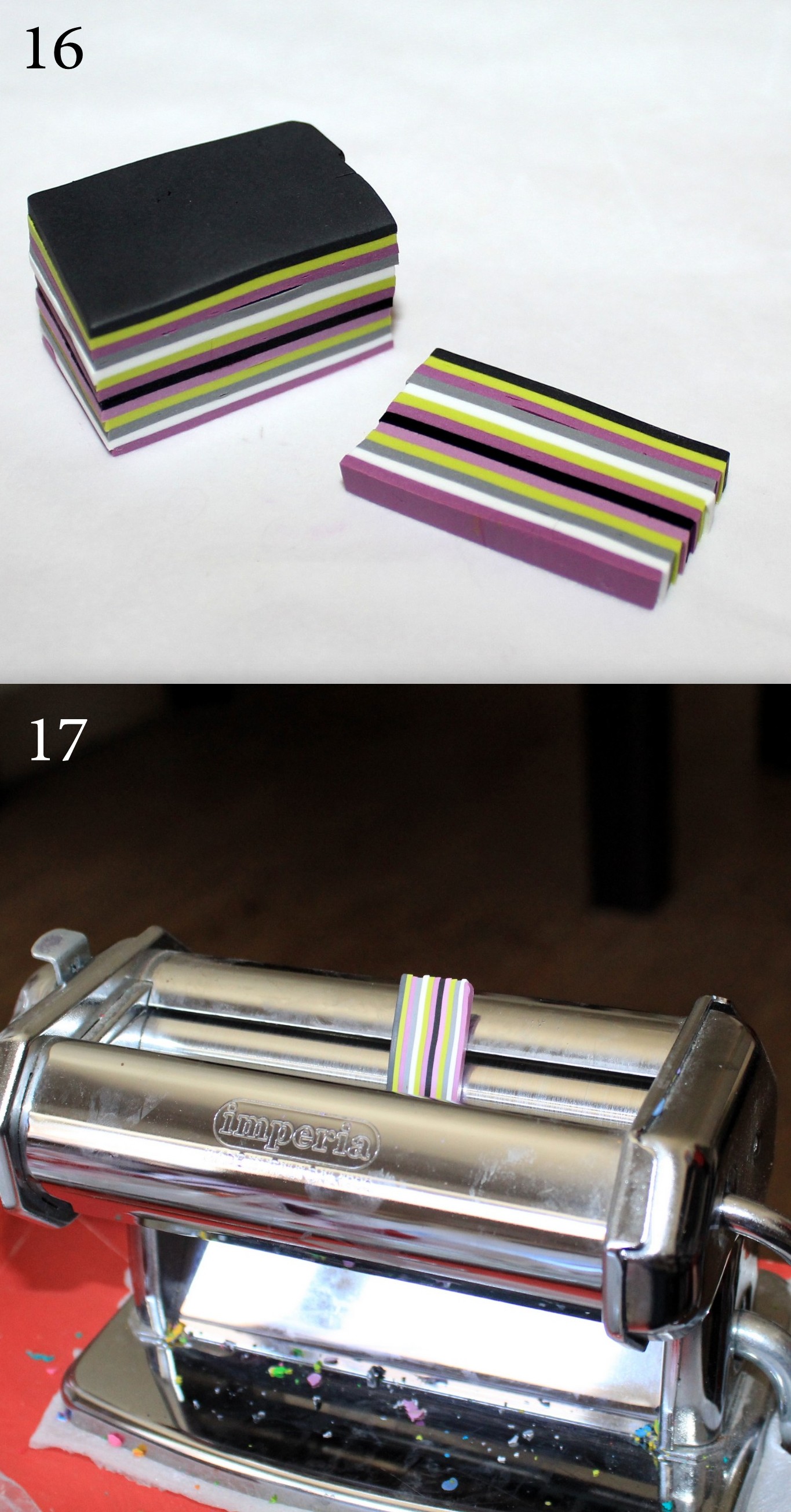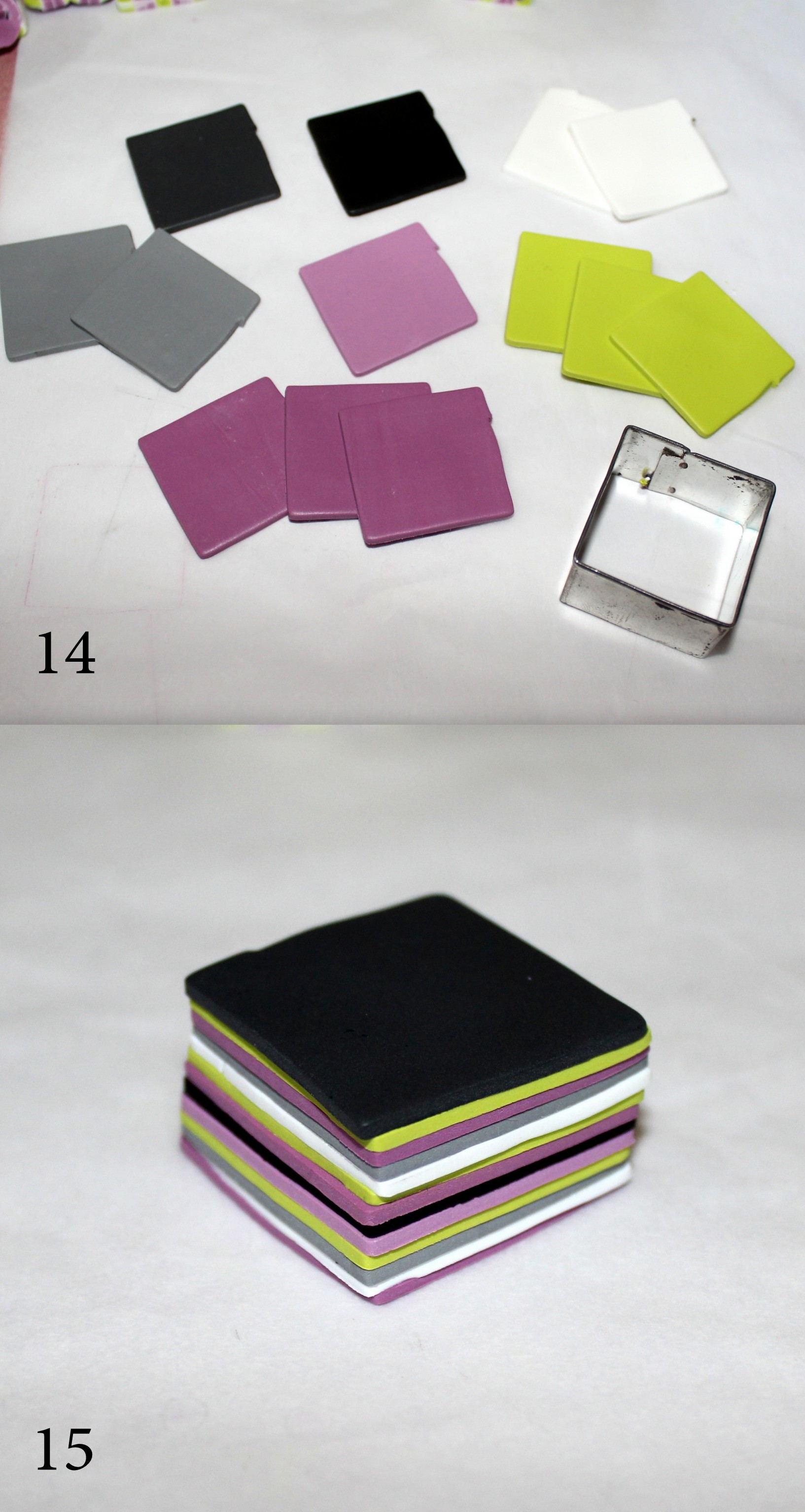 Photos 14 et 15 : Mettez votre bôôôôté de cane de côté et préparez un bloc rayé. Pour ce faire, comme je l’ai déjà mentionné dans l’article précédent, sélectionnez vos couleurs et faites-en des plaques dans lesquelles vous découperez des carrés à l’emporte-pièce. Superposez ces plaques dans l’ordre qui vous plait en prenant garde de ne pas mettre les mêmes couleurs au-dessus et au-dessous pour le cas où vous auriez besoin de dupliquer votre bloc.