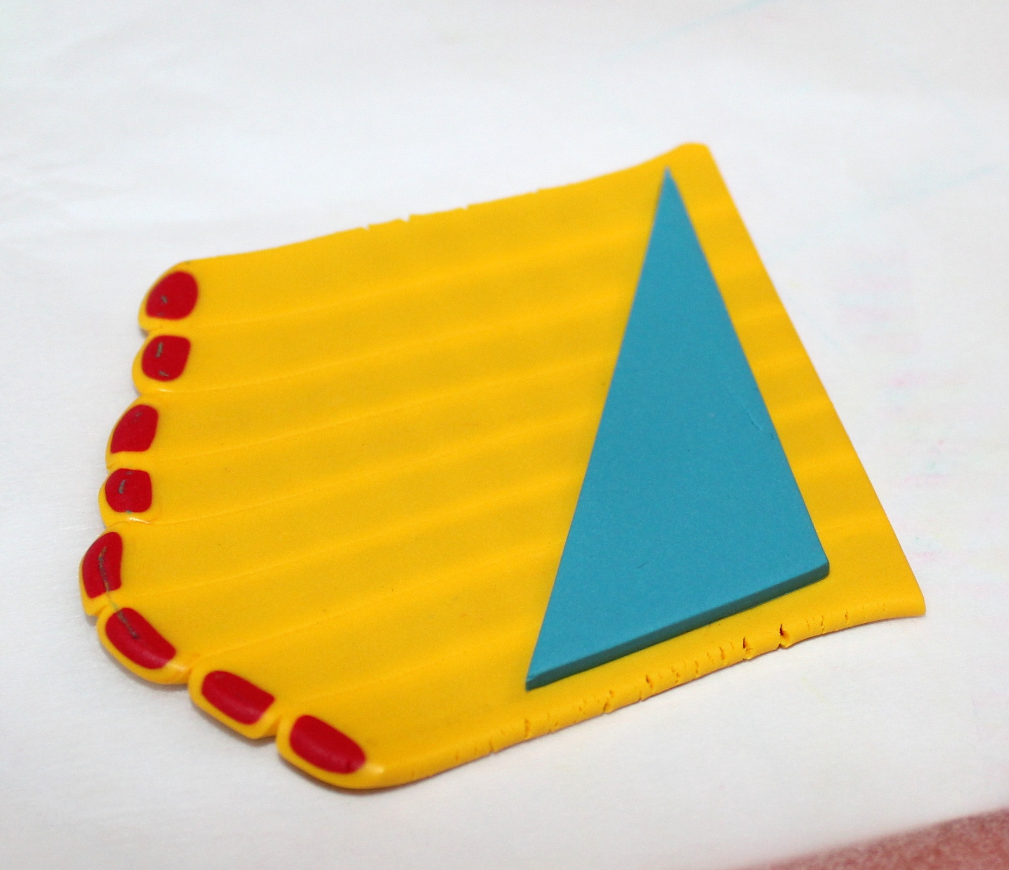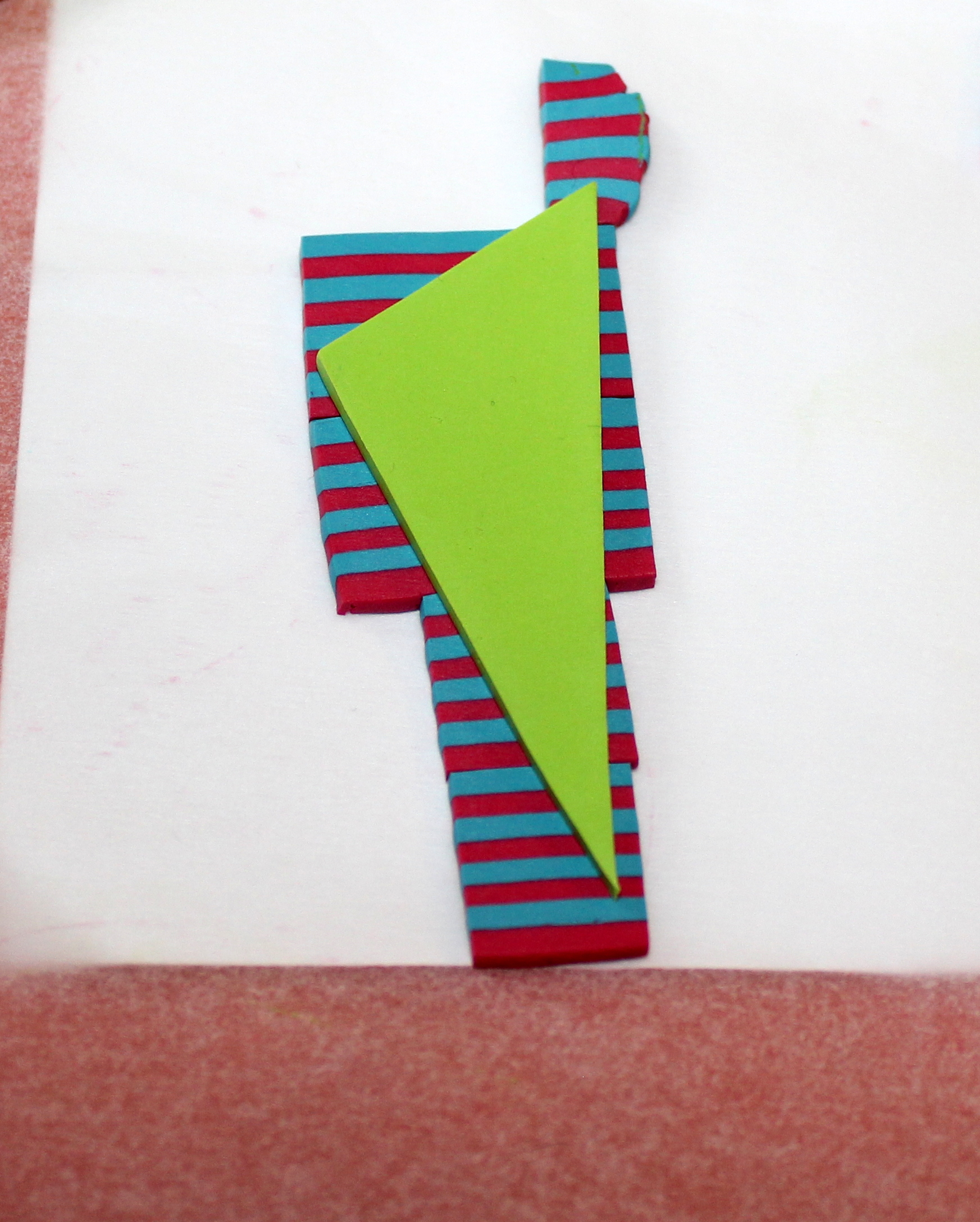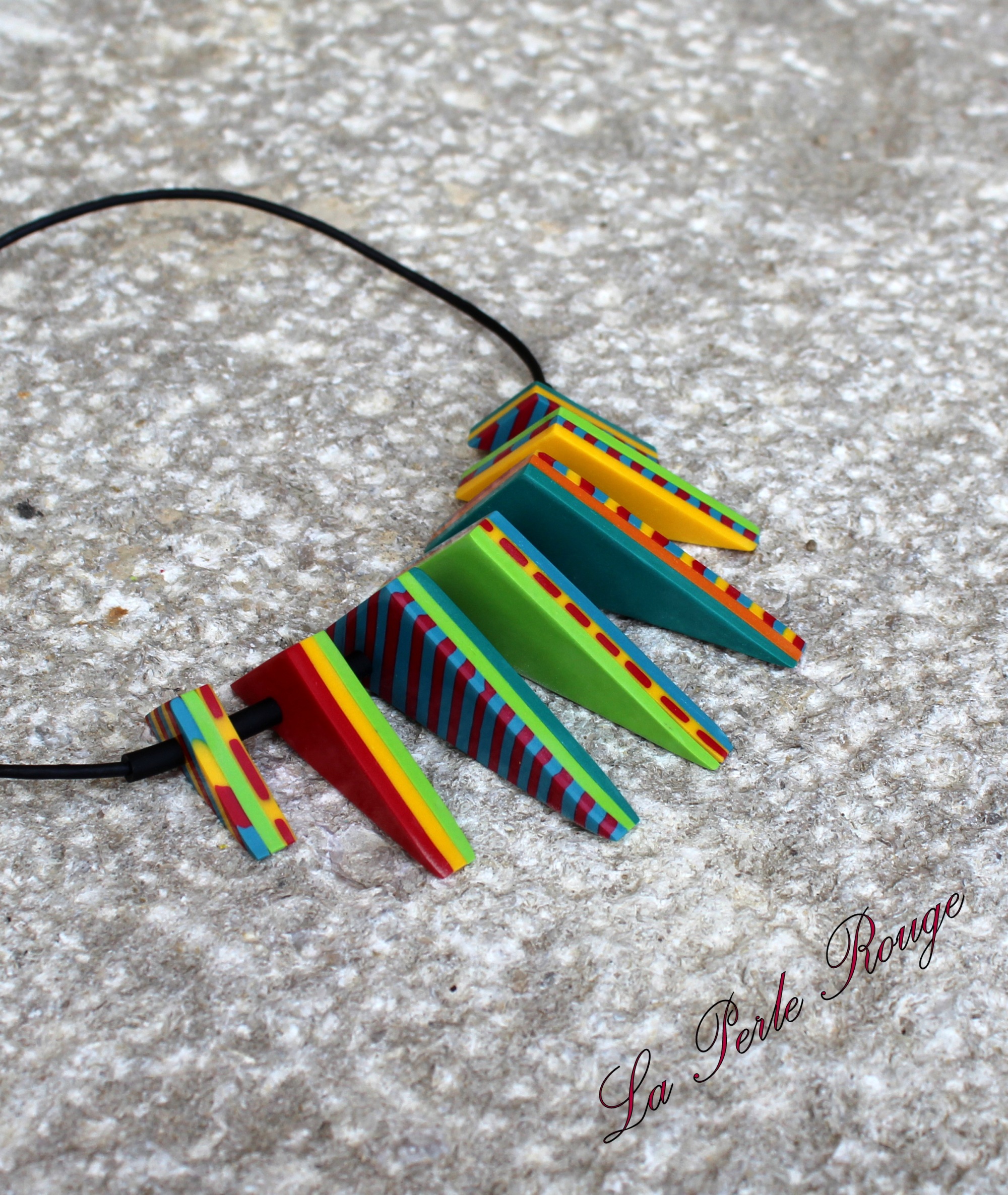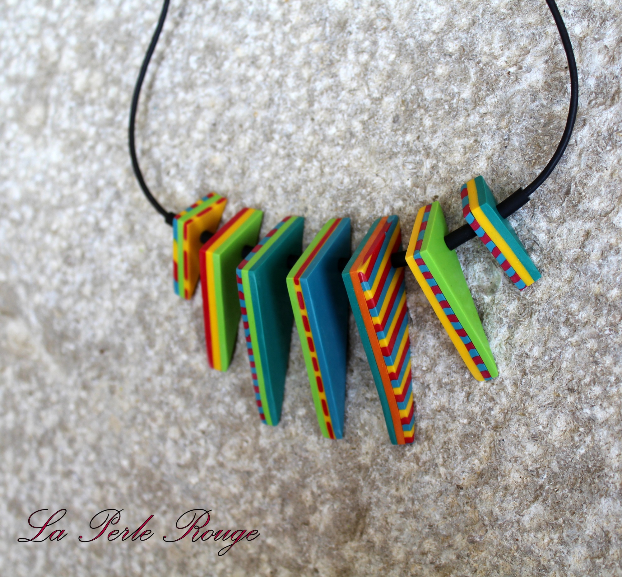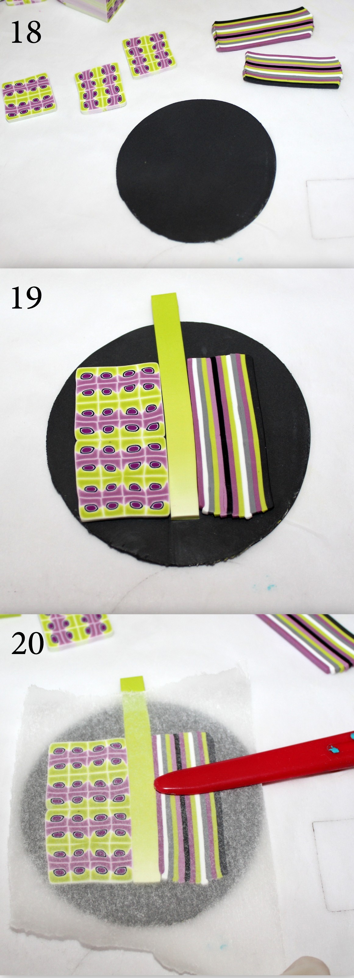 Photos 18, 19 et 20 : Il est temps d’exploiter tout ça afin de réaliser votre pendentif. Découpez proprement des tranches de la cane à motifs de la même épaisseur si possible que celle des bandes rayées. (Ne passez SURTOUT pas une tranche de cane à motifs dans la machine pour faire comme avec les rayures et obtenir une épaisseur régulière !!! ) Assemblez vos tranches comme sur la photo 19. J’ai choisi d’aérer le pendentif en insérant une petite bande dégradée que j’avais mis de côté au tout début mais c’est vous qui voyez. Lissez le tout à travers du papier sulfurisé afin de gommer les jointures.