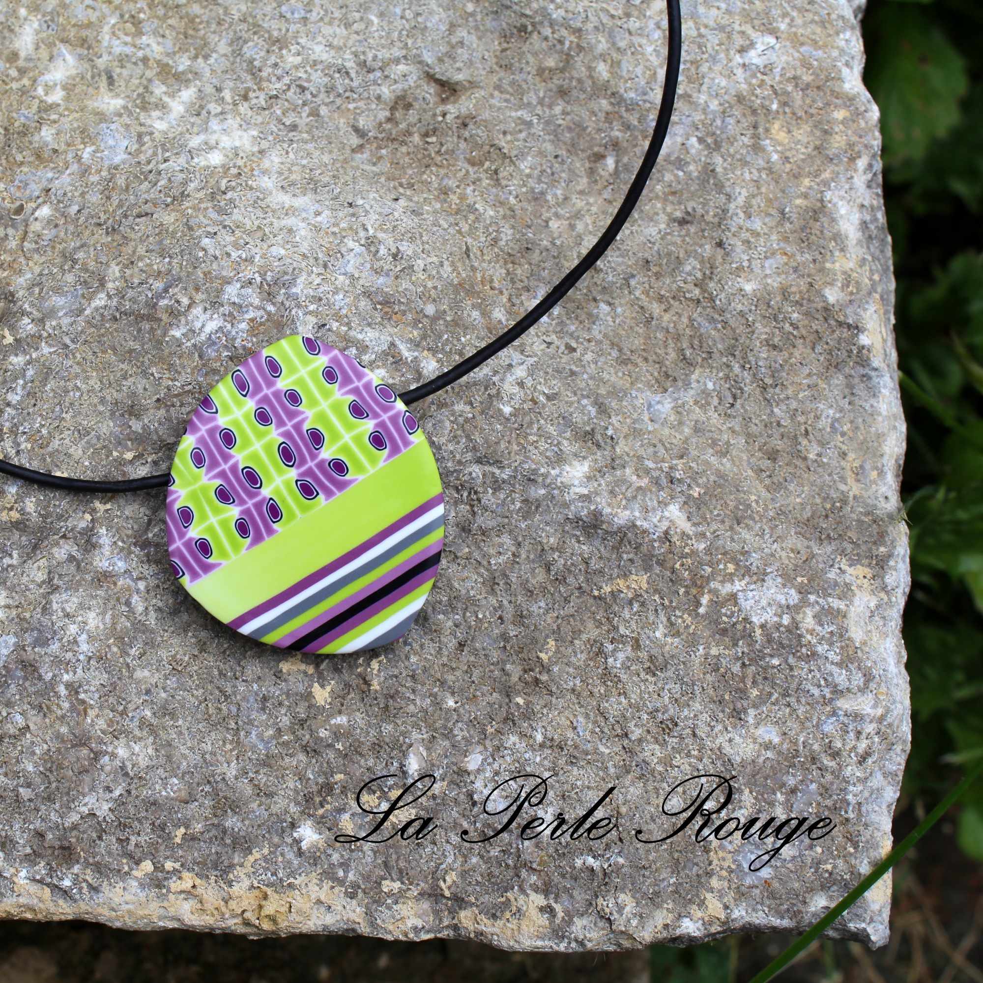 - Pâtes polymères vert pomme, violet, blanc, un peu de fushia, de rose pâle et de noir. Sans oublier un uni pour le dos (ici, mélanges de chutes de canes noires et de couleurs pâles qui ont donné du gris foncé)