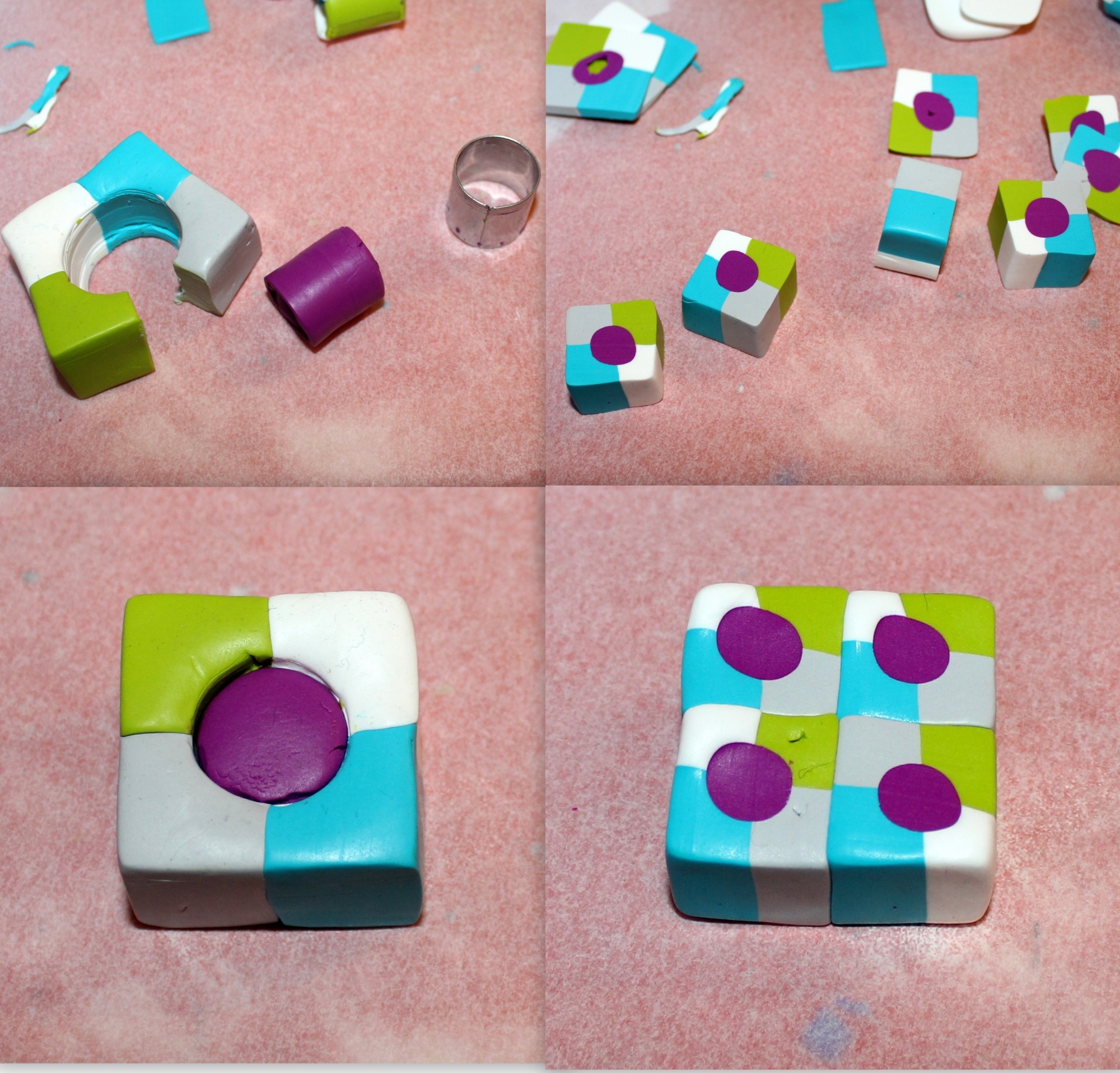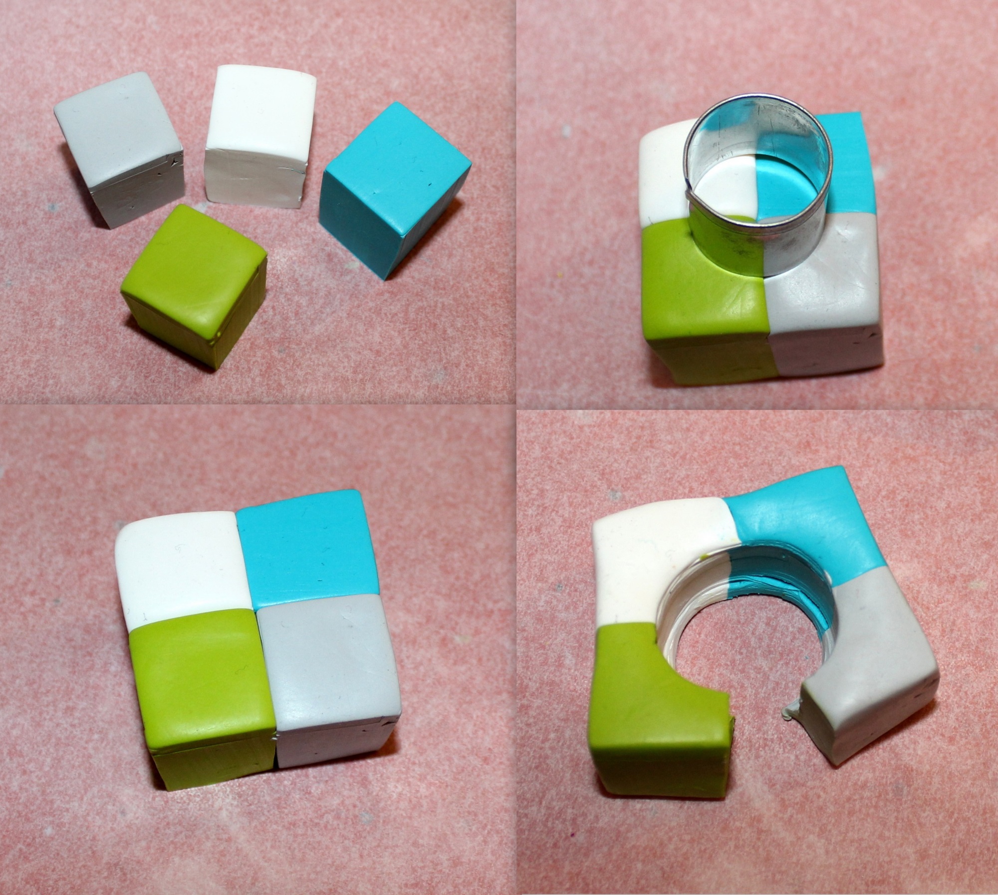 Comme on le constate déjà ici, le problème se pose à la réduction (Tient ? original, dis donc !) Les lignes bien droites se déforment et mes carreaux ne s’alignent pas correctement. Vous savez pourquoi ? Bon, sans doute un peu parce que ma réduction n’était pas assez précise mais surtout parce que mes couleurs n’avaient pas été travaillées de la même façon et qu’elles n’avaient pas du tout la même malléabilité ! Le turquoise sort directement de son emballage et est assez dur alors que le gris et le vert ont été obtenus par mélanges. Quant au blanc, il s’agit d’un Fimo Soft très souple qui s’est systématiquement enfui des extrémités de la cane à chaque étape de la réduction. Cela se voit très bien sur la dernière photo, on dirait qu’il y a beaucoup moins de matière blanche de que de turquoise. Peut-être cet enchaînement fonctionne-t-il si on place les cubes de départ au frigo durant un moment avant de les manipuler. En attendant, c’est un échec et j’ai placé, un peu énervée, ma cane sur le côté de mon plan de travail pour faire autre chose.