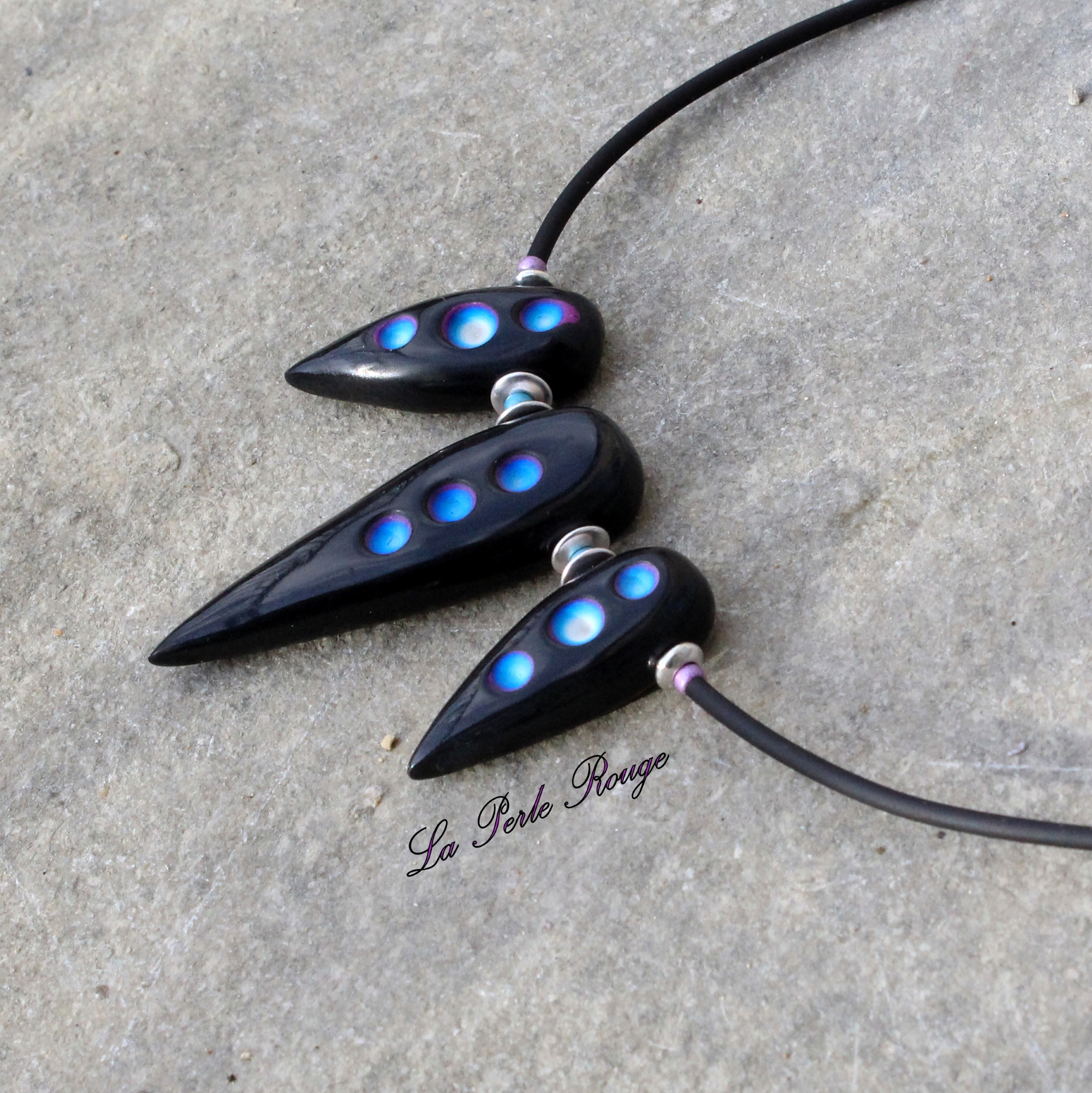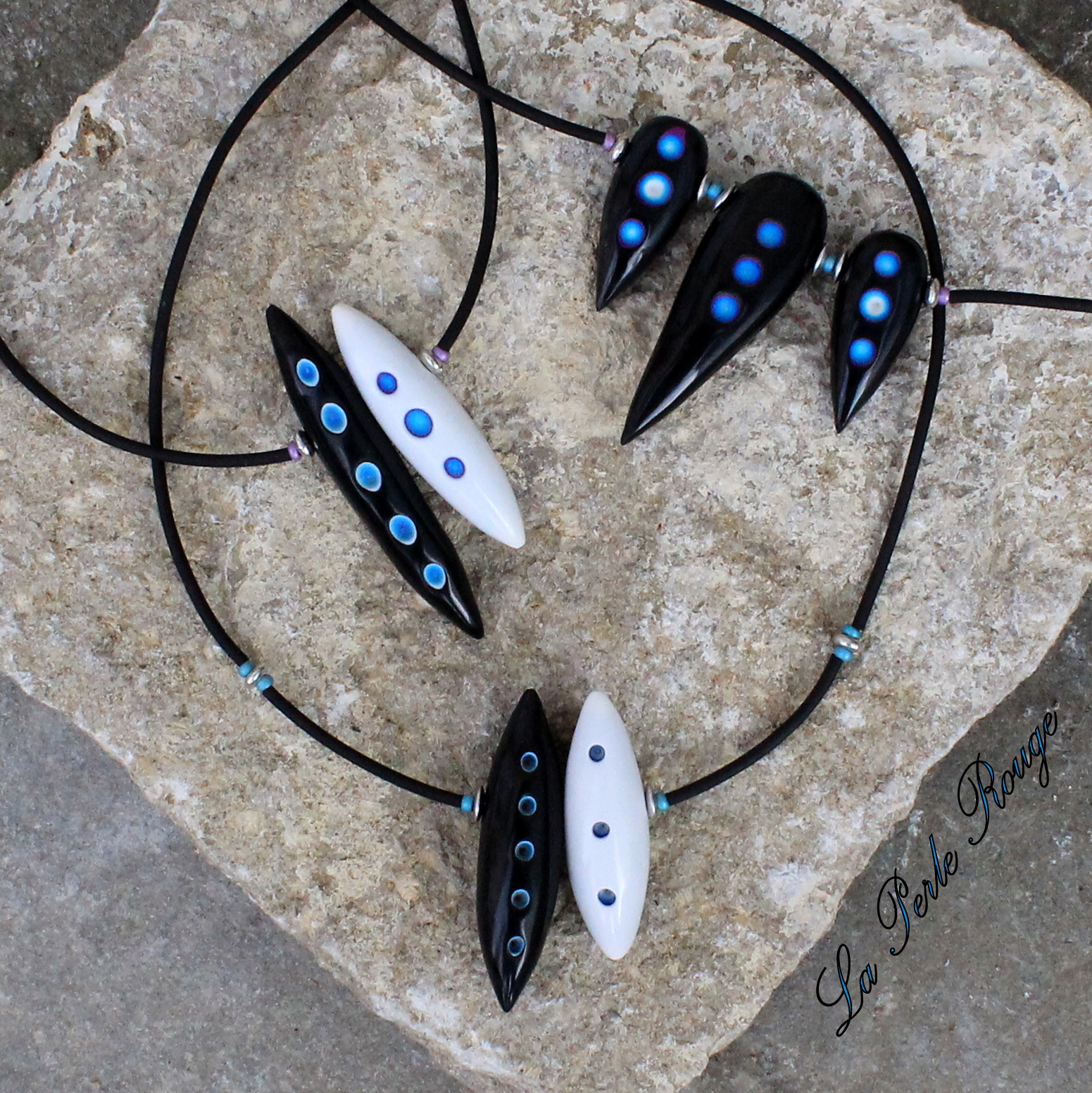Je ne suis pas satisfaite de mes montages… je les ai modifié mais mon problème c’est que j’ai percé avant de poncer et le fait est qu’on ne sait jamais tout à fait comment vont s’agencer des perles aussi différentes les unes des autres avant d’effectuer leur montage… et une fois qu’on comprend, c’est trop tard, elles sont déjà percées…