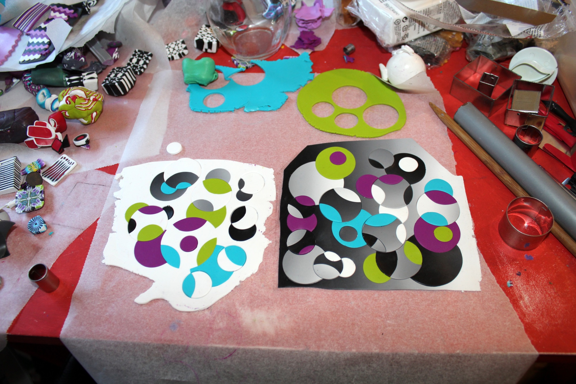 Toujours dans la même dynamique de géométrie brisée, je suis restée dans les mêmes couleurs et je me suis préparée deux plaques comme je les faisais régulièrement il y longtemps avec des emporte-pièces :