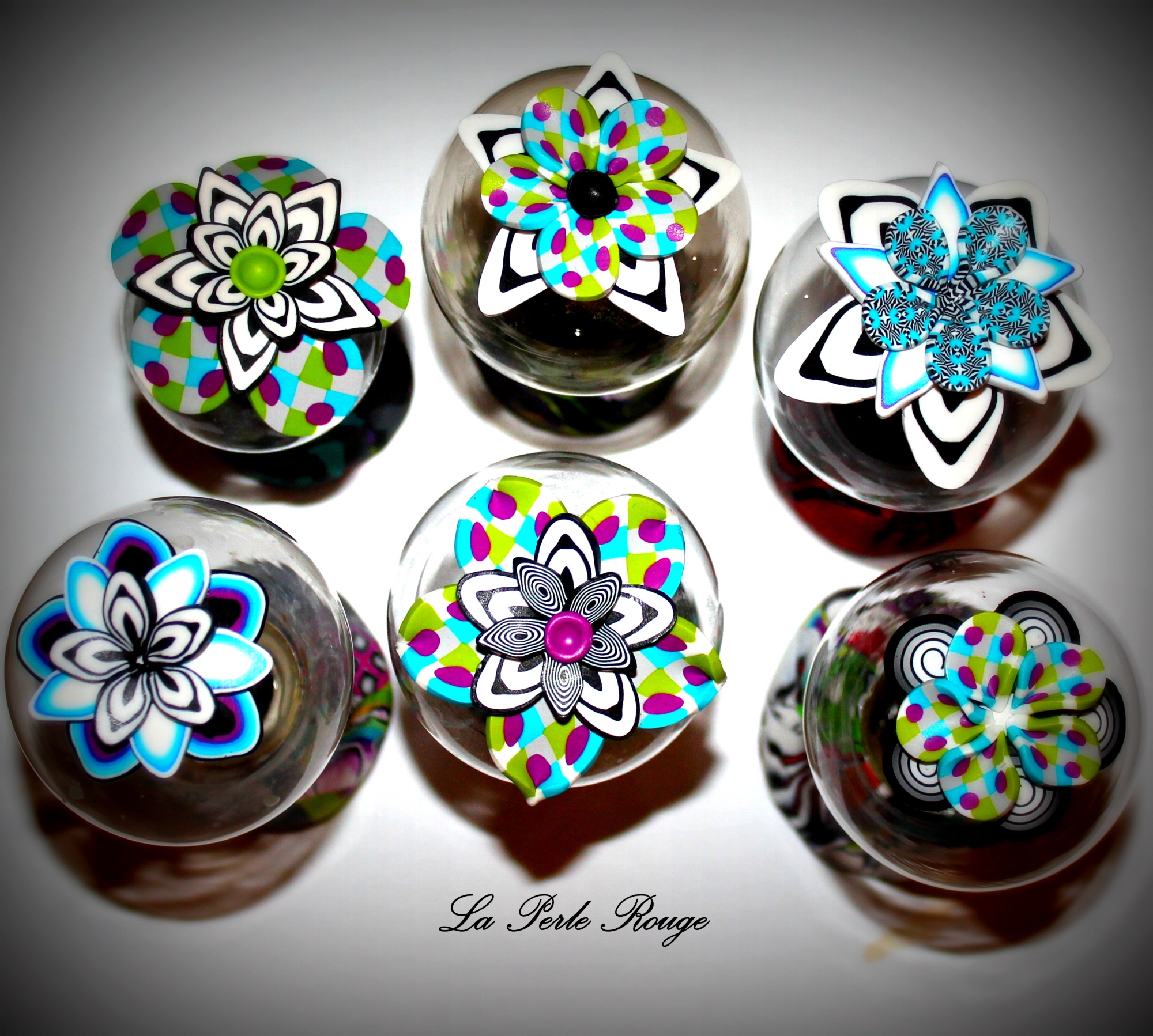 Comme j’avais envie de fabriquer des perles très fines, j’optai, cette fois pour un montage plus classique avec des anneaux. Habituellement, lorsque je choisis de faire ce type de perles, je les cuis sur… mon petit aquarium… enfin, feu, mon petit aquarium. Ni une, ni deux, cela me pris comme une envie de… passer à autre chose et me voilà dans ma voiture à courir les animaleries autour de chez moi à la recherche de mon support de cuisson. Et bien, ça n’est vraiment pas facile de trouver un aquarium boule aussi petit… tellement pas facile que je suis revenue chez moi avec celui-ci (à gauche), il faudra que je demande à mon ami Enora où elle avait trouvé le premier.