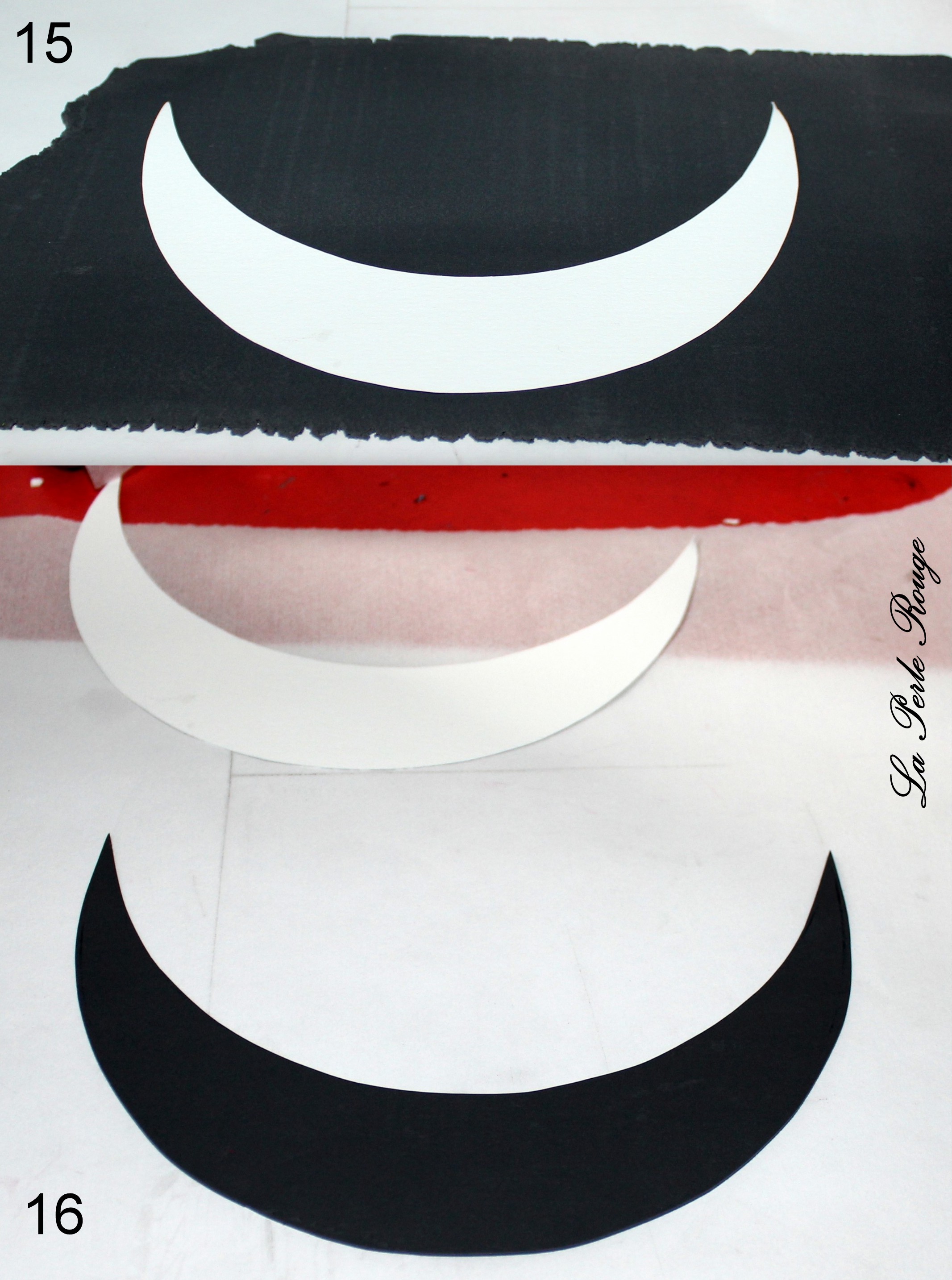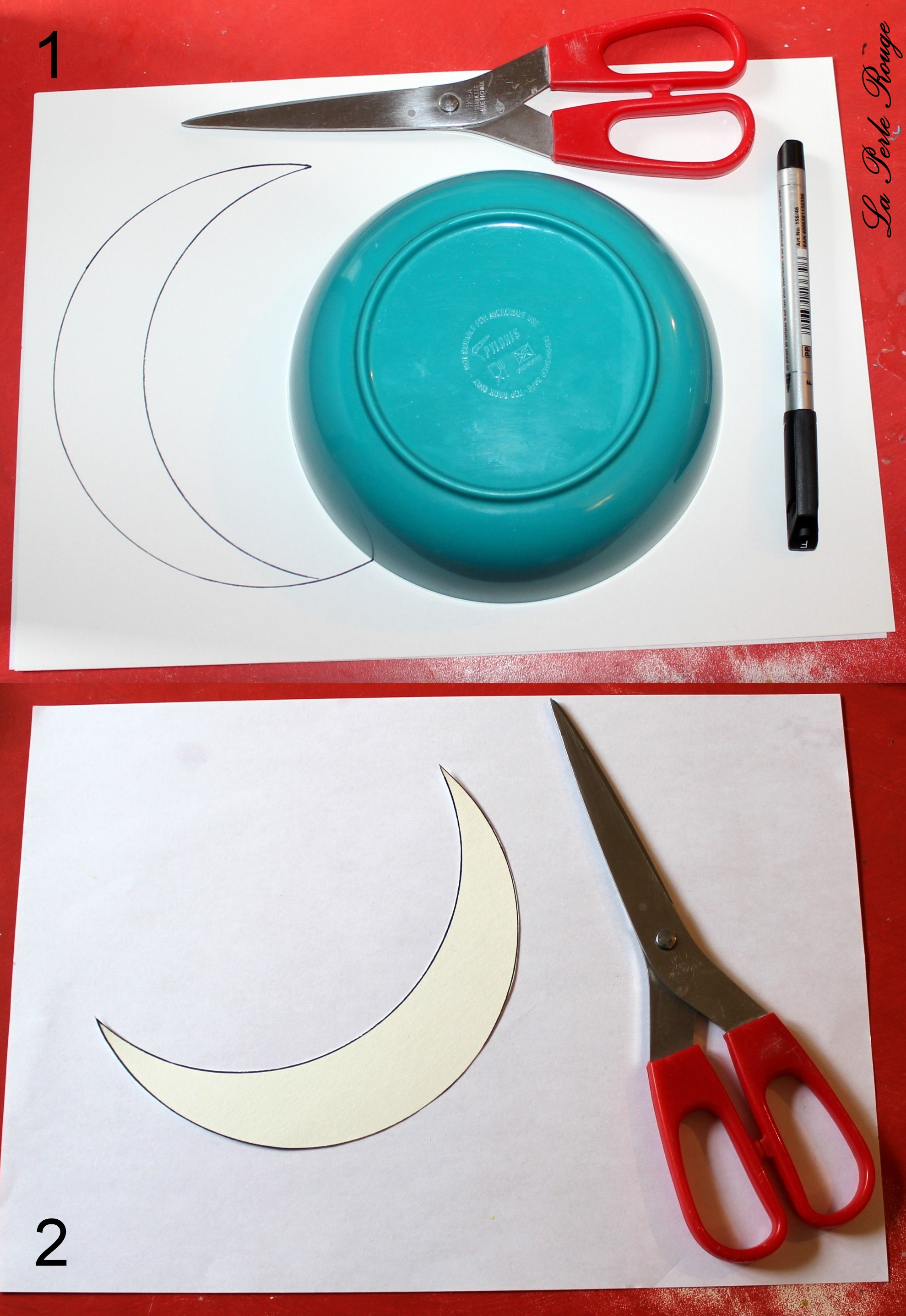 Photos 1 et 2 : Sur une feuille de papier canson, tracez les contours de votre gabarit en forme de lune à l’aide d’un petit saladier ou d’un bol large (Il s’agit, pour ma part, de l’assiette de mon bébé) et découpez la forme.