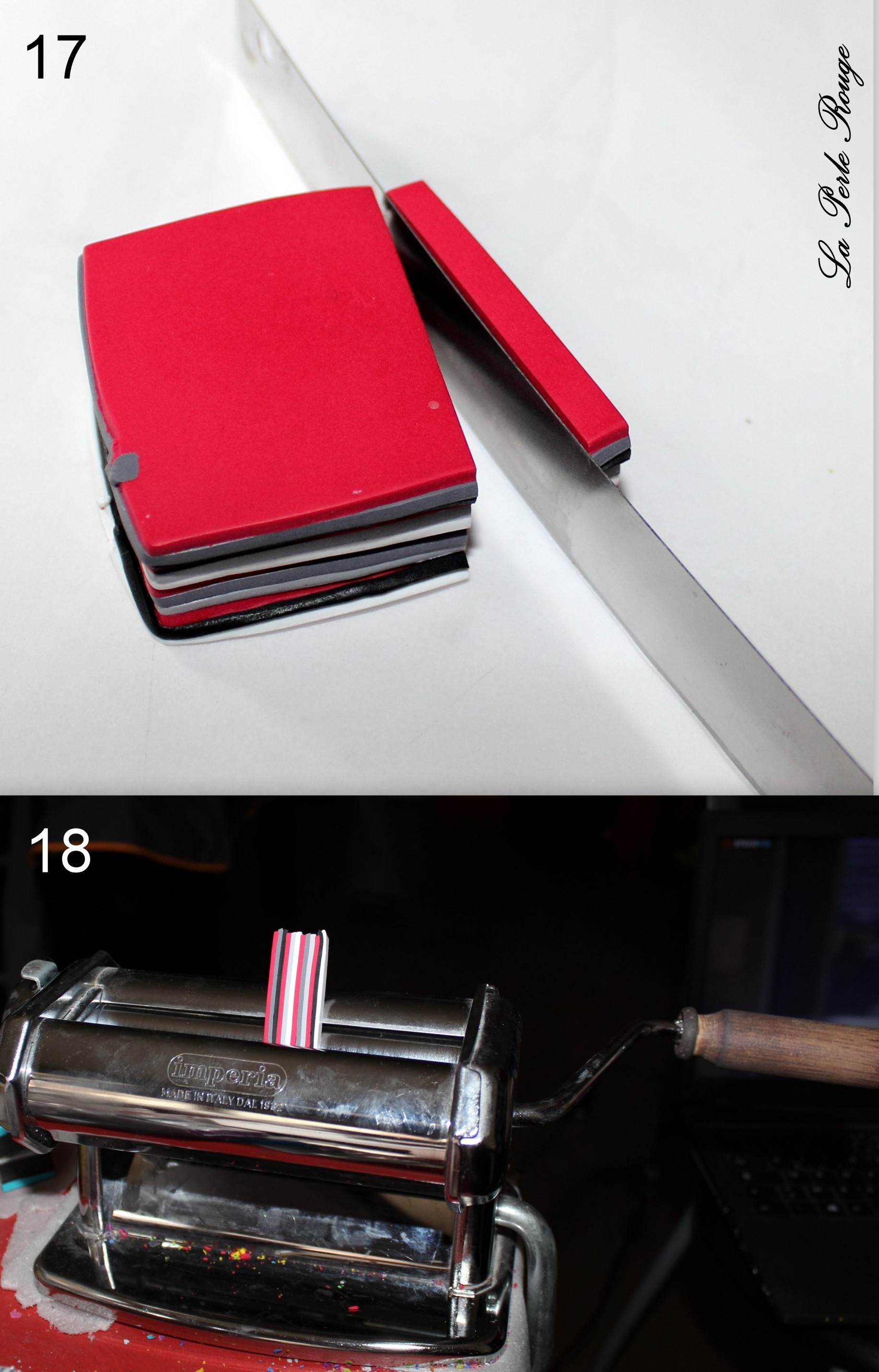 Photos 17 et 18 : Coupez des tranches dans le bloc rayé. Si vous avez du mal à obtenir des tranches fines et régulières, n’ayez pas peur de réaliser des tranches un peu épaisses et passez-les doucement dans la machine à pâte au réglage 3.
