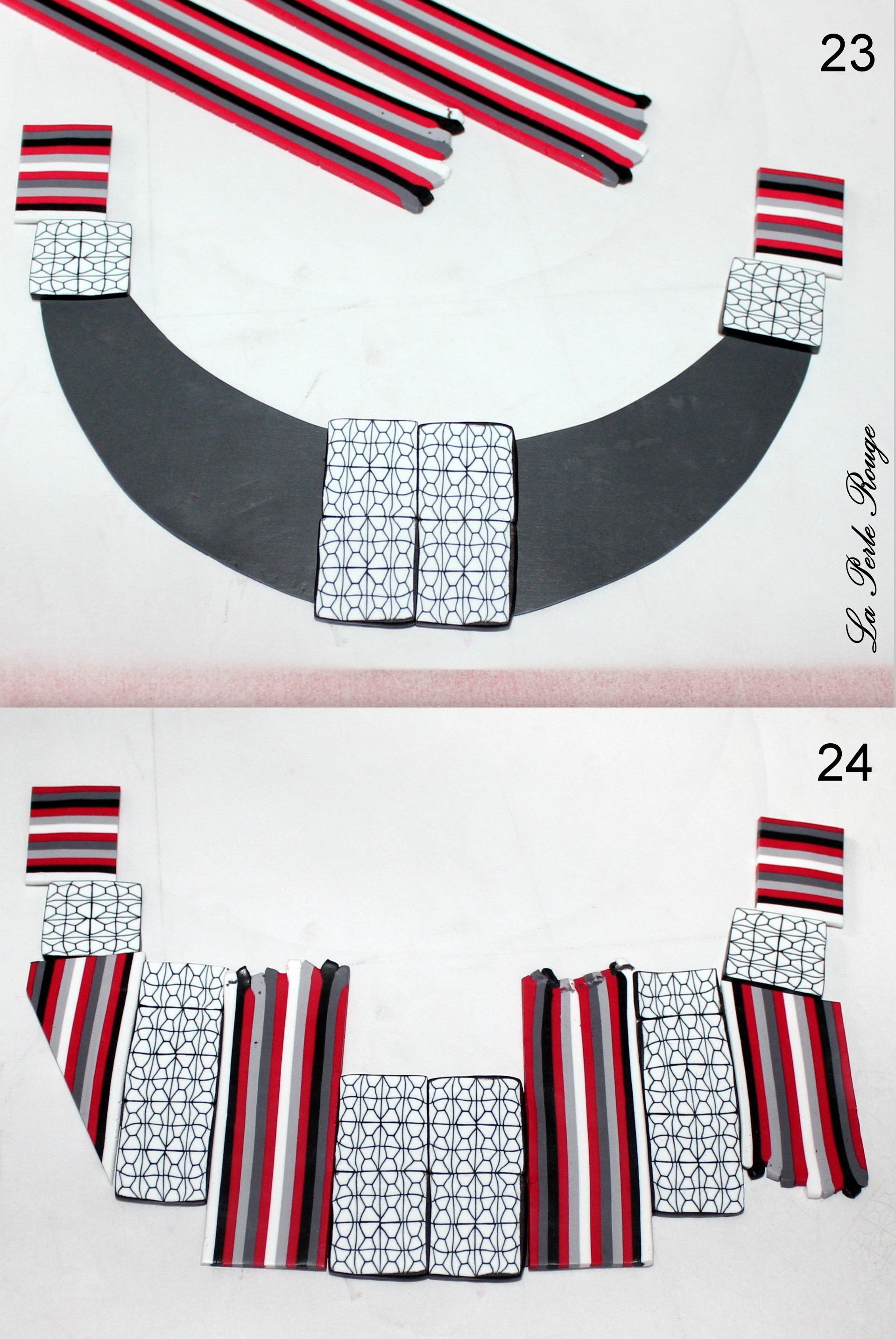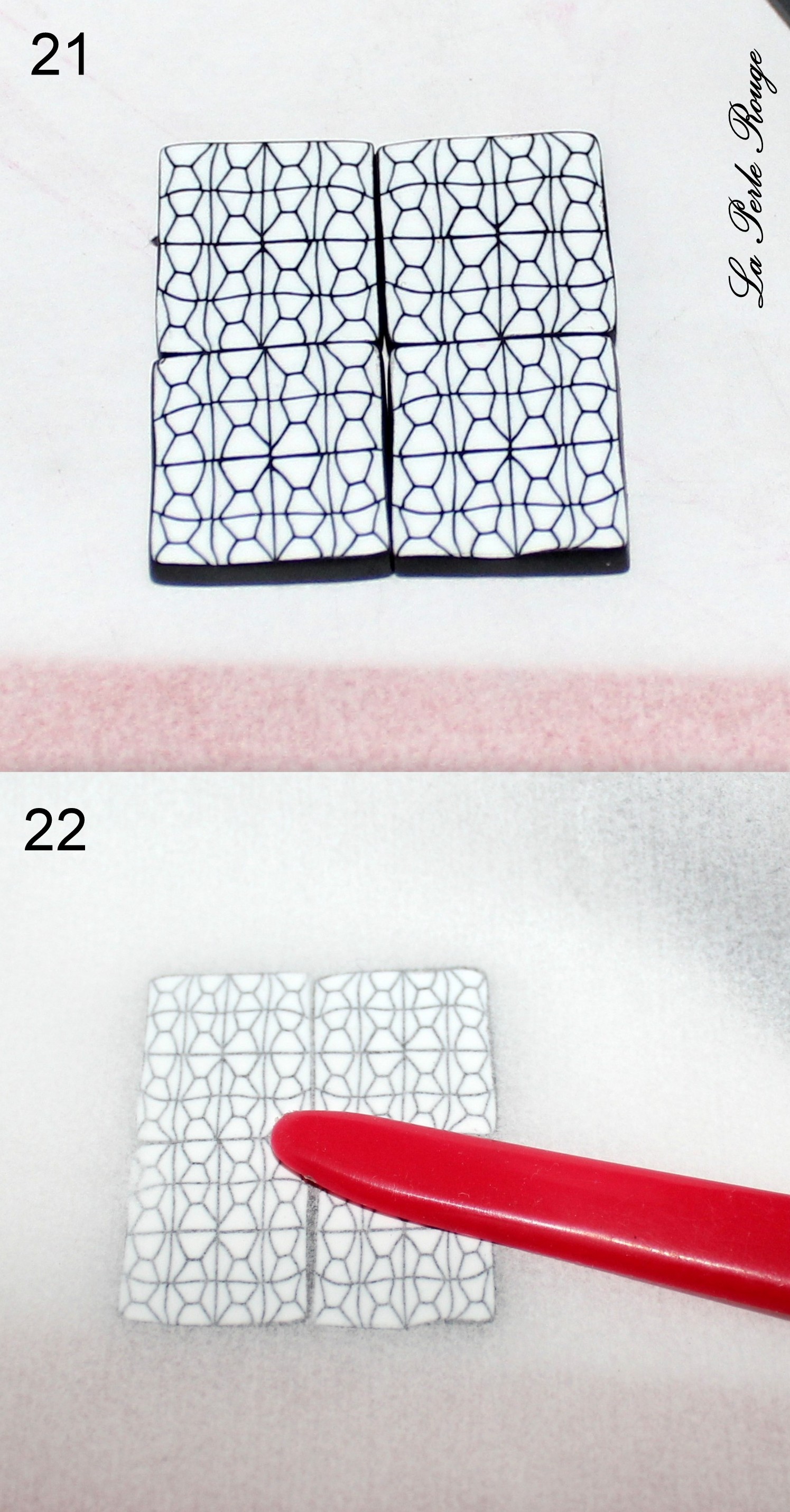Photos 21 et 22 : Préparez le motif central du collier en assemblant 4 tranches de la cane géométrique et lissez l’ensemble à travers du papier sulfurisé.