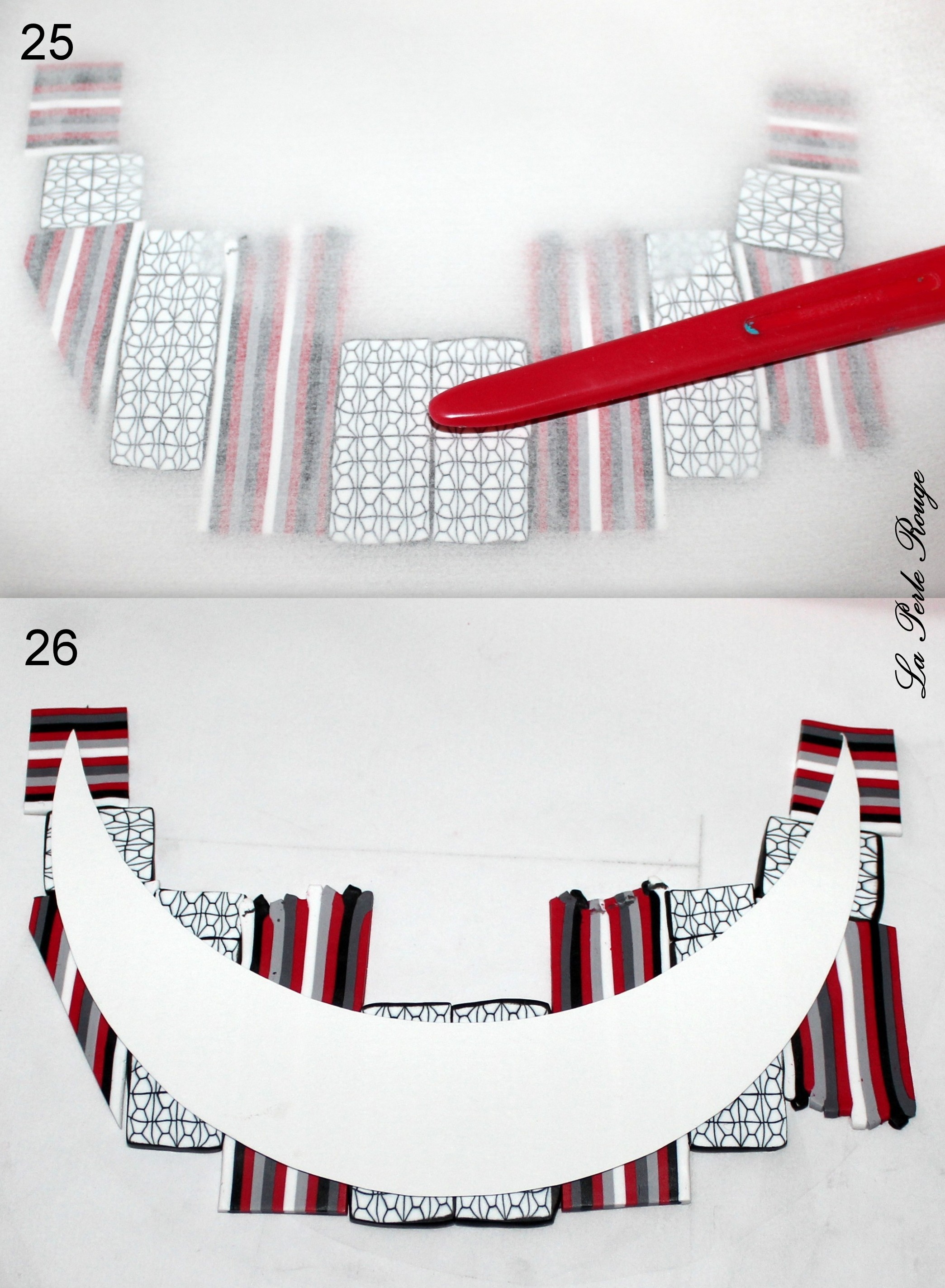 Photos 25 et 26 : Lissez bien l’ensemble à travers du papier sulfurisé. Aidez-vous d’un rouleau et d’un outil de lissage mais faites surtout bien attention à ne pas appuyer trop fort où vous risquez de tout déchirer au moment de décoller le papier. Il est plus sûr de procéder en plusieurs étapes et lisser une première fois, de décoller le papier de la pâte, de retourner le papier et de lisser de nouveau. Une fois que c’est fait, posez de nouveau votre gabarit et découpez le plastron.
